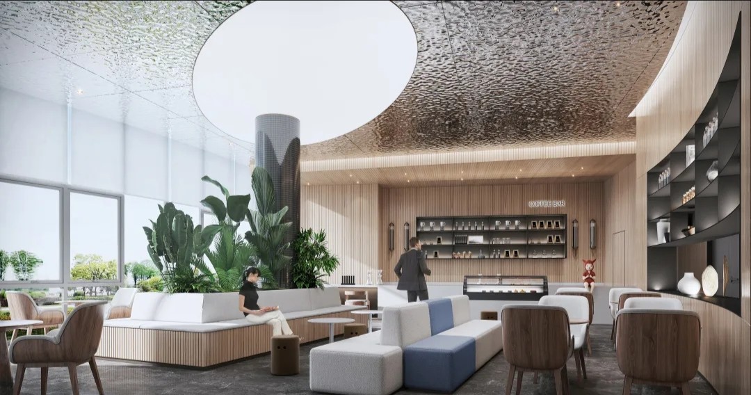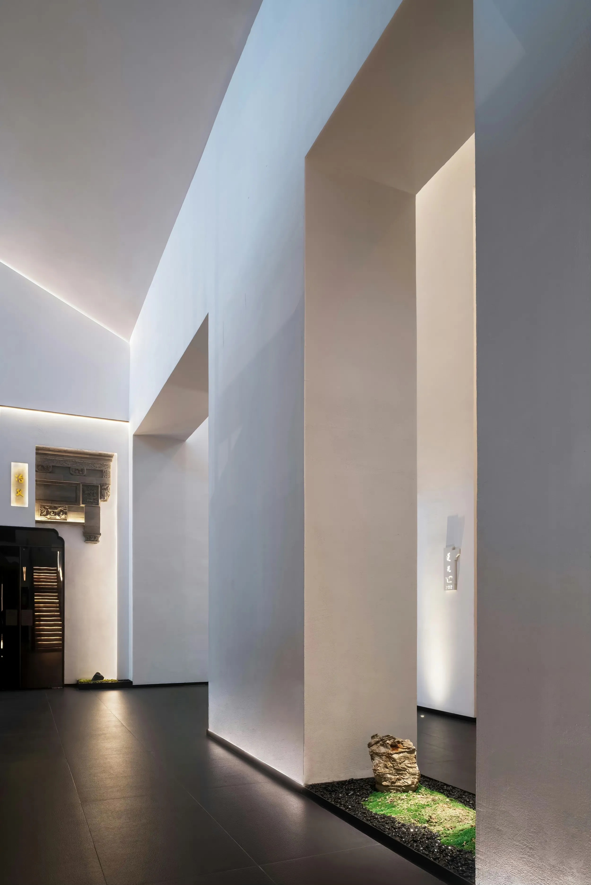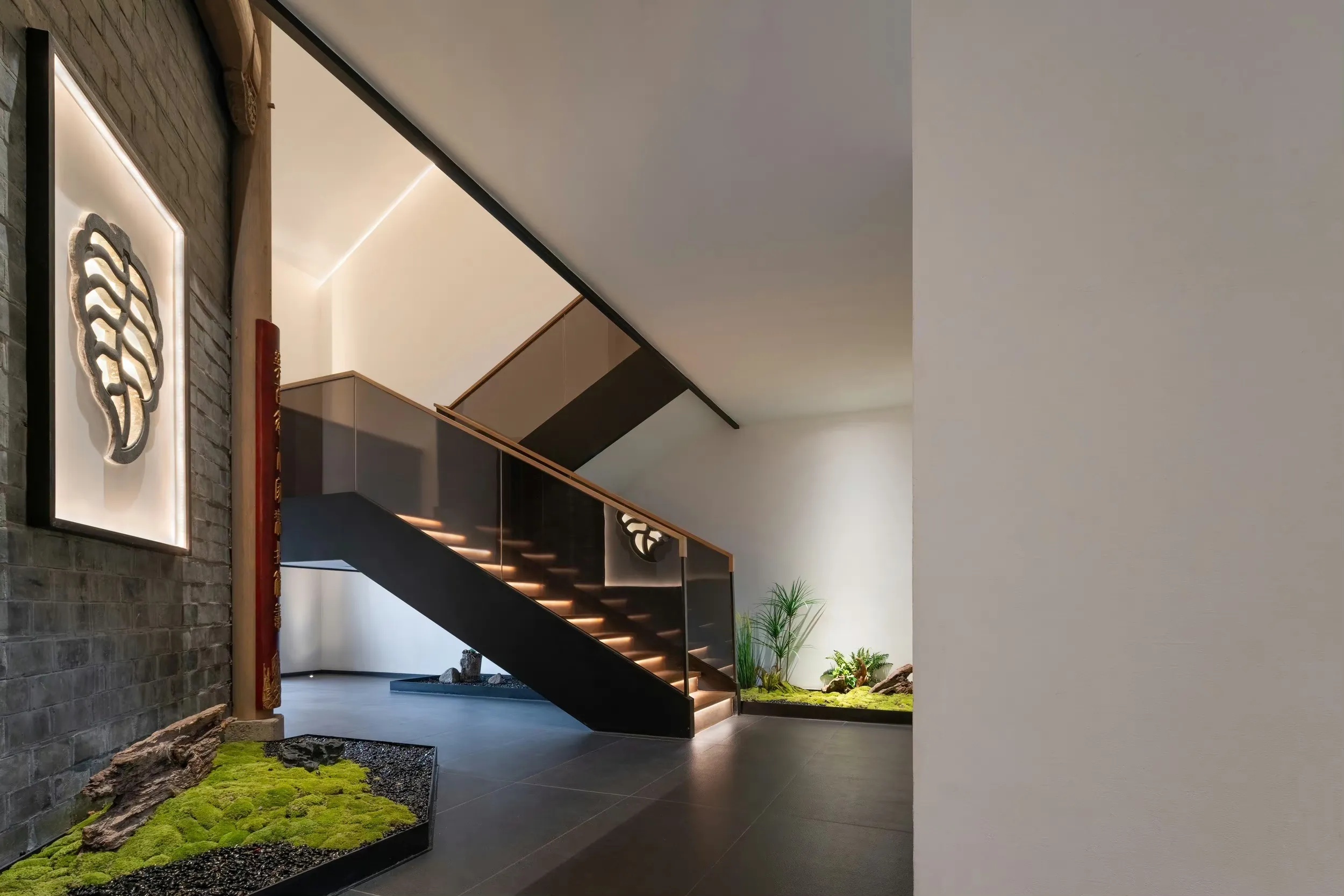 天圆地方彰显出空间的格局,木色的墙面与地面生态环保,搭配盎然绿植彰显生机活力。