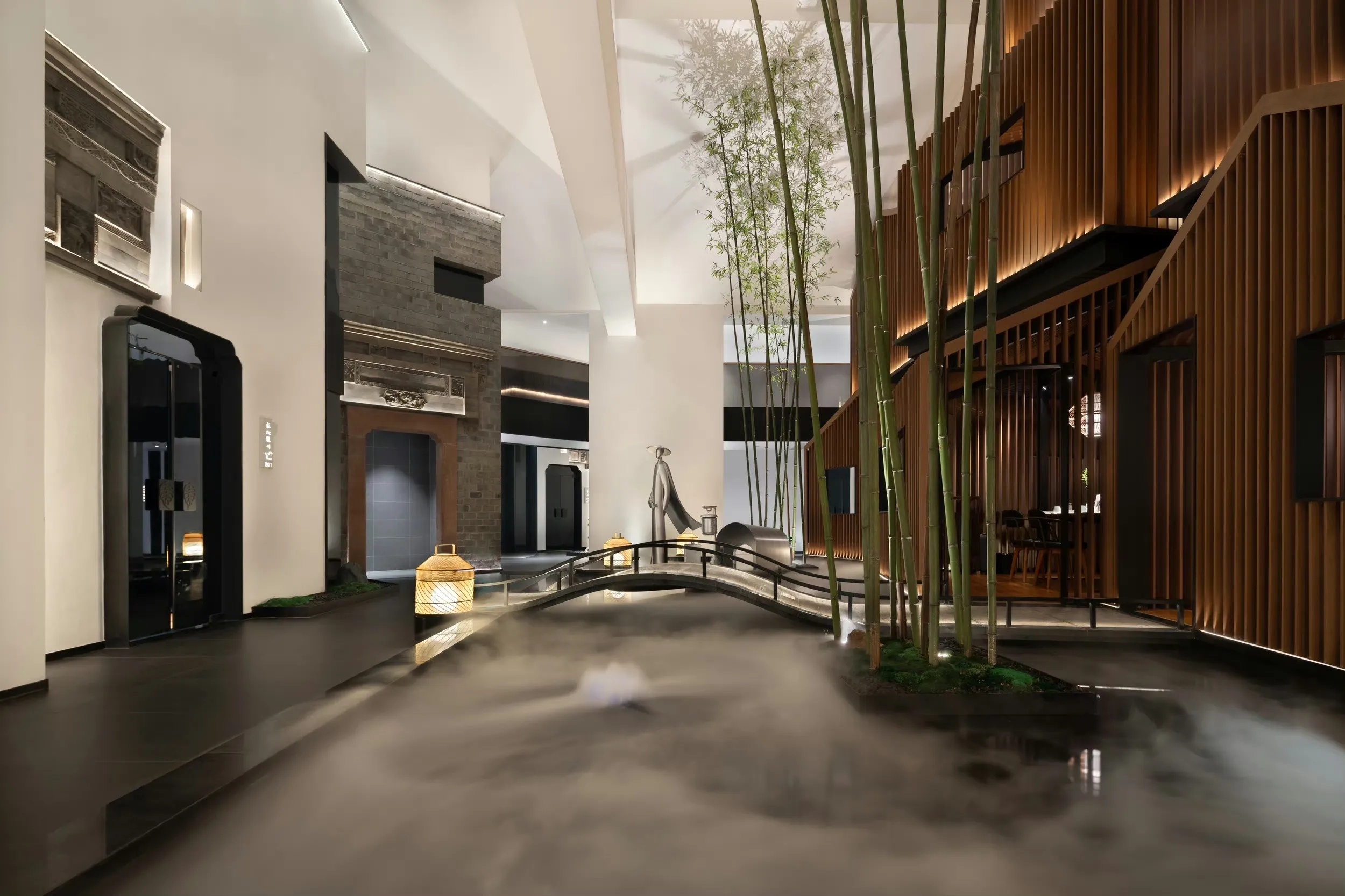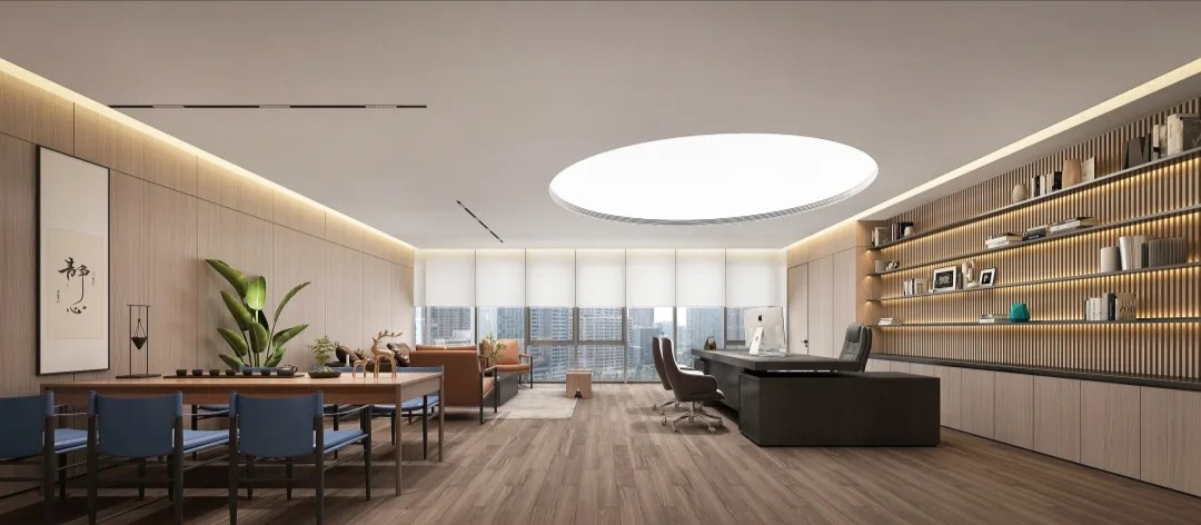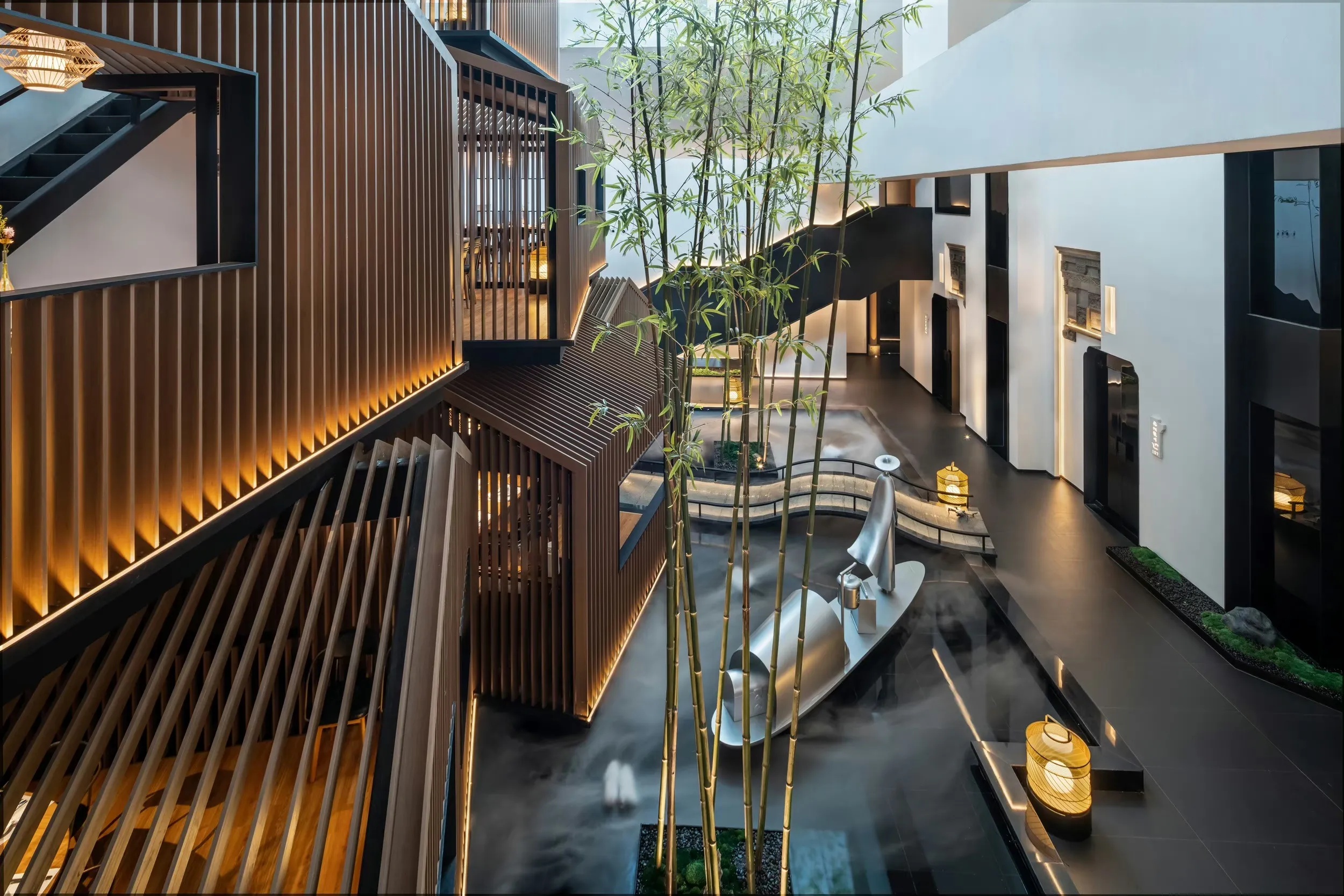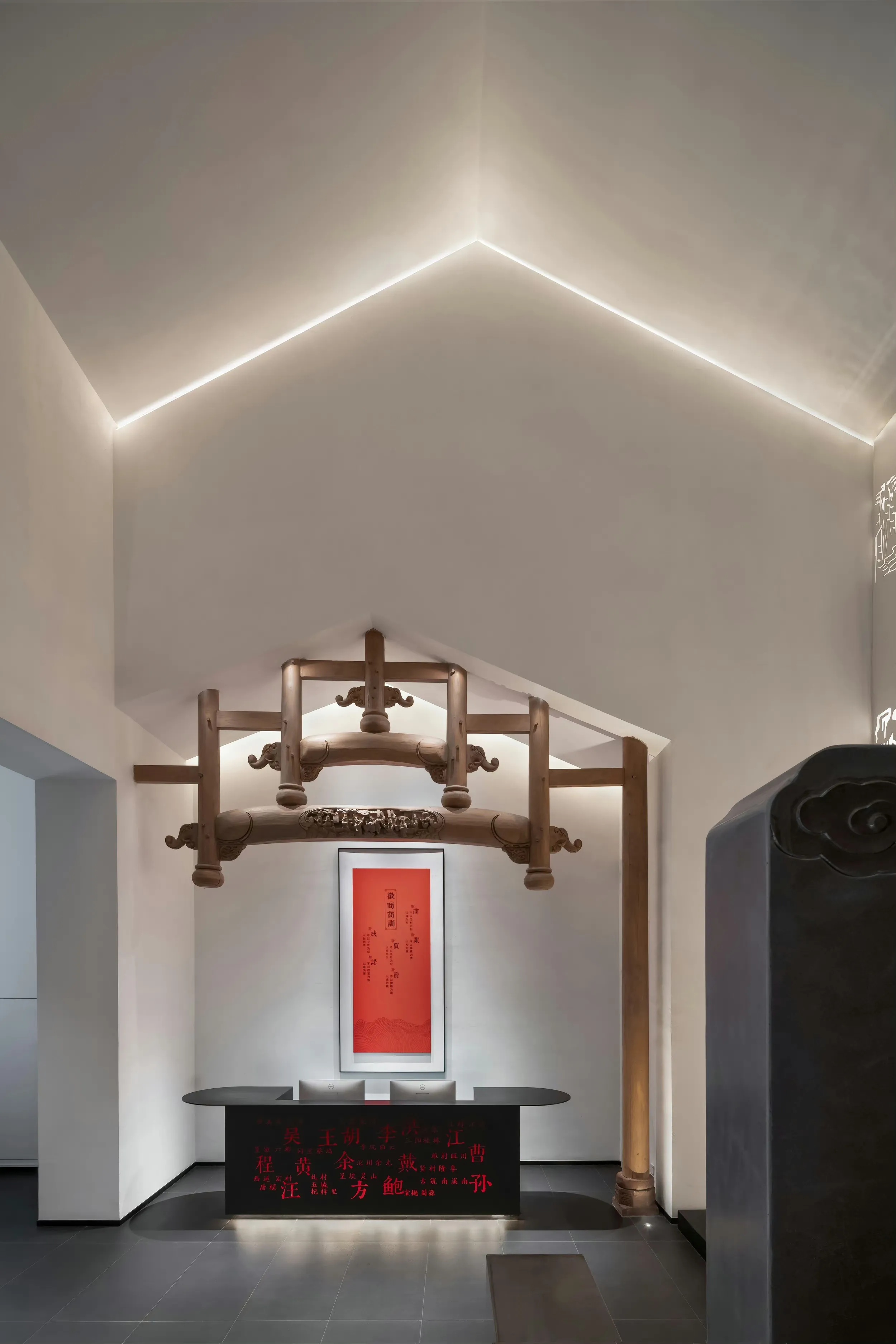 天圆地方彰显出空间的格局,木色的墙面与地面生态环保,搭配盎然绿植彰显生机活力。