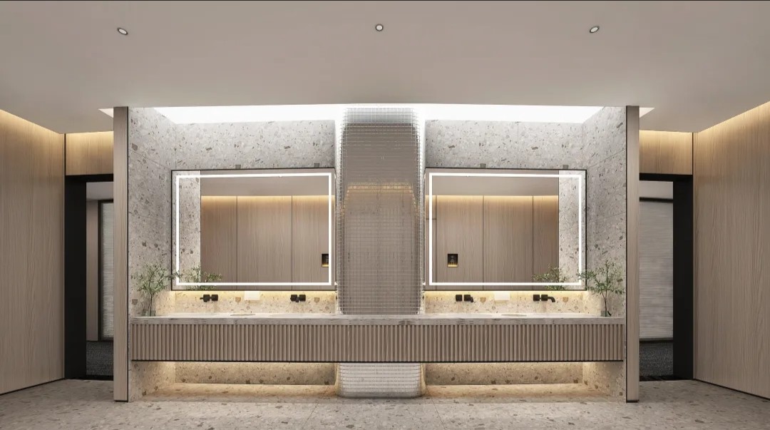 整体色调简洁明快,镜子与镜面马赛克的结合使空间具有科技感。