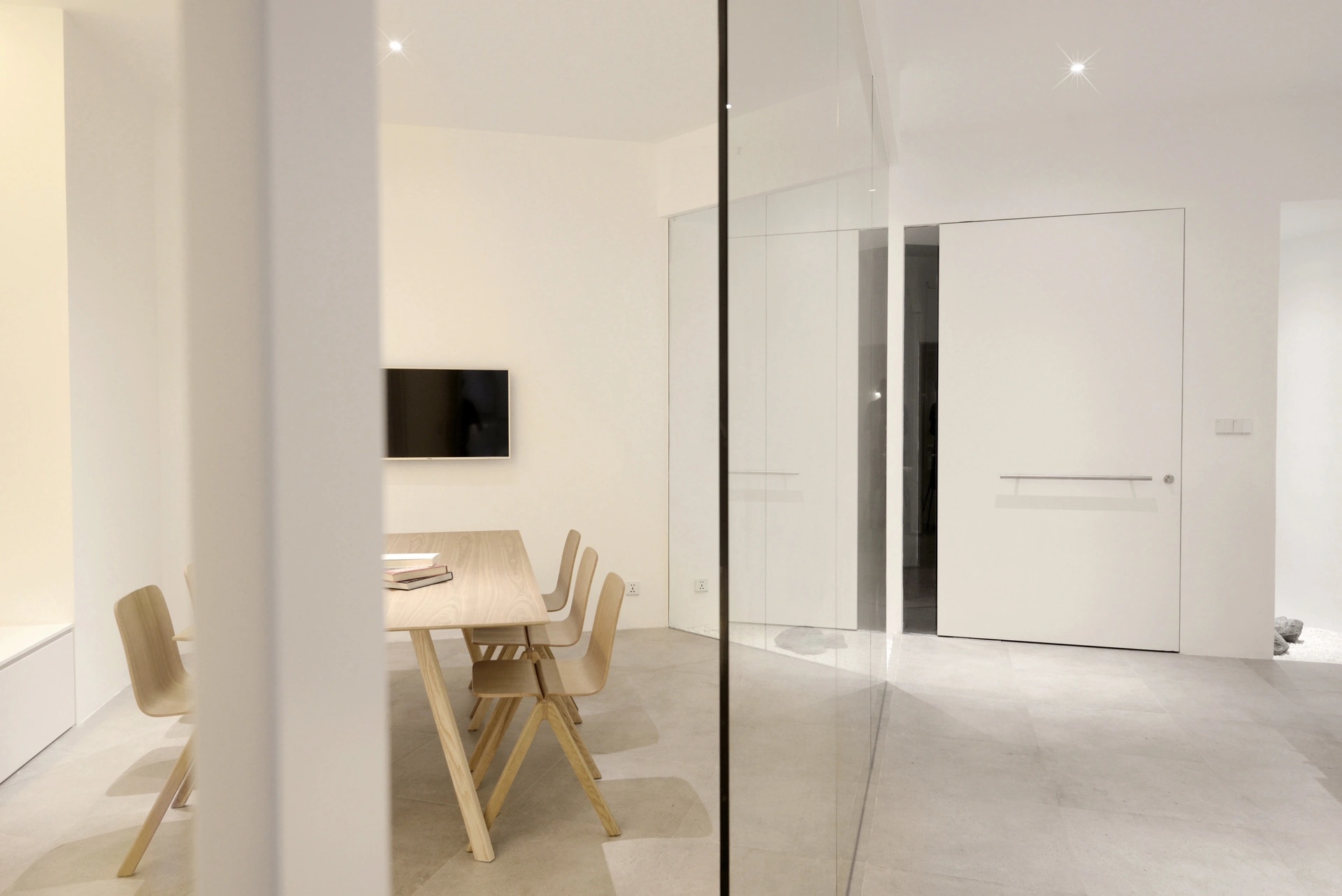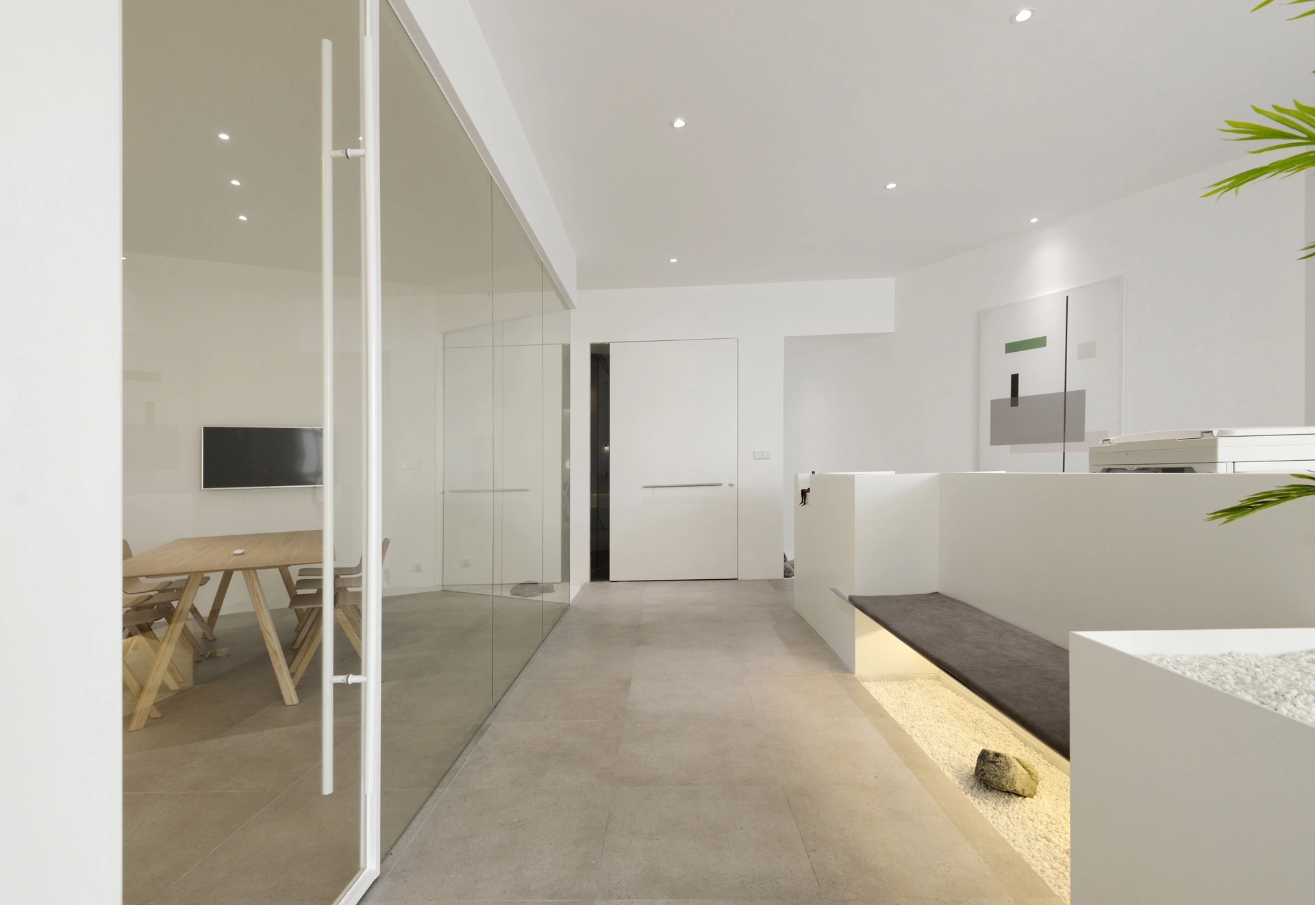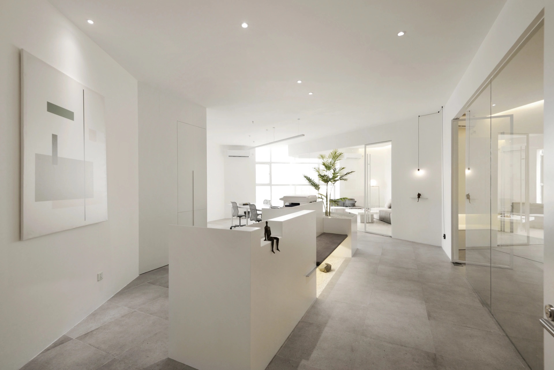 空间体验的核心并不是一面墙体带来视觉冲击,也不是单个物件的拆分呈现,而是一个由六个面组合而成的多面体空间带来的多方位感官体验。用物质上的“少”,去寻求精神上的“多” ,即是人对自然的敬畏,也是一种含蓄的精神气质体现,印证禅学“无即是有”,打造永恒的现代主义都市禅意空间。