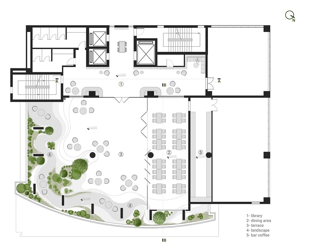 空间设计分为两部分,室外部分有休闲花园、餐饮区,以及为小组讨论或无酒派对提供的聚会场所,室内部分包括阅读、娱乐、员工住宿和餐饮等区域。自然光透过混凝土板照射在地面上形成一道道平行的阴影,隐喻了一种理念。