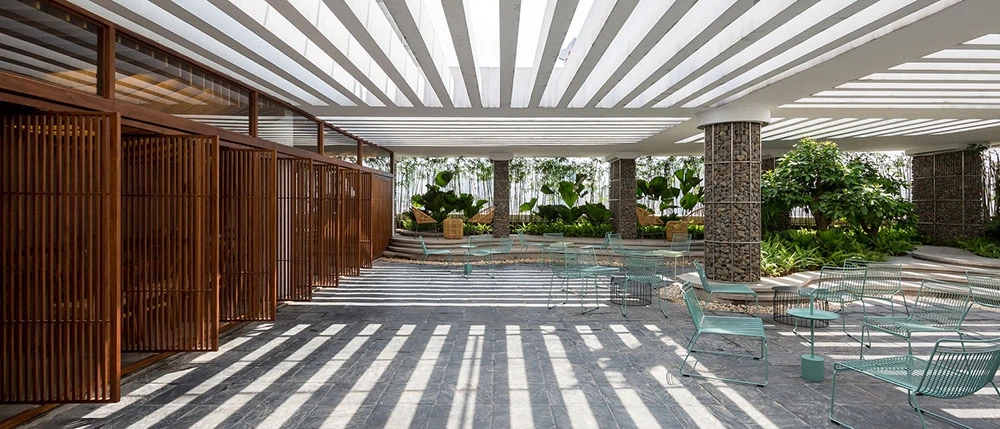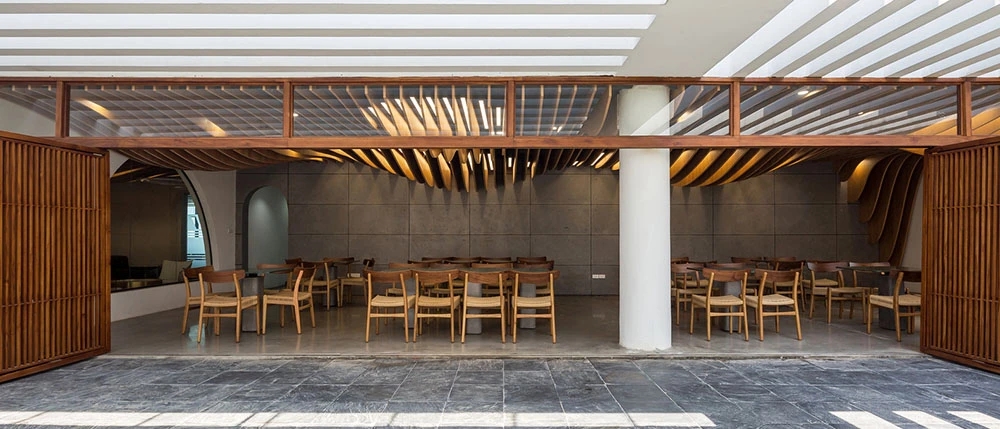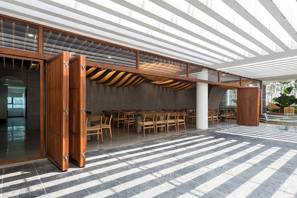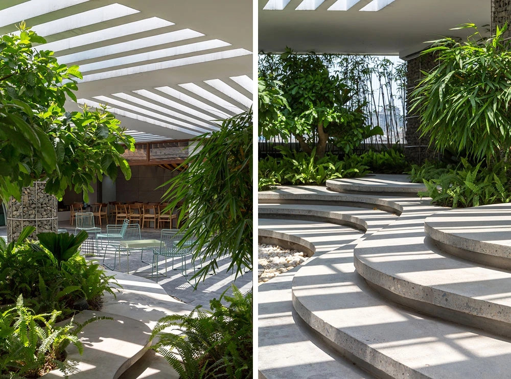 在室外,现有的基础设施无法构成花园空间,但是,建筑师通过对某块区域增高地面,打造不规则轮廓线来形成一个新的功能区。建筑师同样选择了当地的绿竹,与公司品牌颜色和一层大堂设计相呼应。以漂浮为概念的餐饮区,在需要的时候可以轻松形成一个小舞台。