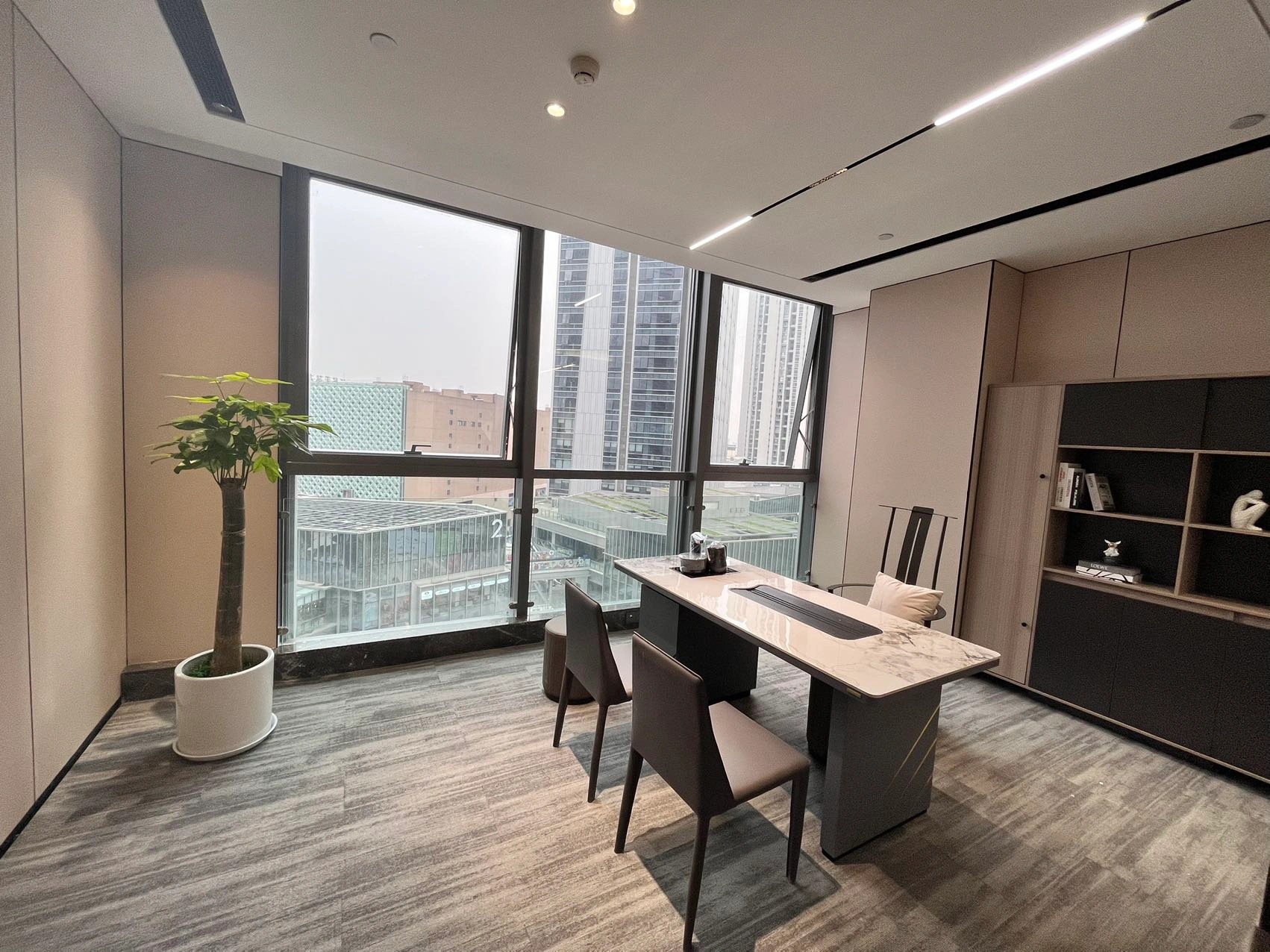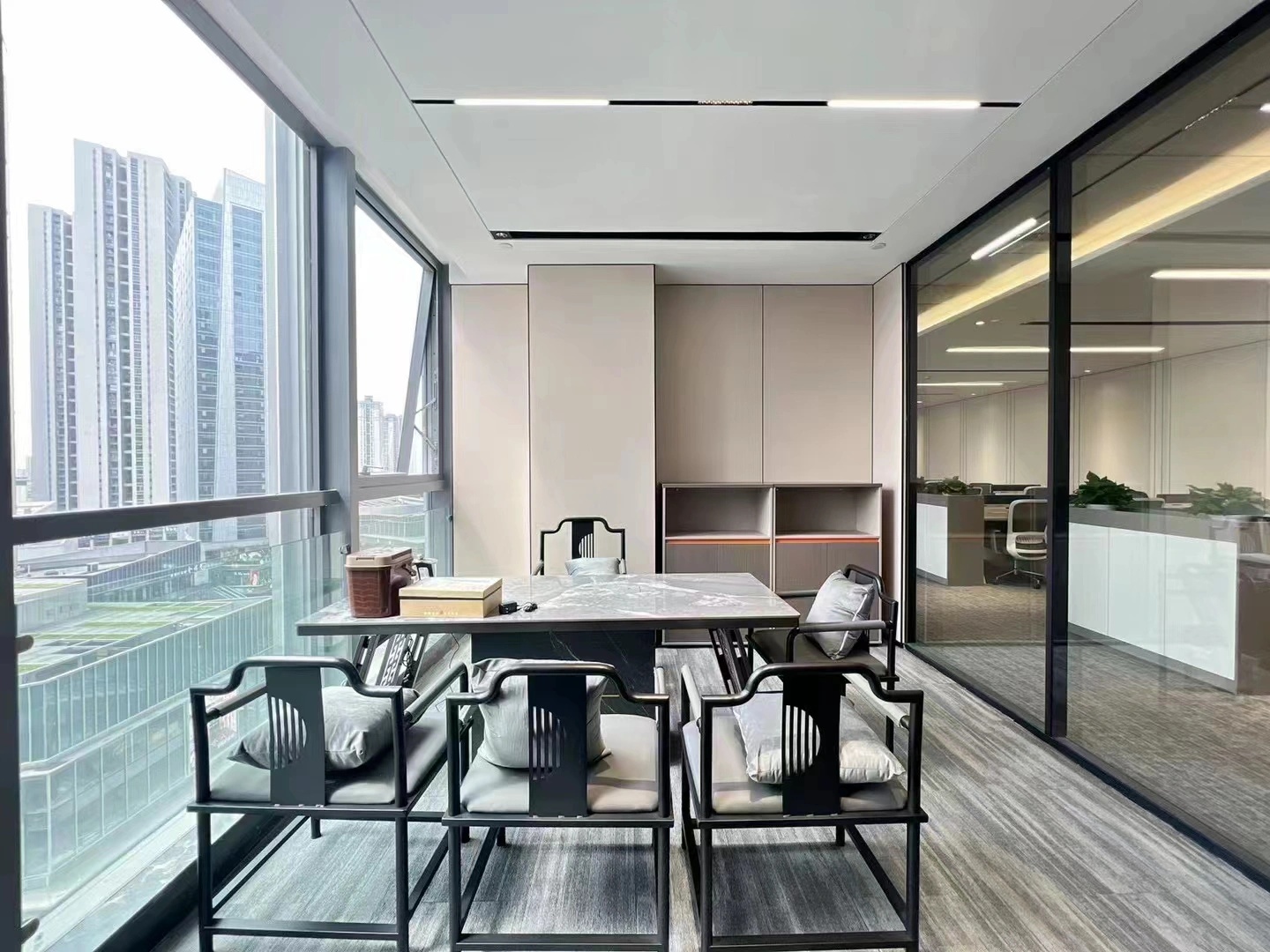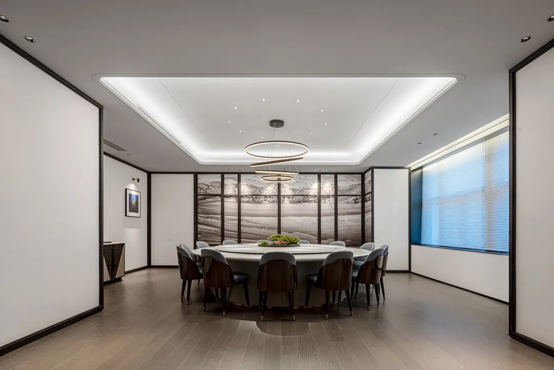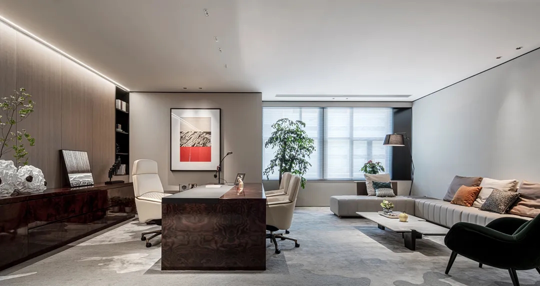 办公空间内将会客室与茶室融合,“以茶会友”,宽而长的木桌让干练的办公室多了一分质朴,使得空间的风格更具层次感,古朴的茶杯和温润的茶香为空间增添一抹禅意,引领客人在一个惬意随性的氛围中洽谈。洽谈区,暖调的灰色沙发,一抹明亮跳跃黄色,于空间中注入一丝轻松明快的氛围。