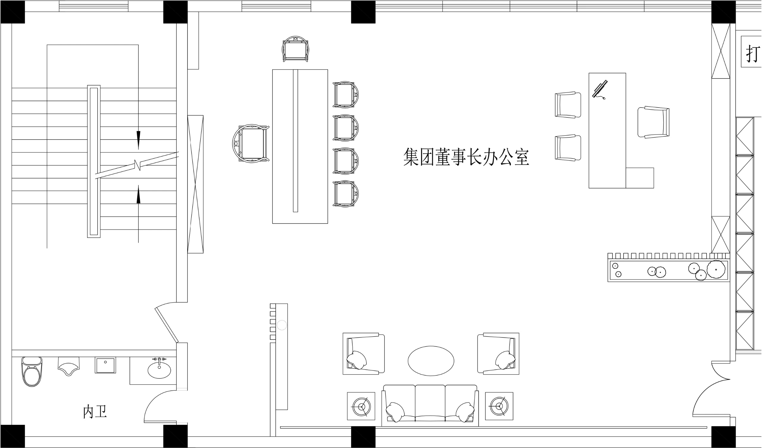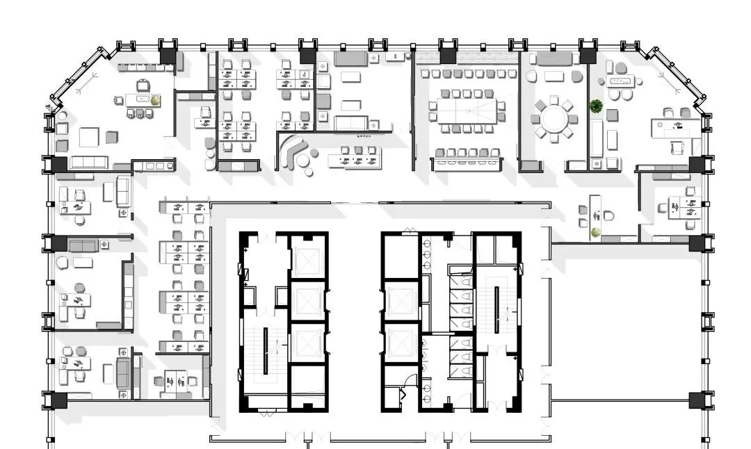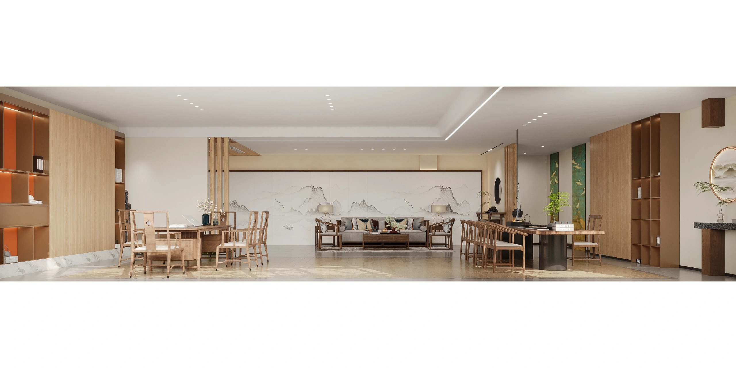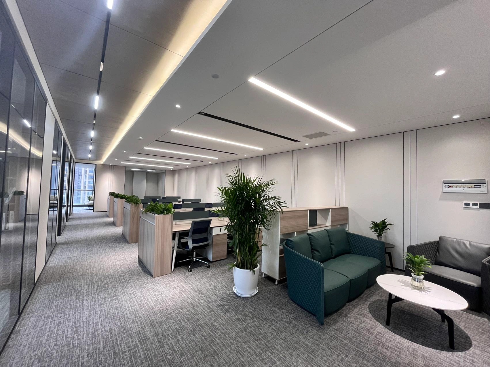 办公空间内将会客室与茶室融合,“以茶会友”,宽而长的木桌让干练的办公室多了一分质朴,使得空间的风格更具层次感,古朴的茶杯和温润的茶香为空间增添一抹禅意,引领客人在一个惬意随性的氛围中洽谈。洽谈区,暖调的灰色沙发,一抹明亮跳跃黄色,于空间中注入一丝轻松明快的氛围。
