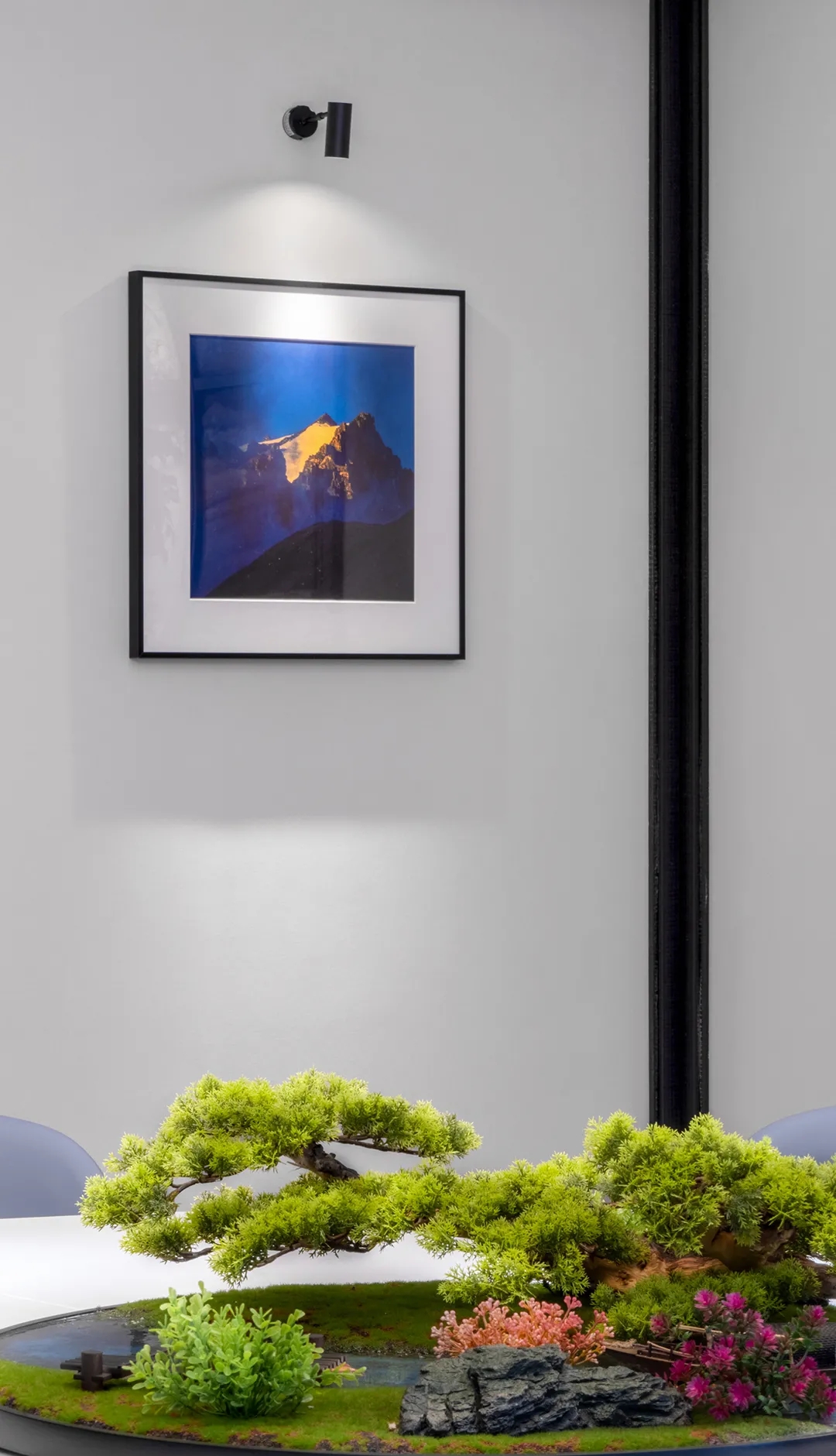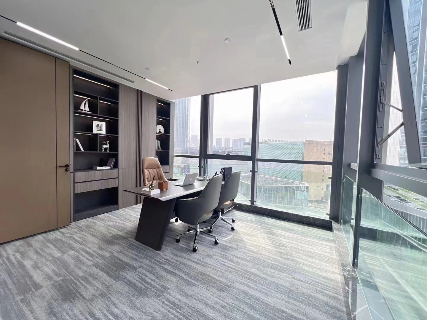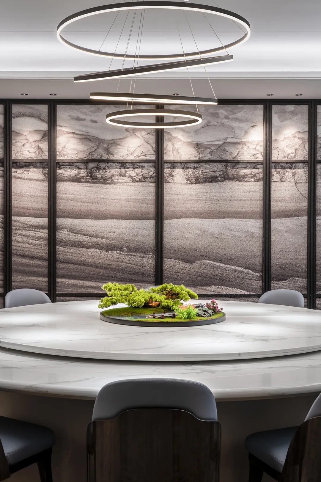 条纹地毯线条利落,充满艺术感的雕塑摆件、挂画灵动而自由,将都市生活融汇进来,使工作成为的另一种可能。