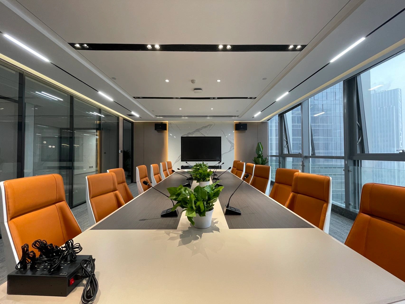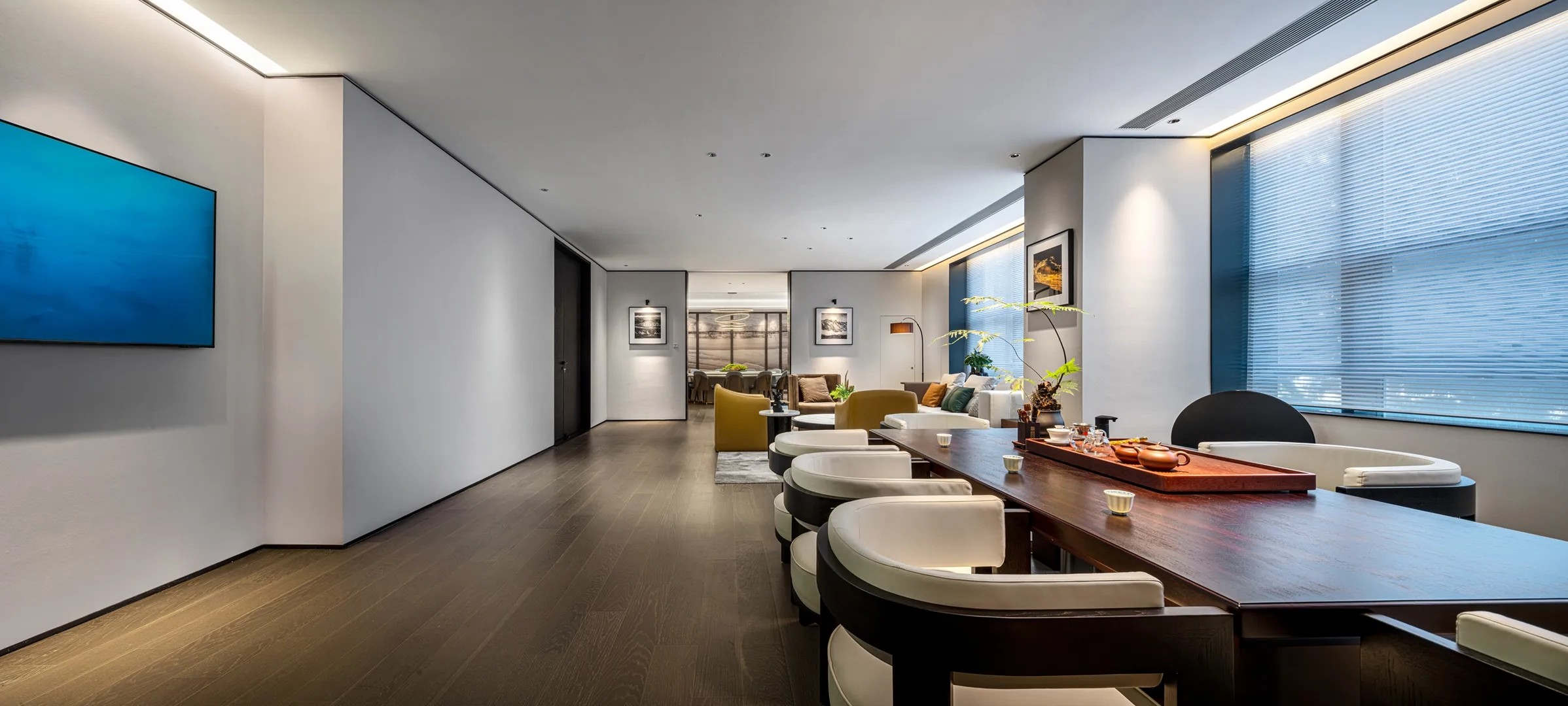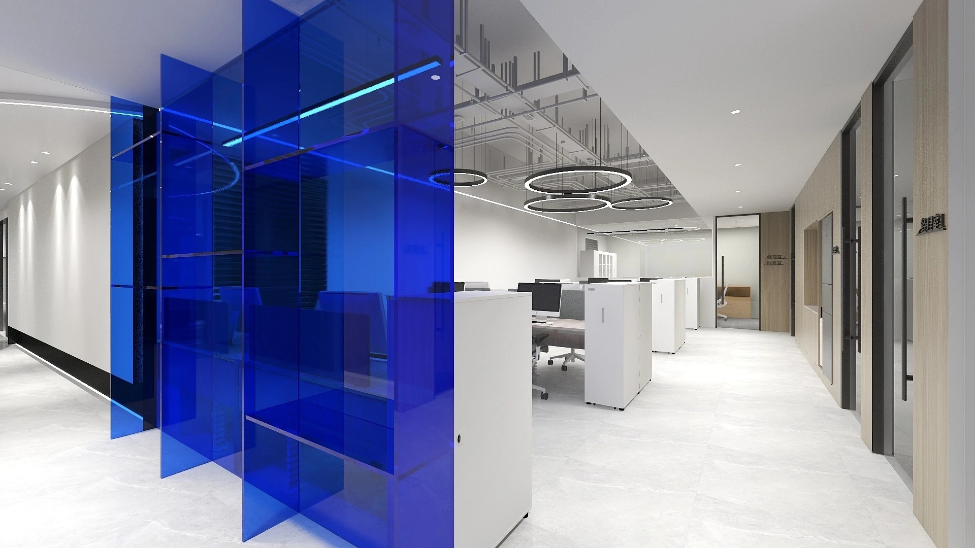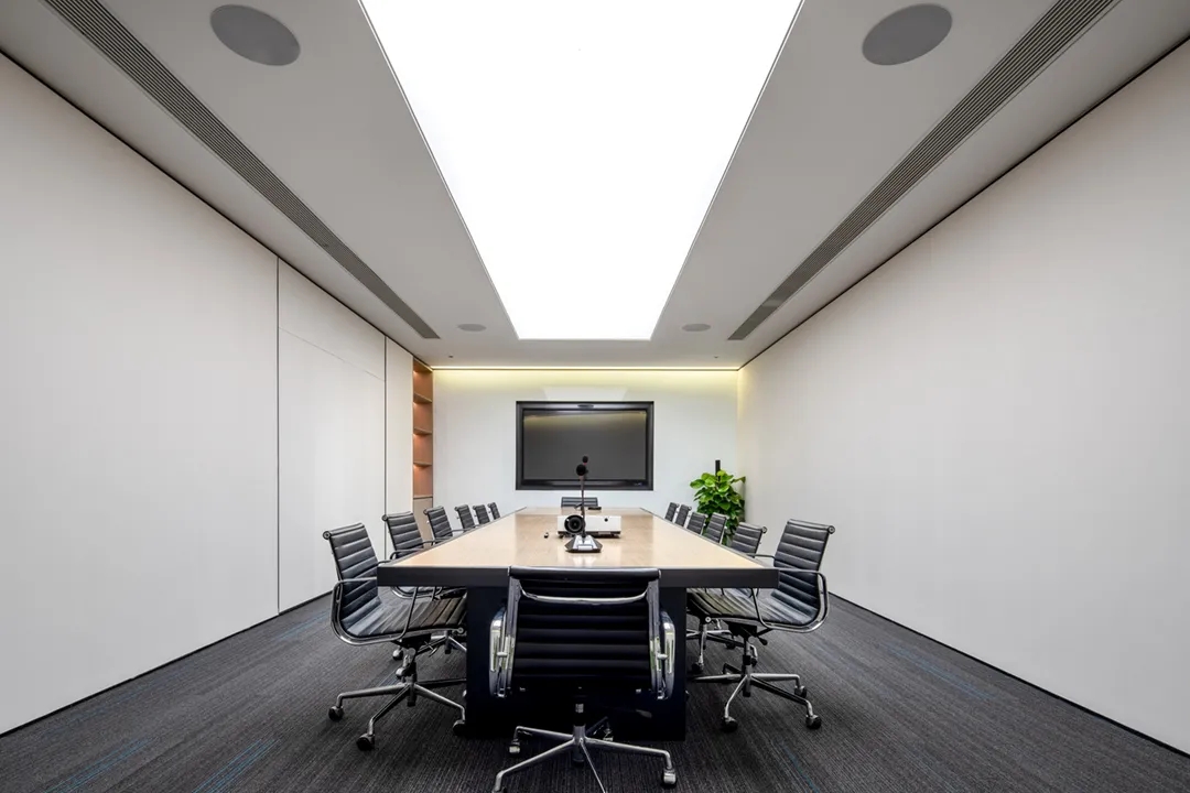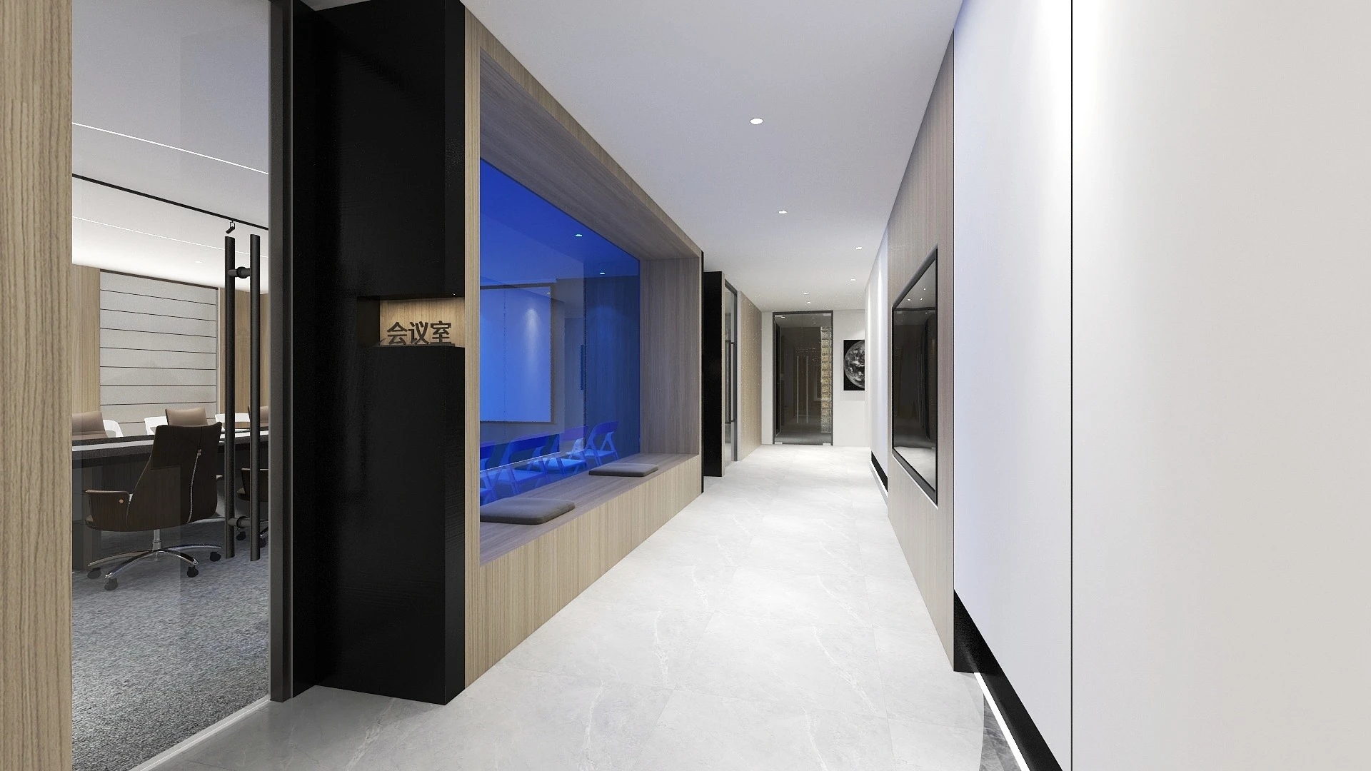 在进入会议室的走廊上,鲜明的蓝色点缀着人们日常忙碌的空间。大面积的电视屏幕在使用上增强了感官效果。覆蓝膜玻璃,呼应设计主题,视觉上提升整个空间,同时与办公区蓝色呼应,利用窗洞做休息座位,成为不错的观影区。