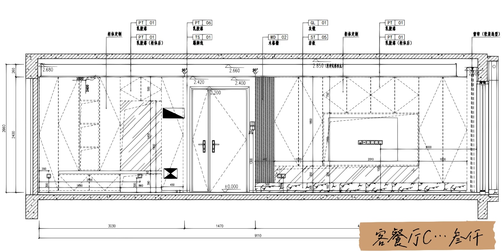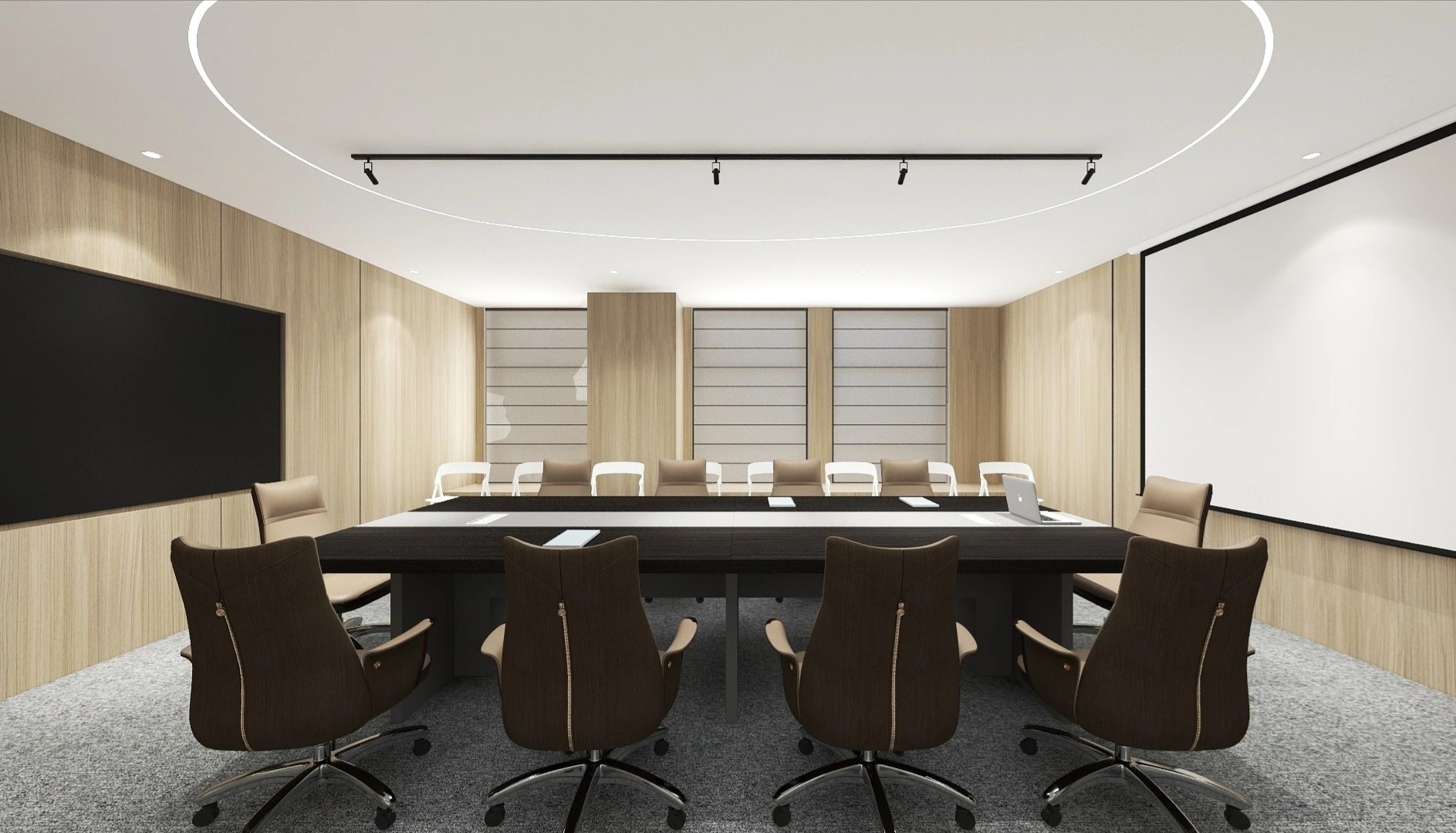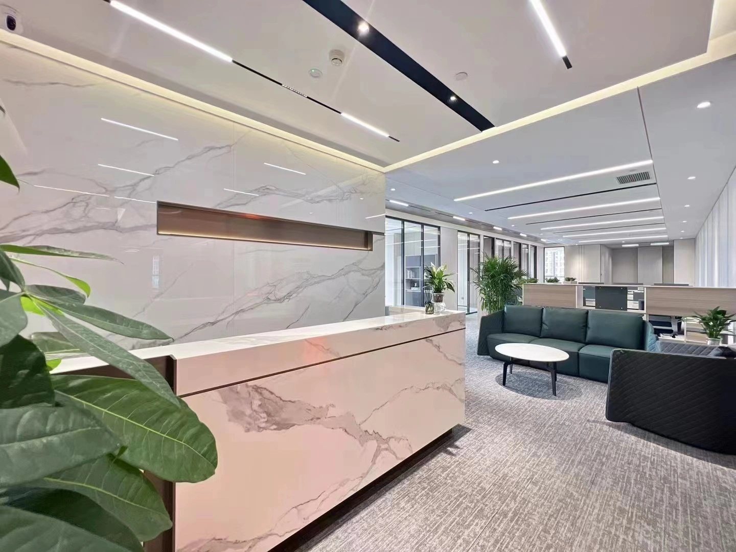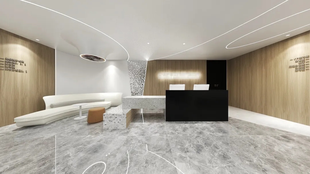 企业工作内容与环境水利相关,所以我们设计了木饰面为主的墙面处理,装饰上利用不锈钢压纹材质,引入流水概念。象征水的流线型顶面灯光,利用灯光贯穿整个大厅和走廊,增加空间联动性及现代科技感,灯光延伸至形象墙,连接水波纹不锈钢板,从墙面到地台到大理石地面,就好像瀑布飞流直下。作为局部点缀,倒火山口造型,底部设计地球灯装饰,抬头,就好像看到了世界。