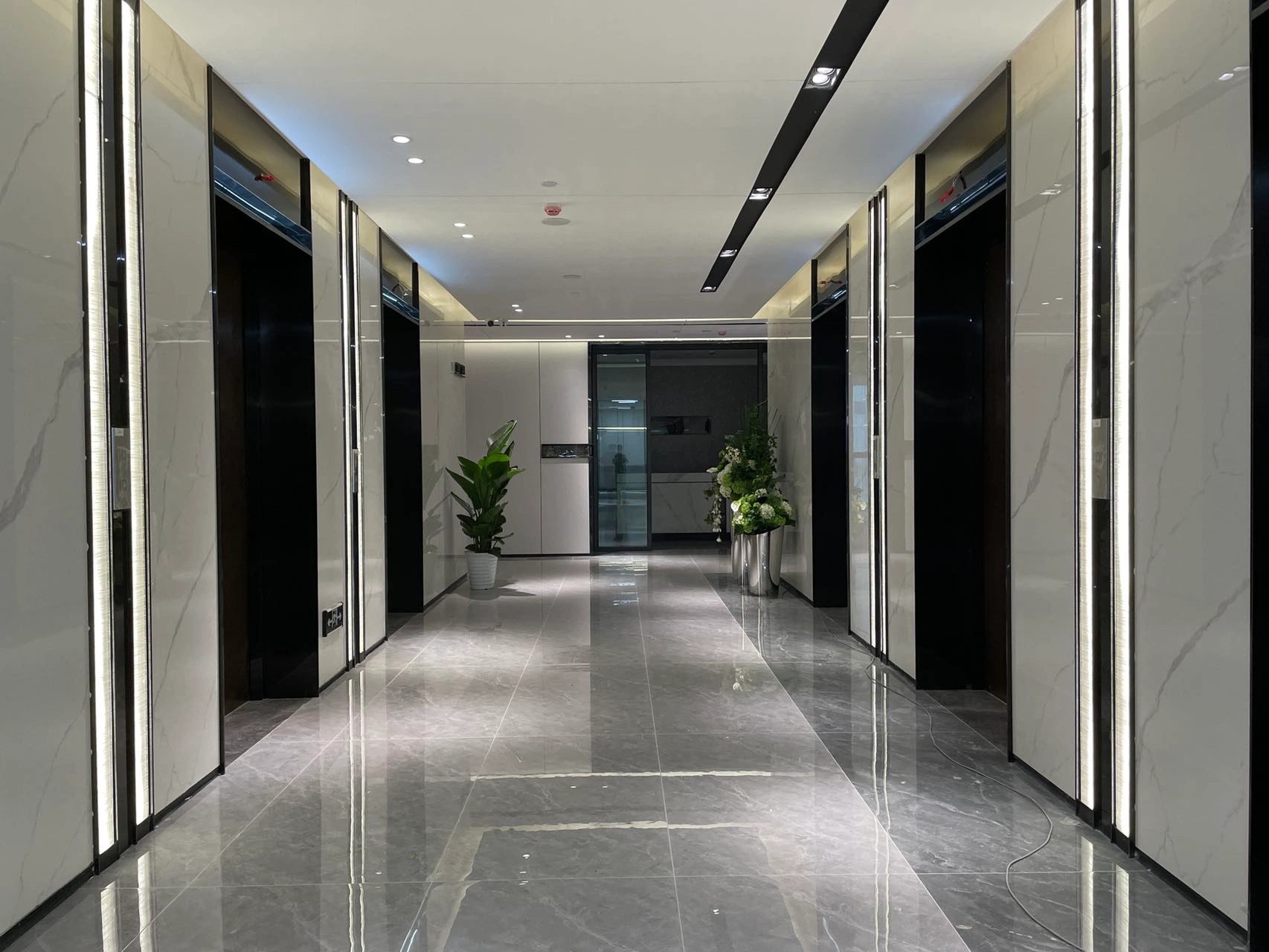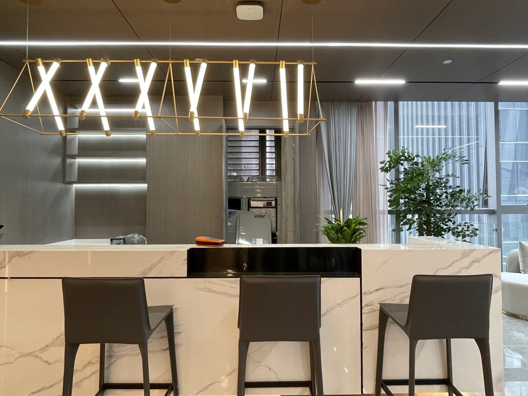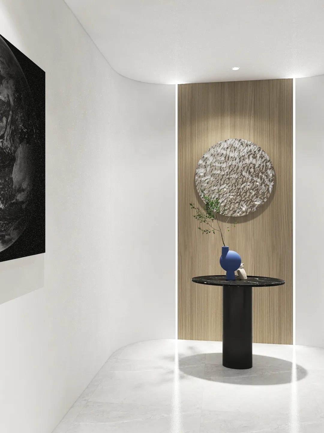 一个由大量平行直线条构成的空间入口,是从外部进入内部的链接。抛开无用且累赘的装饰,整体大空间上运用了平行的线条去叠加从不出错的黑白灰。局部的金属摆件点缀了整个空间,除了增加细节感之外,更在不经意间体现出设计上的精致和典雅。