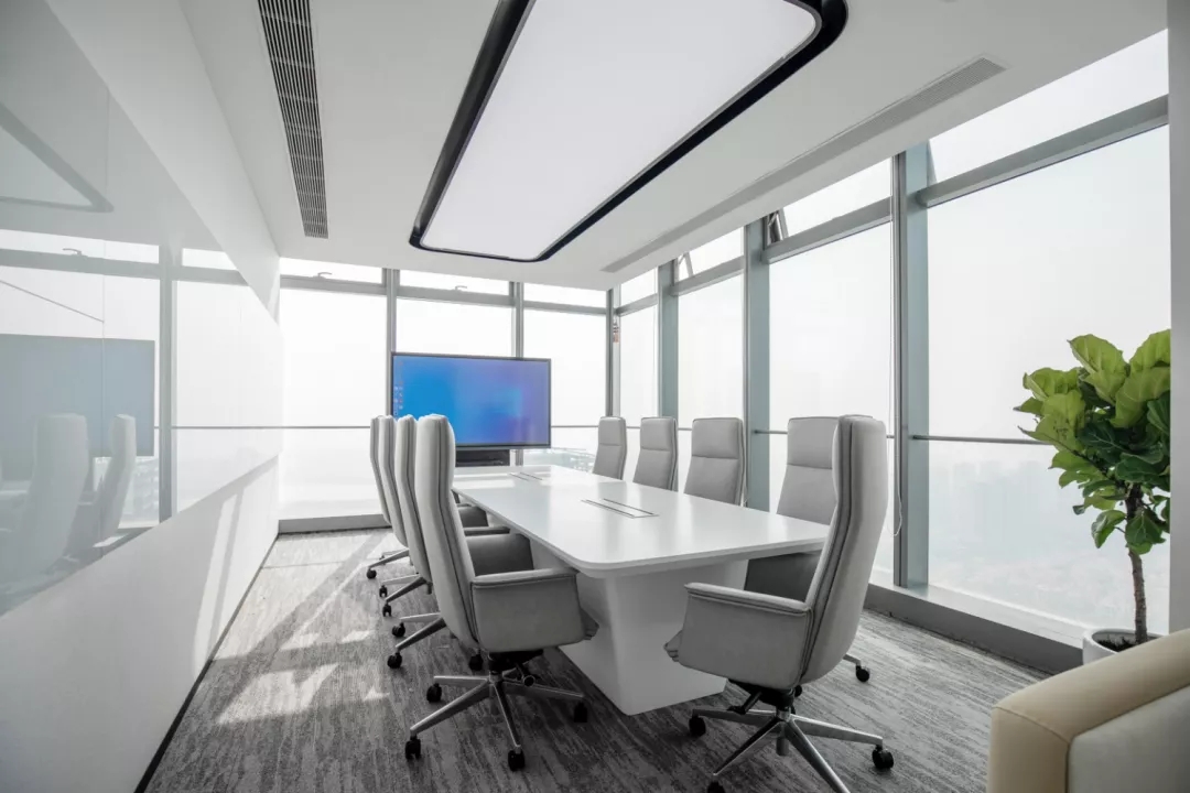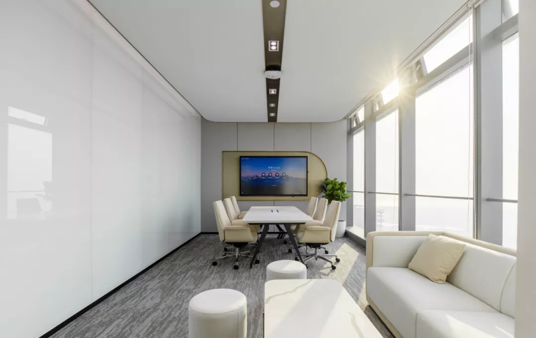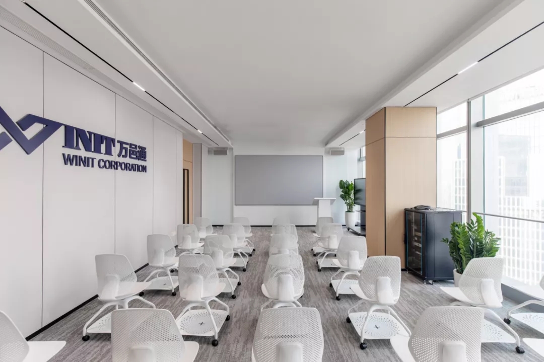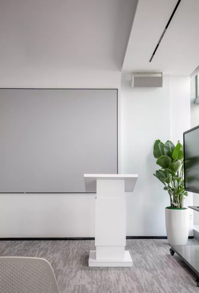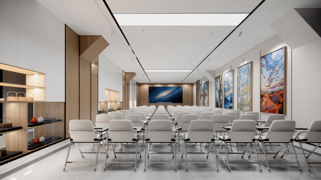 大会议室移动桌椅加上后置坐人阶梯的设计,极大的提高了整个空间的使用效能,可以根据不同的使用情景进行不同的布置:会议、培训、沙龙活动、小组团建等等都没有问题。