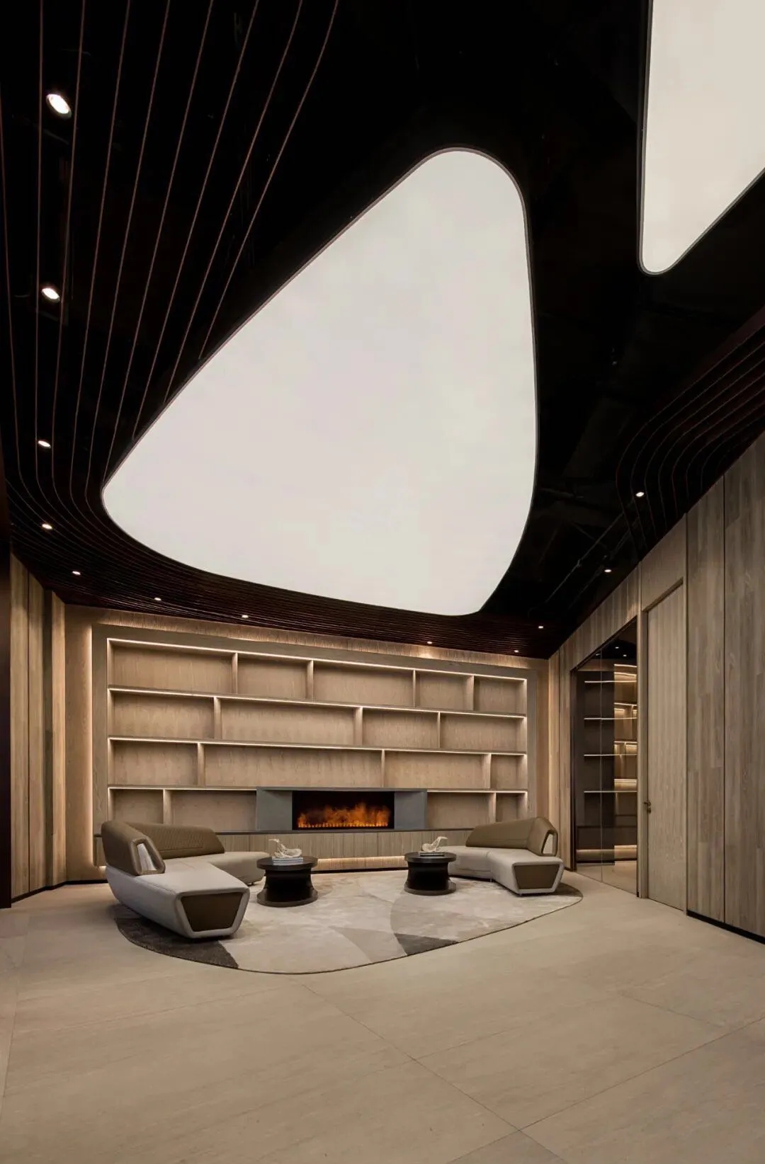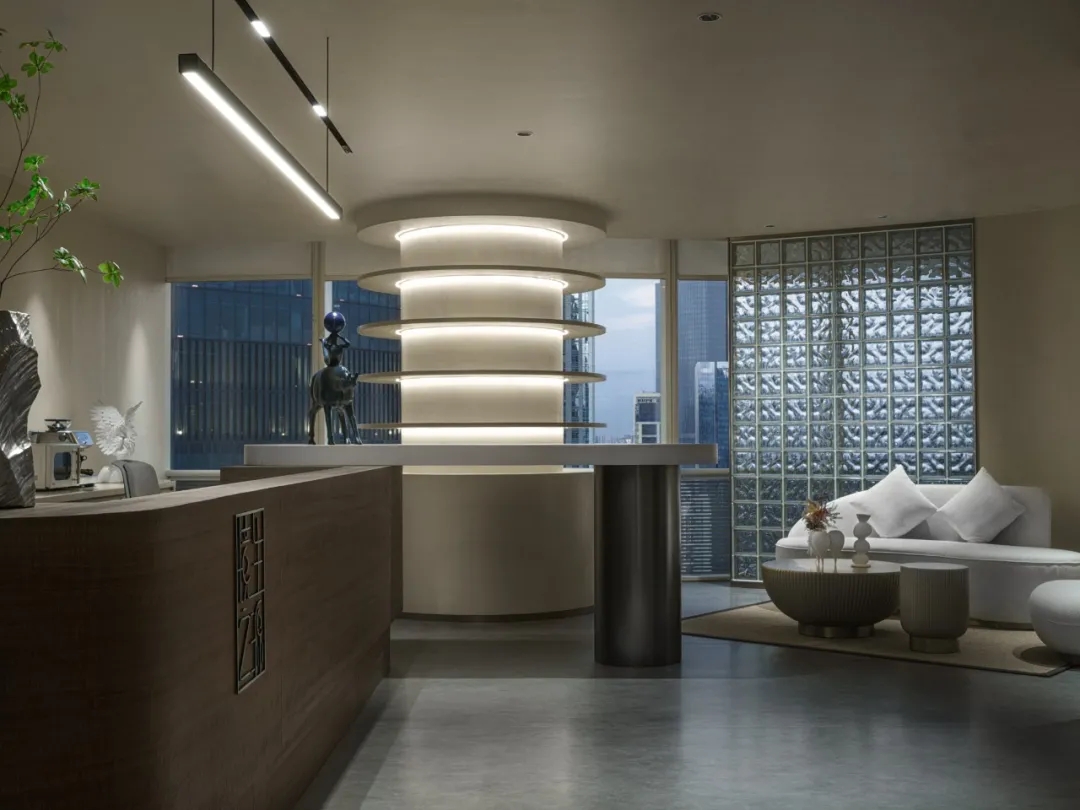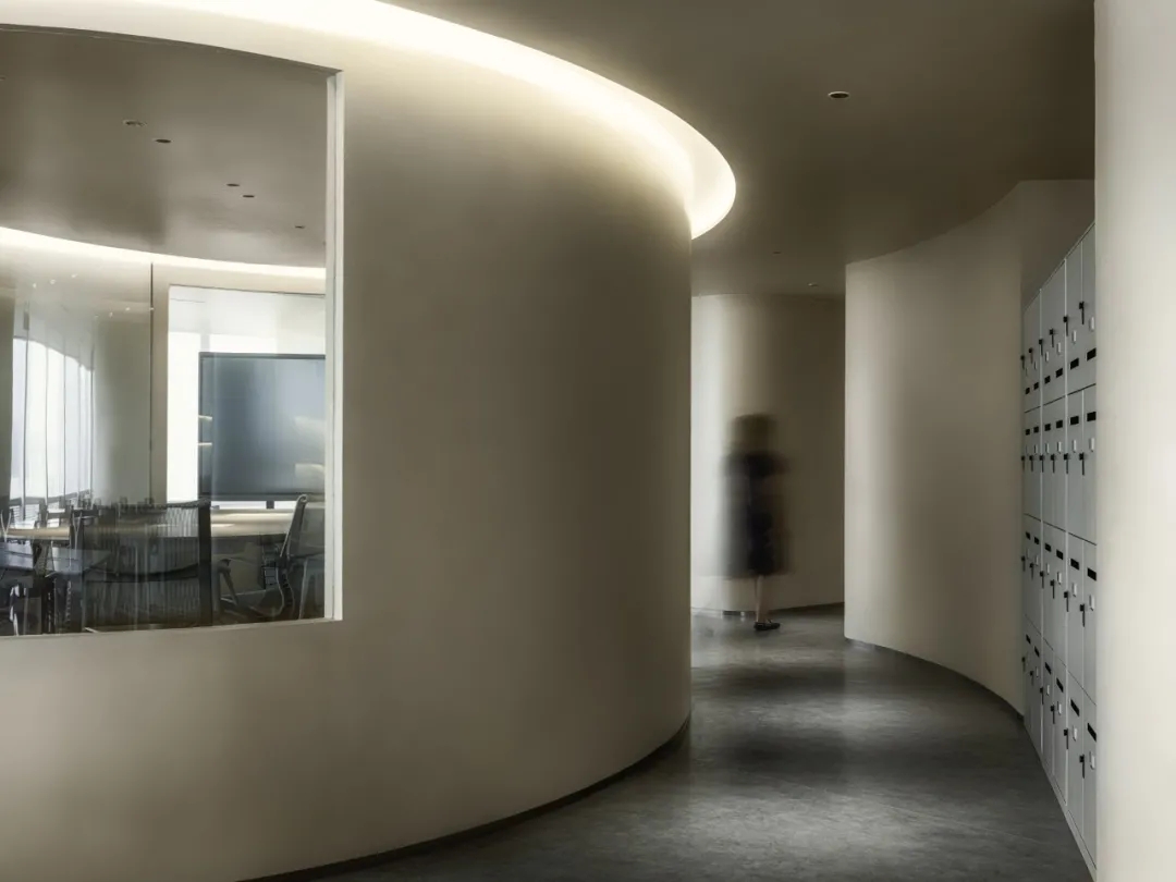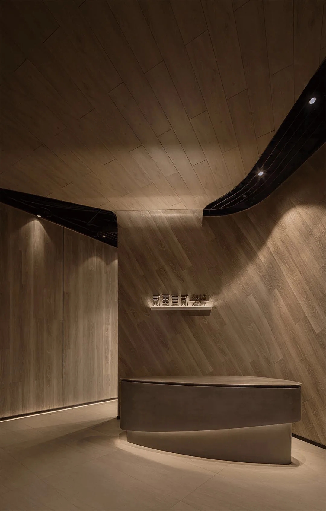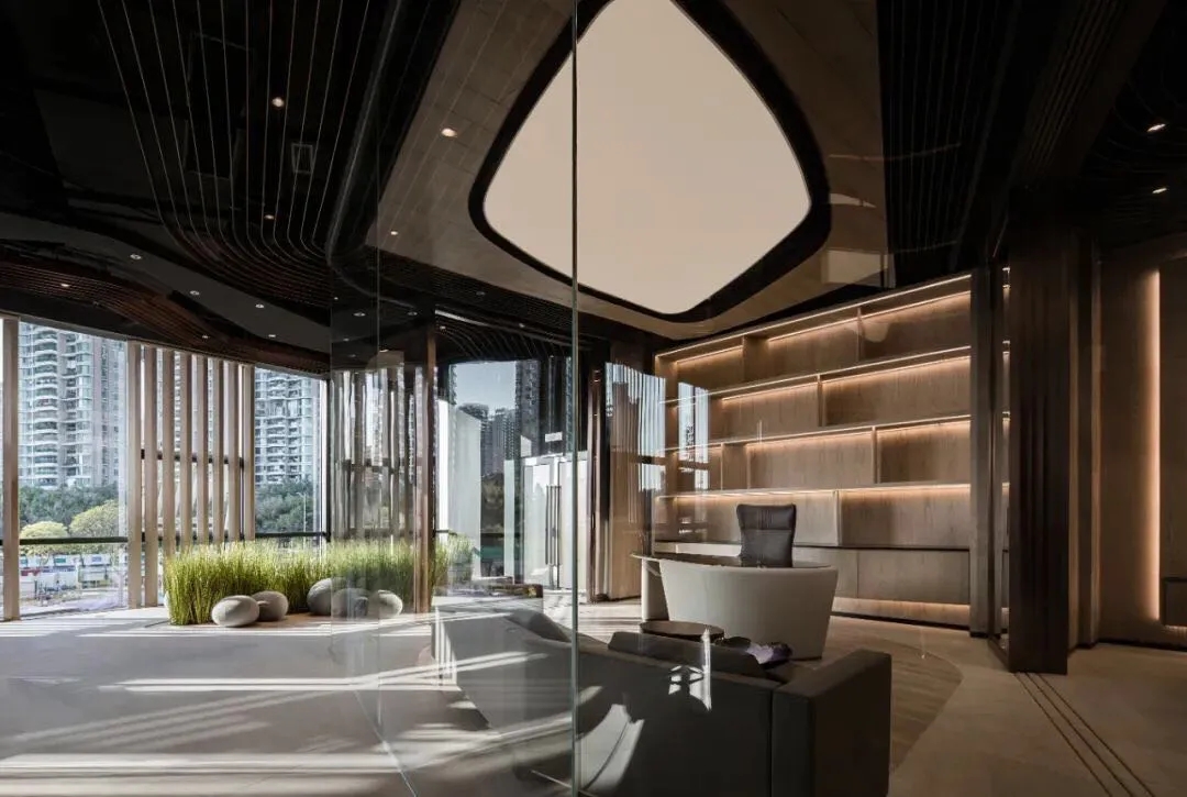 设计师根据“高品质金融科技感的商务空间作为对外窗口”的空间定位,将企业化和文价值观渗透进空间中,通过硬朗的材质与水的至善至柔,进行硬与柔的中和、碰撞,力图打造出一个高品质的商务空间的标杆产品。