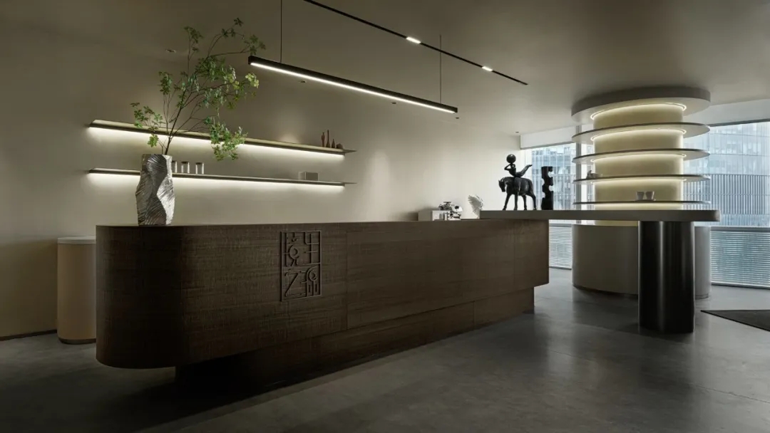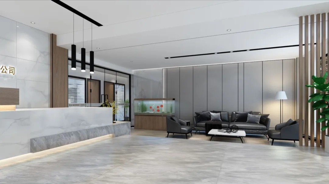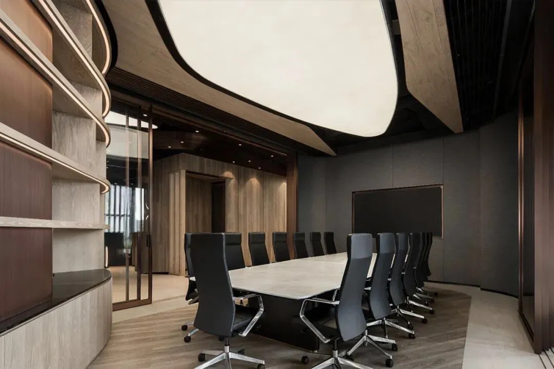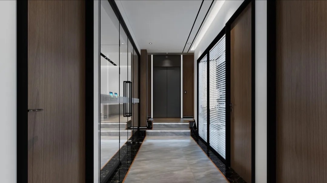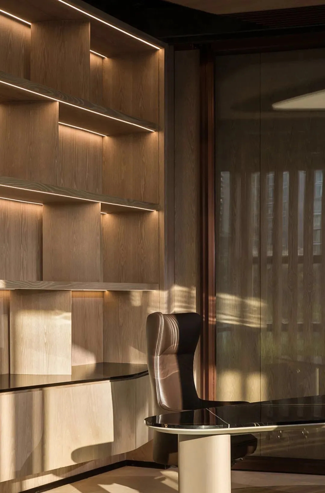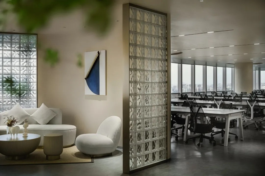 设计师根据“高品质金融科技感的商务空间作为对外窗口”的空间定位,将企业化和文价值观渗透进空间中,通过硬朗的材质与水的至善至柔,进行硬与柔的中和、碰撞,力图打造出一个高品质的商务空间的标杆产品。