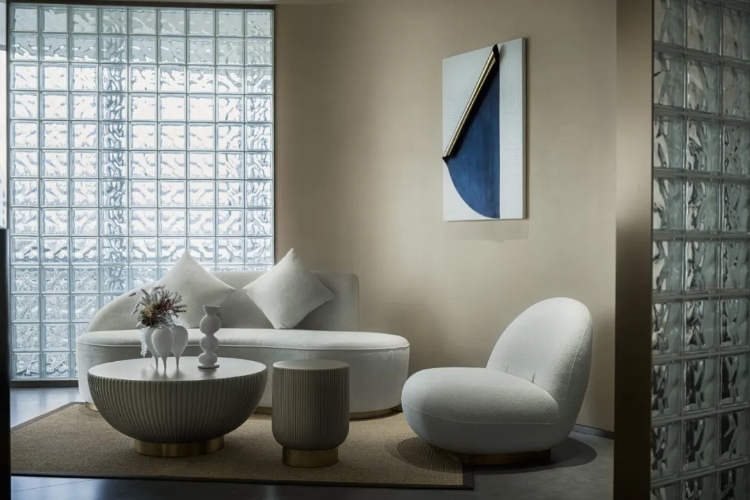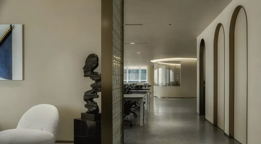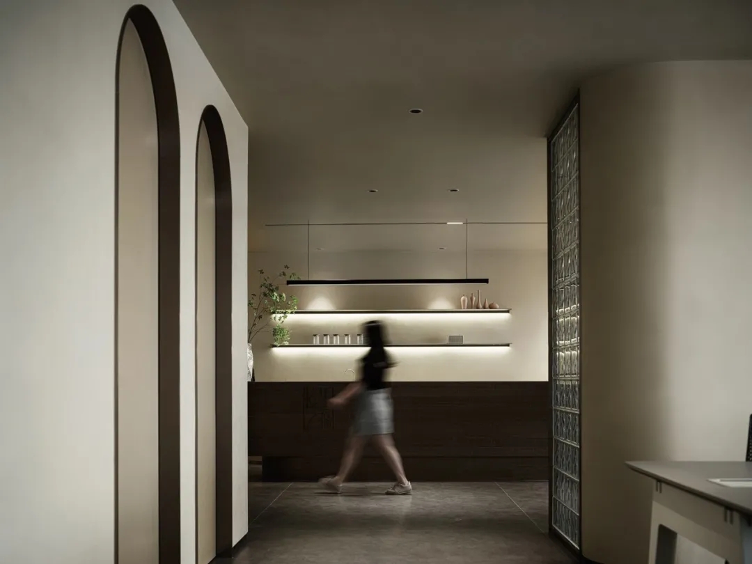流畅的圆弧造型与拱形门洞,传达视觉空间的柔和与纯粹,构建优雅的视觉印象,通过颜色、肌理与形状,描绘 “裸”感美学空间的素雅、质朴的自然之特性。