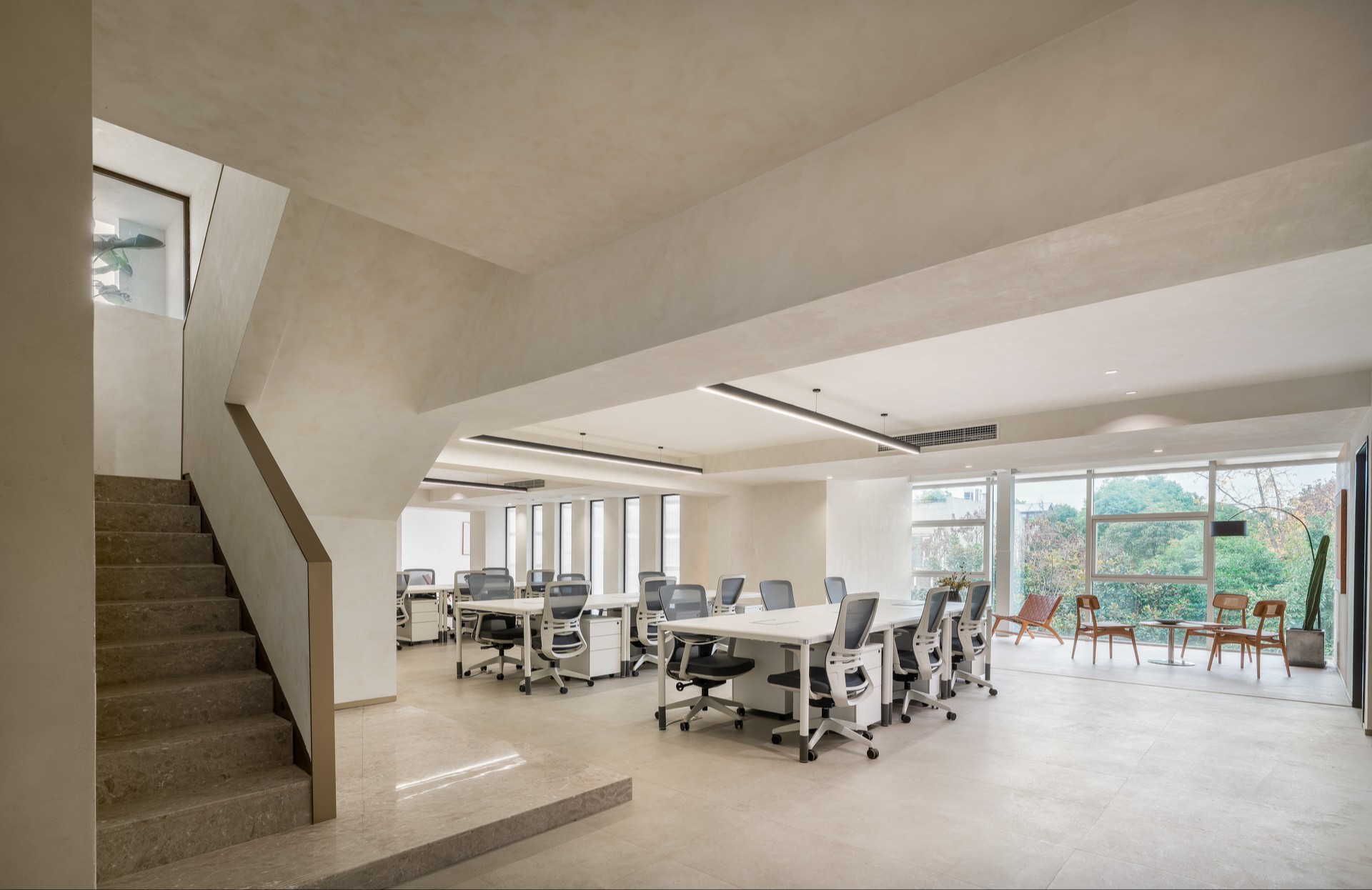 步入大厅,迎面感受人和环境的关系共存并持续进化,游走于高完成度的细节与空间留白给人想象之间的边界。