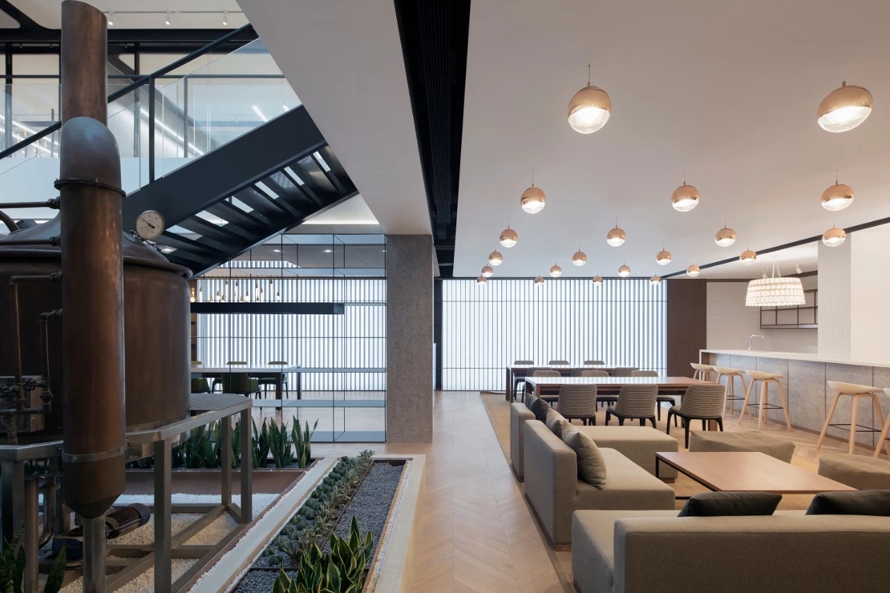 联合办公是这个空间新的功能需求,而对办公来说,自然光线是一个非常重要的话题,于是,我们在二层的天花的中心区域错开梁的位置把田字型的四块大的楼板挑空,接著,把二层地面的相应楼板区域整体也挑空,这样自上而下营造出天井的质感,然后,把原有现场一楼的2个大型的黄铜啤酒发酵桶移动到天井的位置,配合著用多肉植物围著酒桶做出景观的造型,然后,围绕景观,沿著天井的边缘做出一个钢结构转角楼梯上二楼。