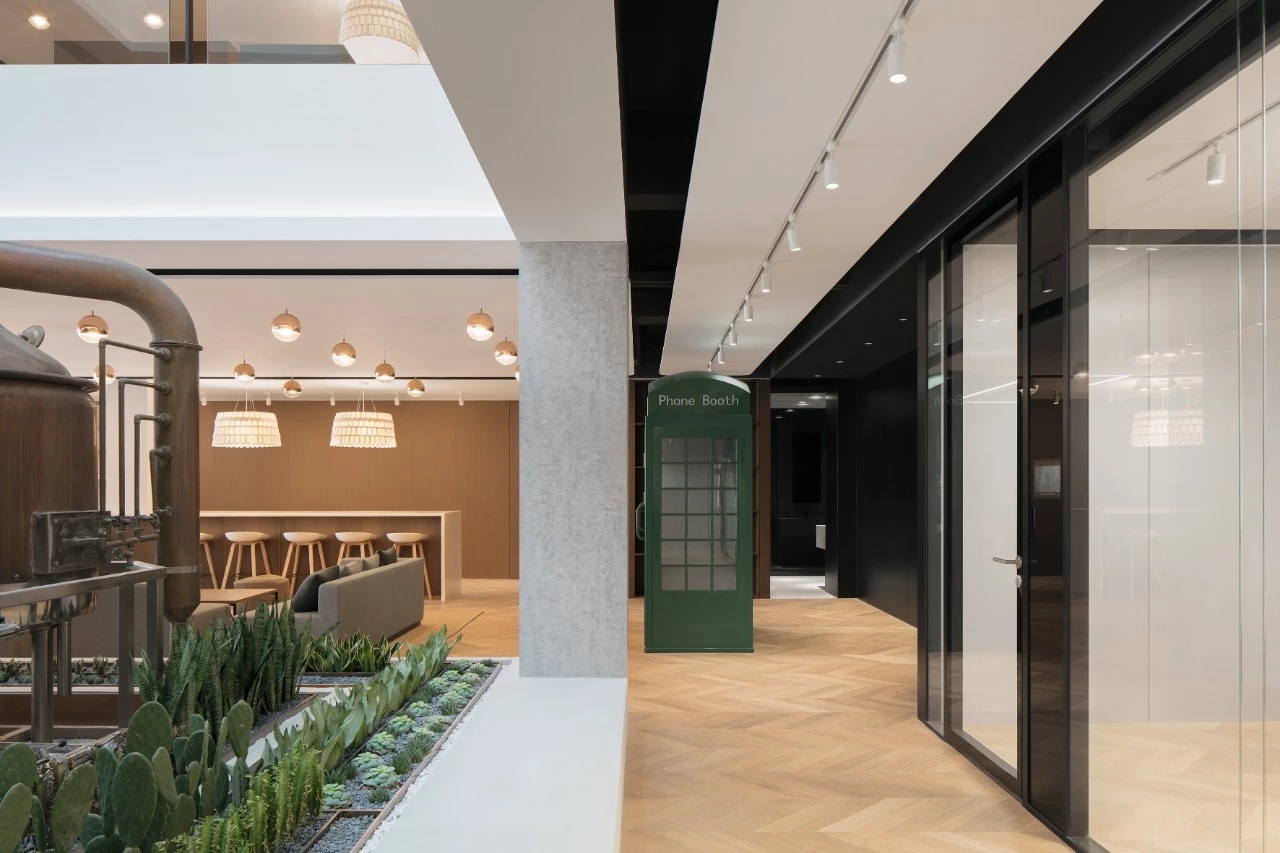 借着啤酒的主题发挥,大麦、泡沫、植物及穿越的光线陆续出现,anySCALE让这个小巧的联合办公空间变得生动而光明。