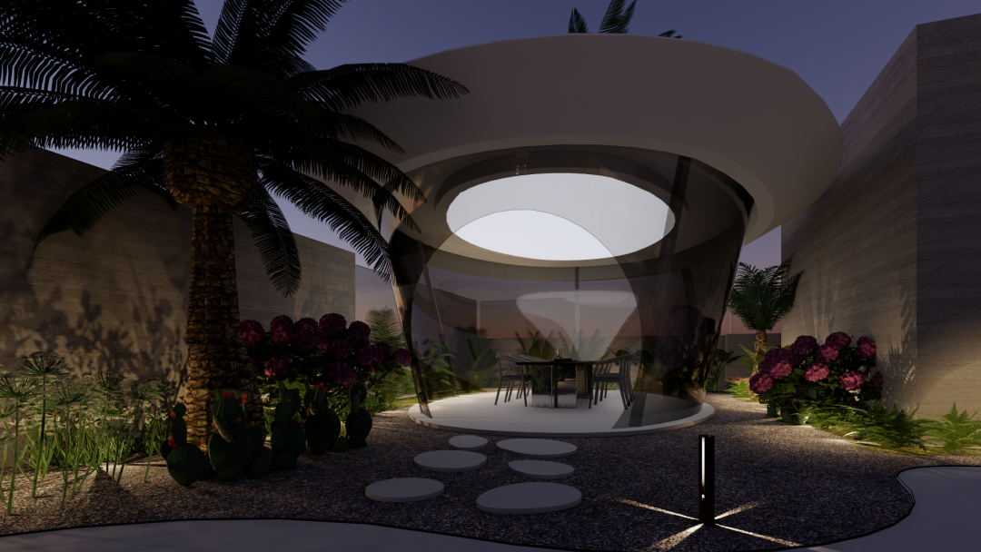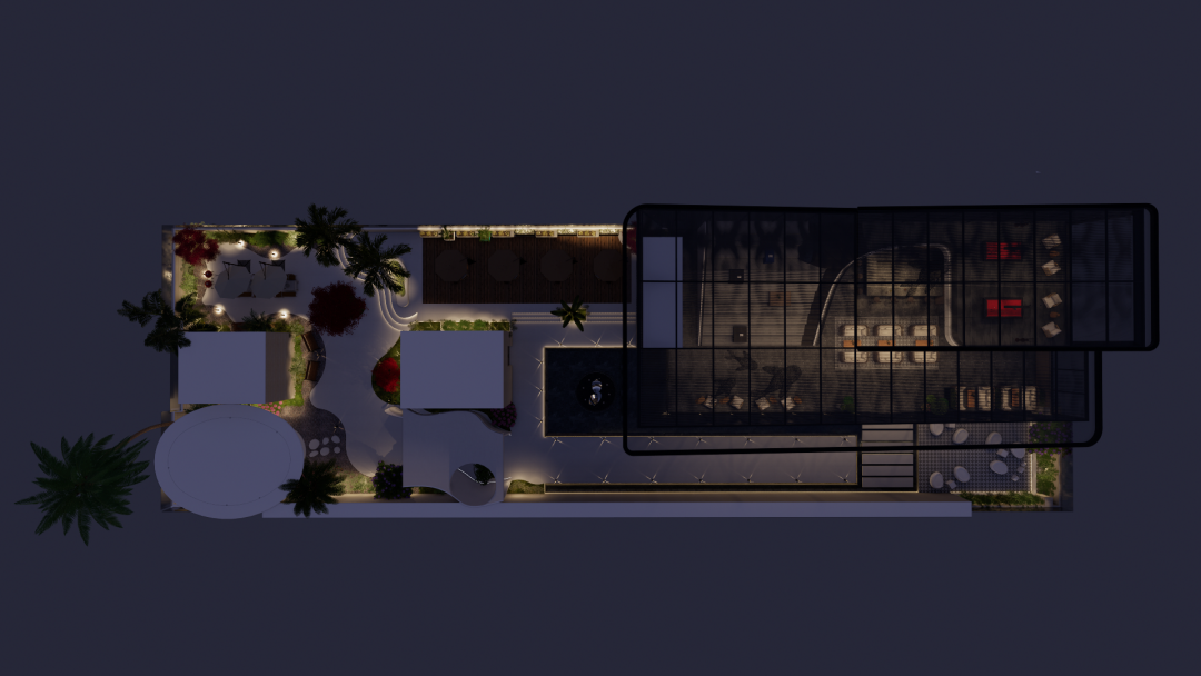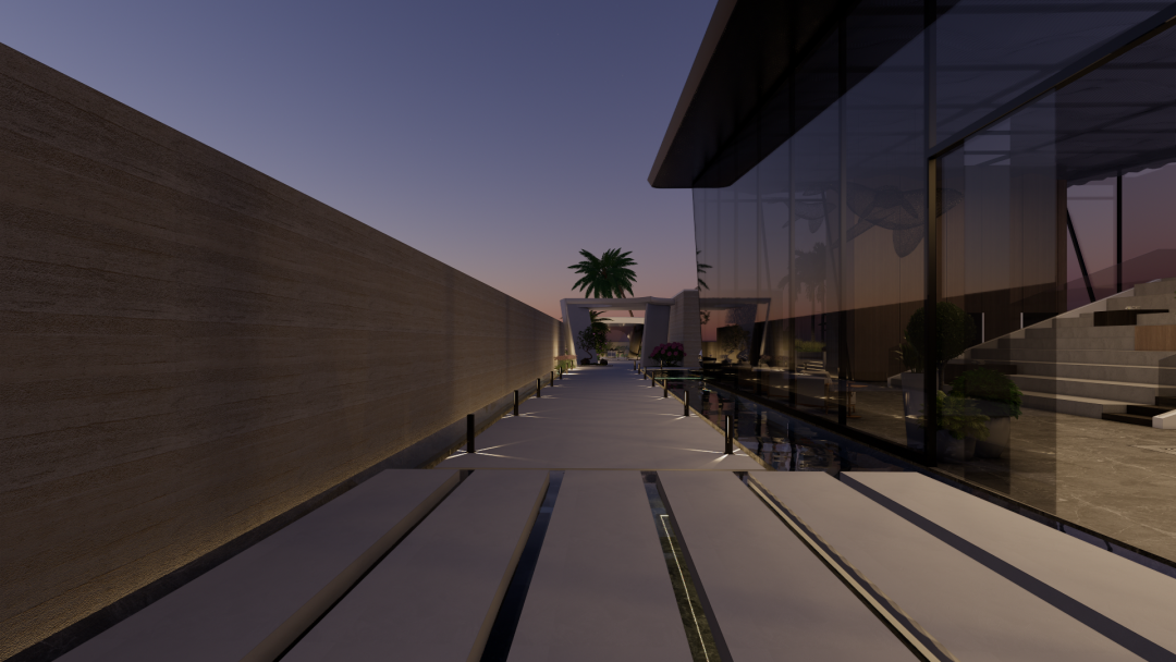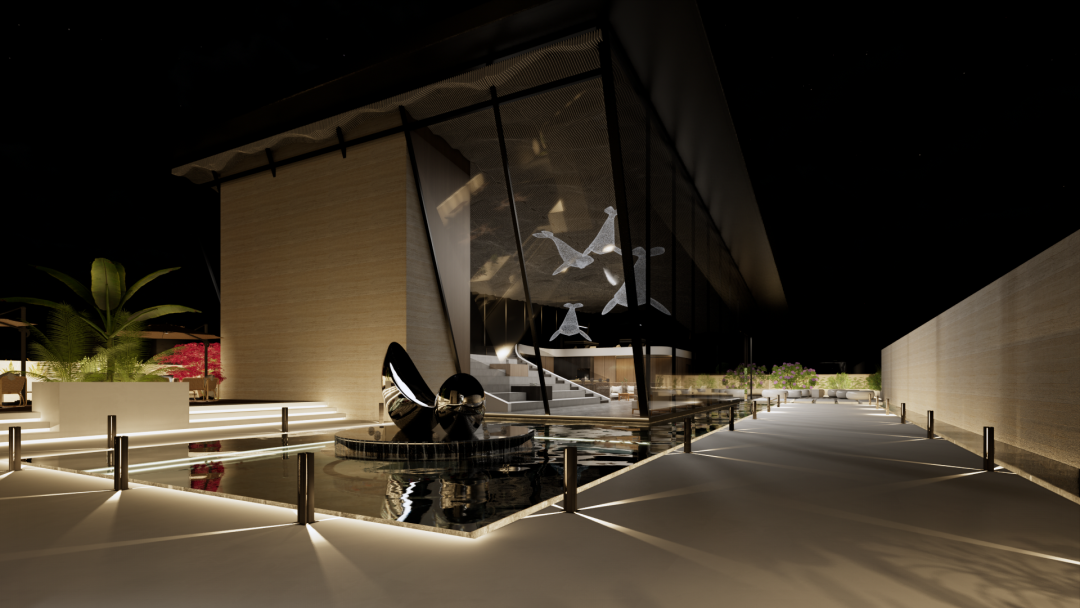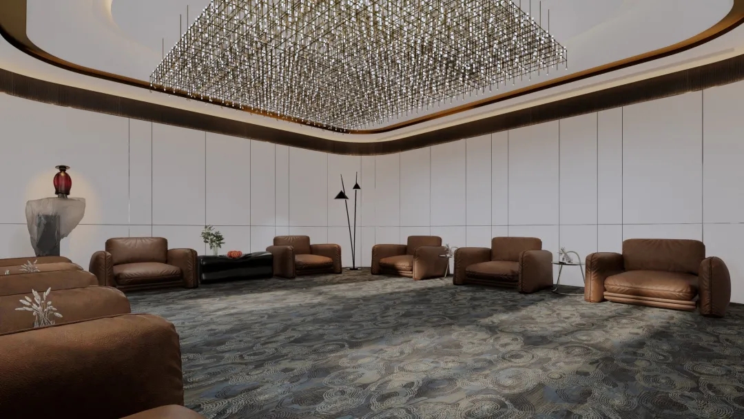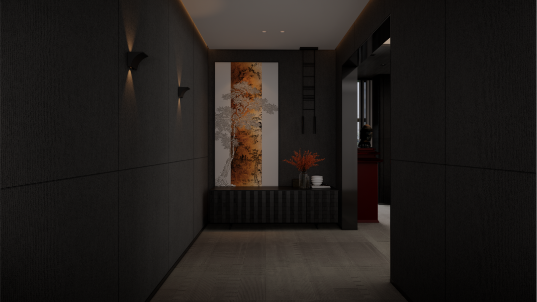 打破了传统直角墙壁所构筑的空间局限性,同时也模糊了空间的纵深度。大面积浅色木饰面柔和依附于起伏并延展向远处,使氛围柔和而有温度。