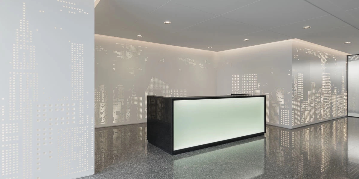 用穿孔铝板配合彩色玻璃,让小孔和方块一起,和光线做游戏