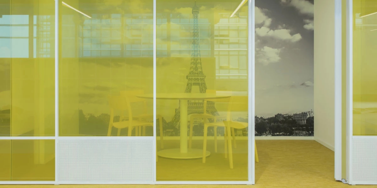 白色的半透明框架,然后是同色系的彩色玻璃、彩色 BOLON 地毯,和彩色的 Gabriel 布料,黑白的世界城市景观喷绘隐藏在大大小小的彩色透明空间里面,形成各种主题的会议室,也凸显了趣加集团服务全球的战略姿态。