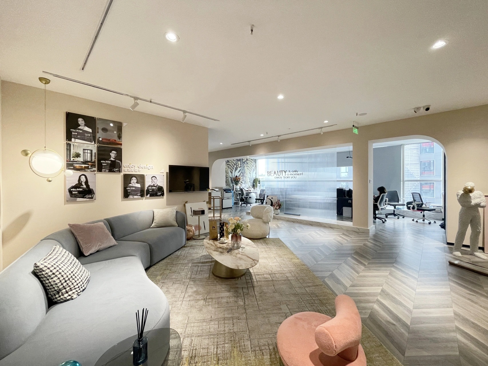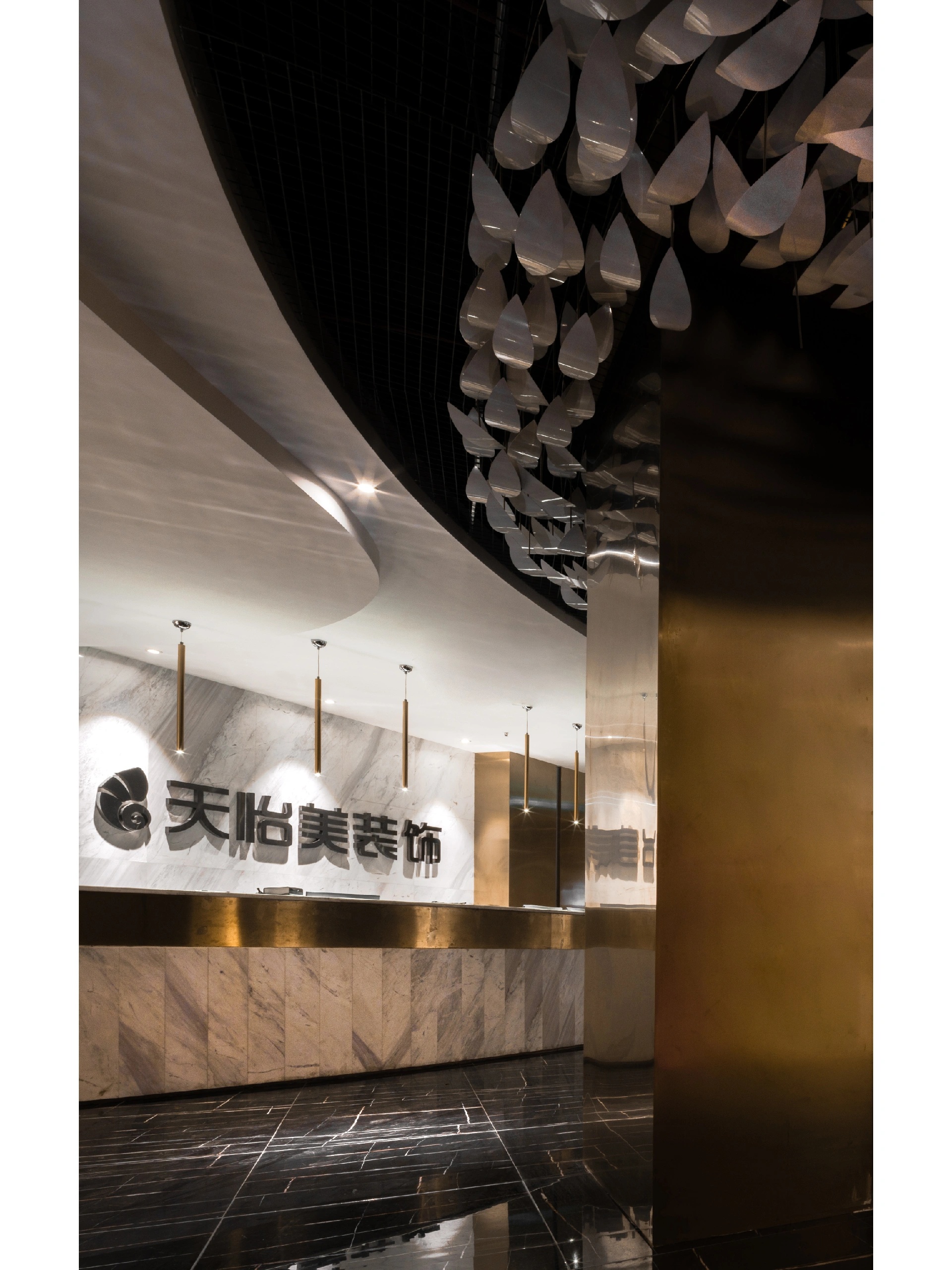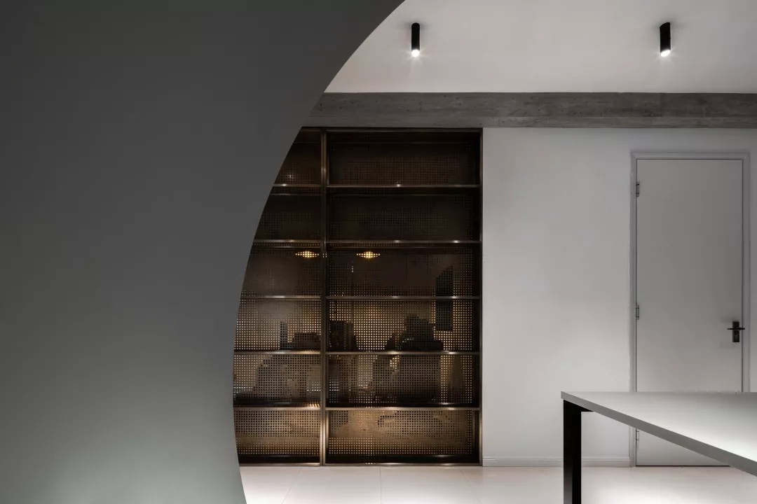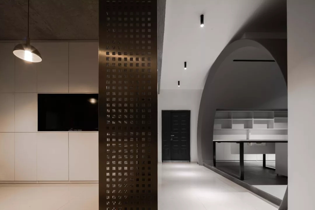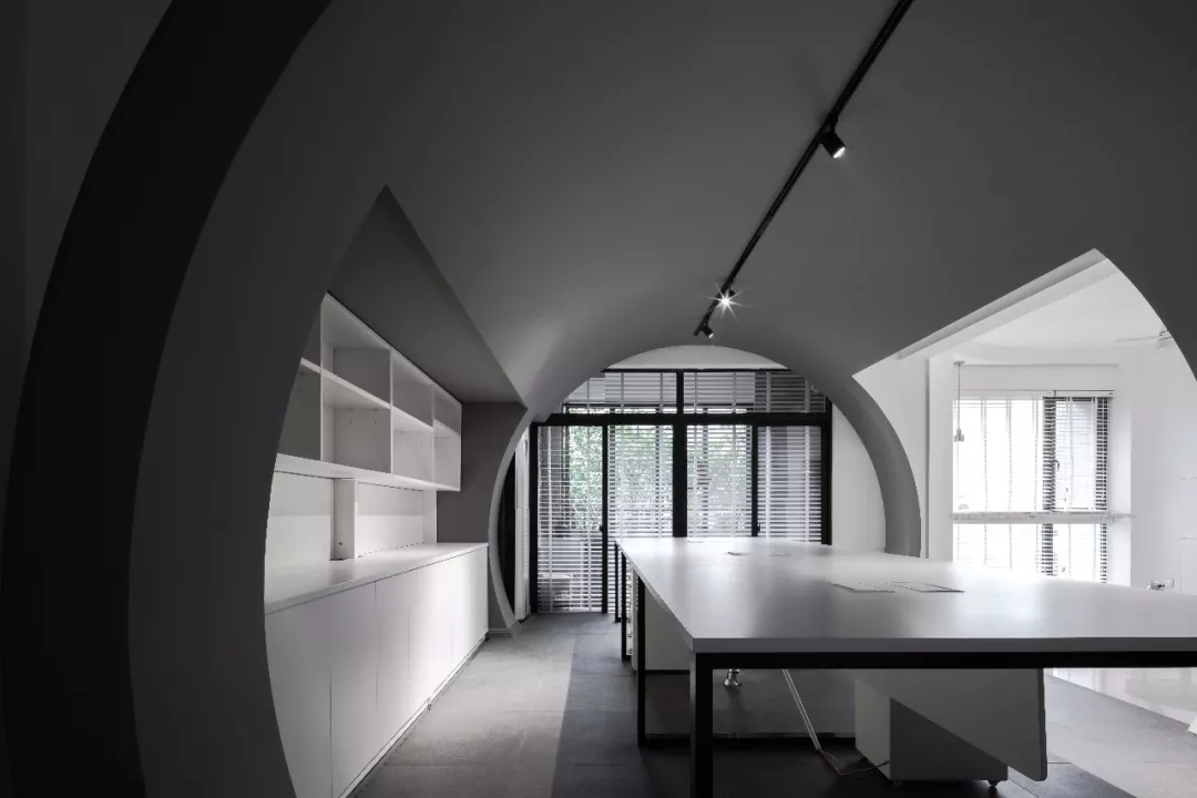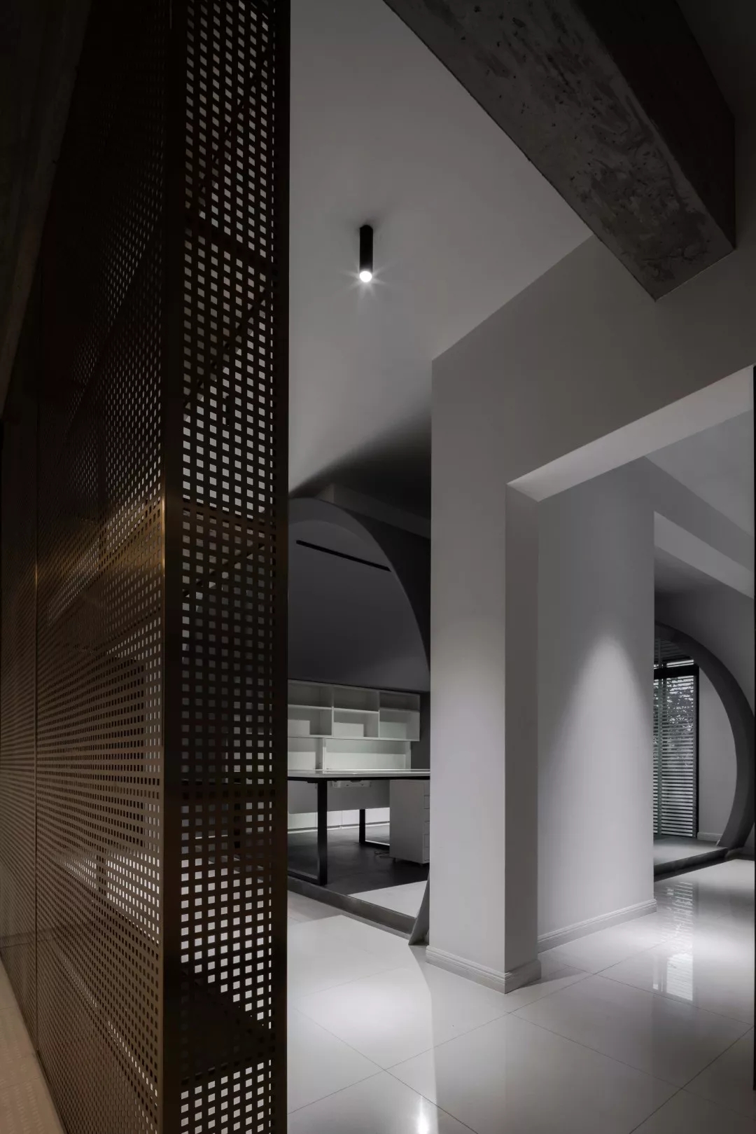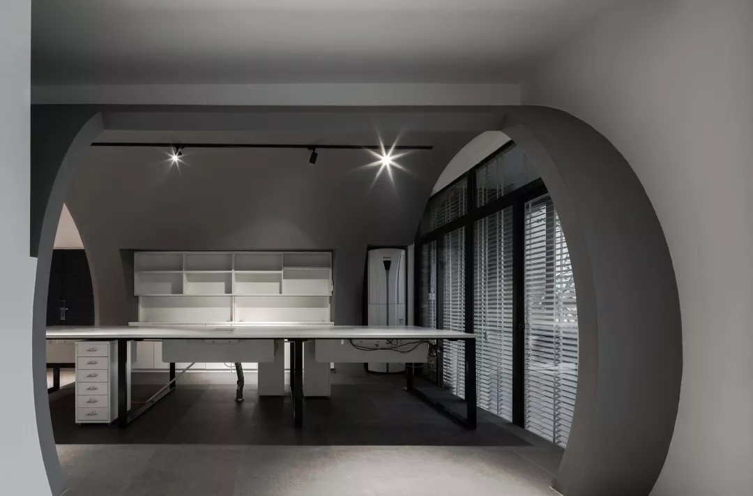 我们将弧形空间的造型作为办公的核心区域进行打造空间的成型不仅将办公区作为一个单独的小空间又框选在了我们的弧形空间内我认为每个空间形态的分割线它都应该自然而然没有违和感你不需要去设定特有的一些东西来划分空间很多事情应该是淡淡如水的慢慢形成