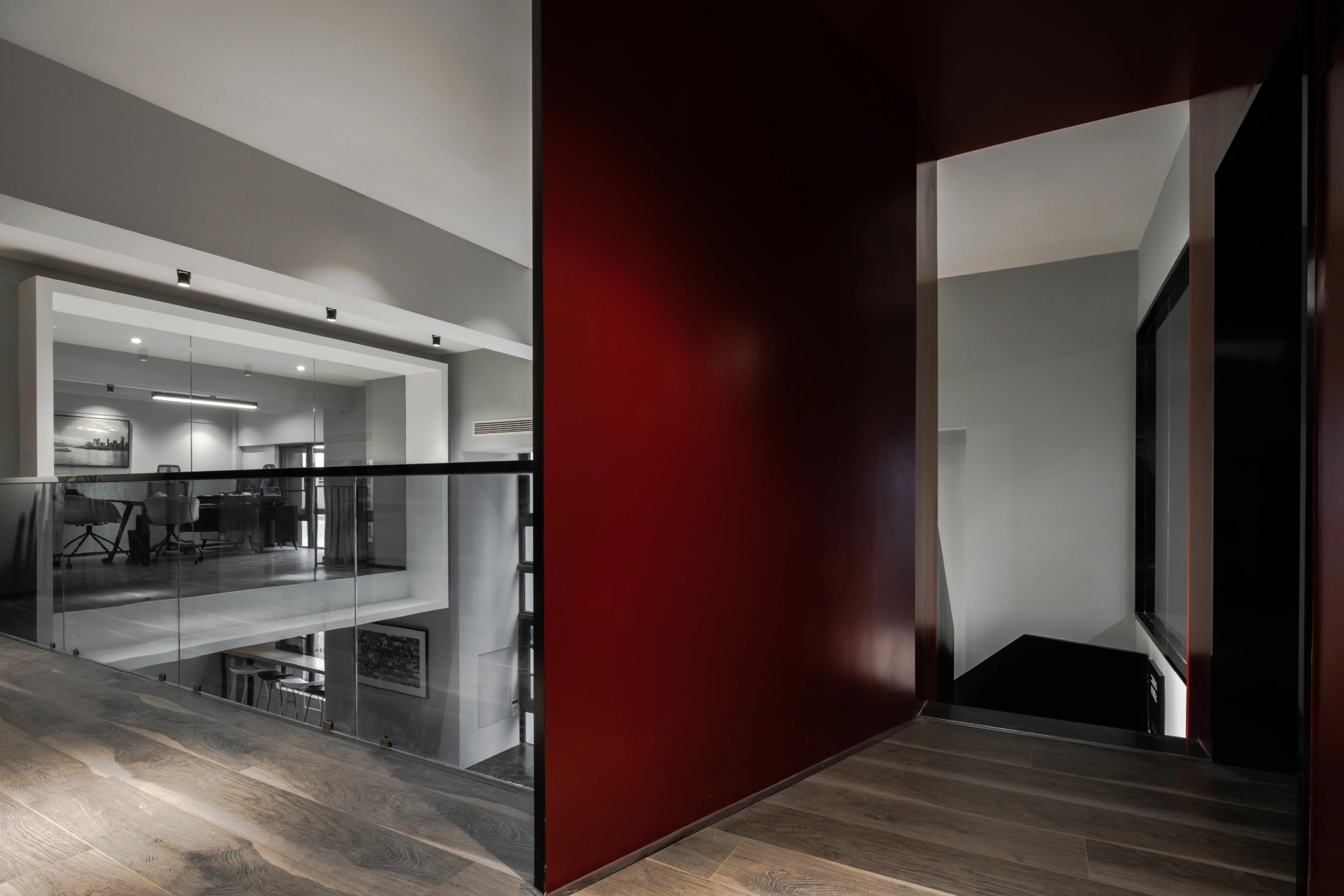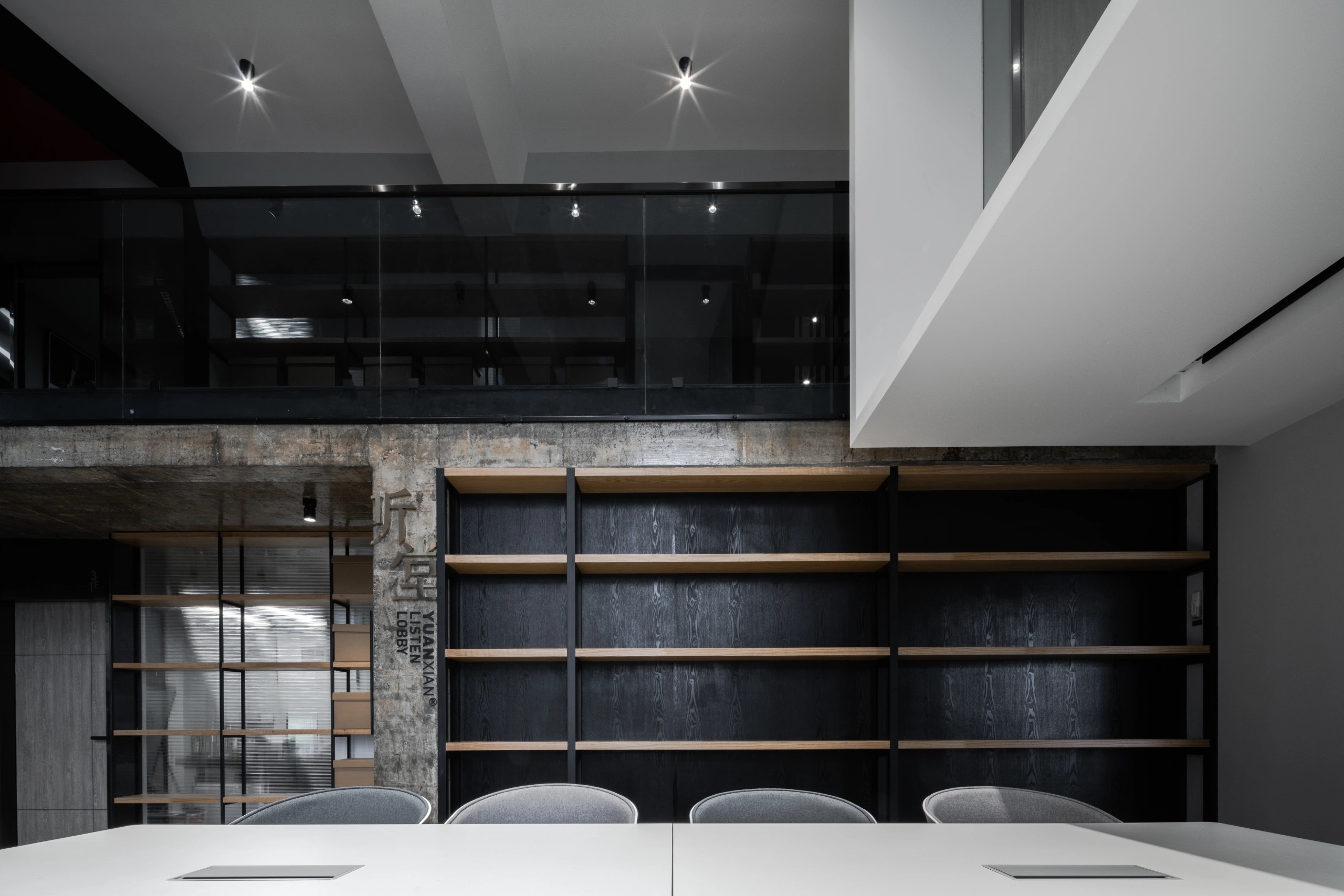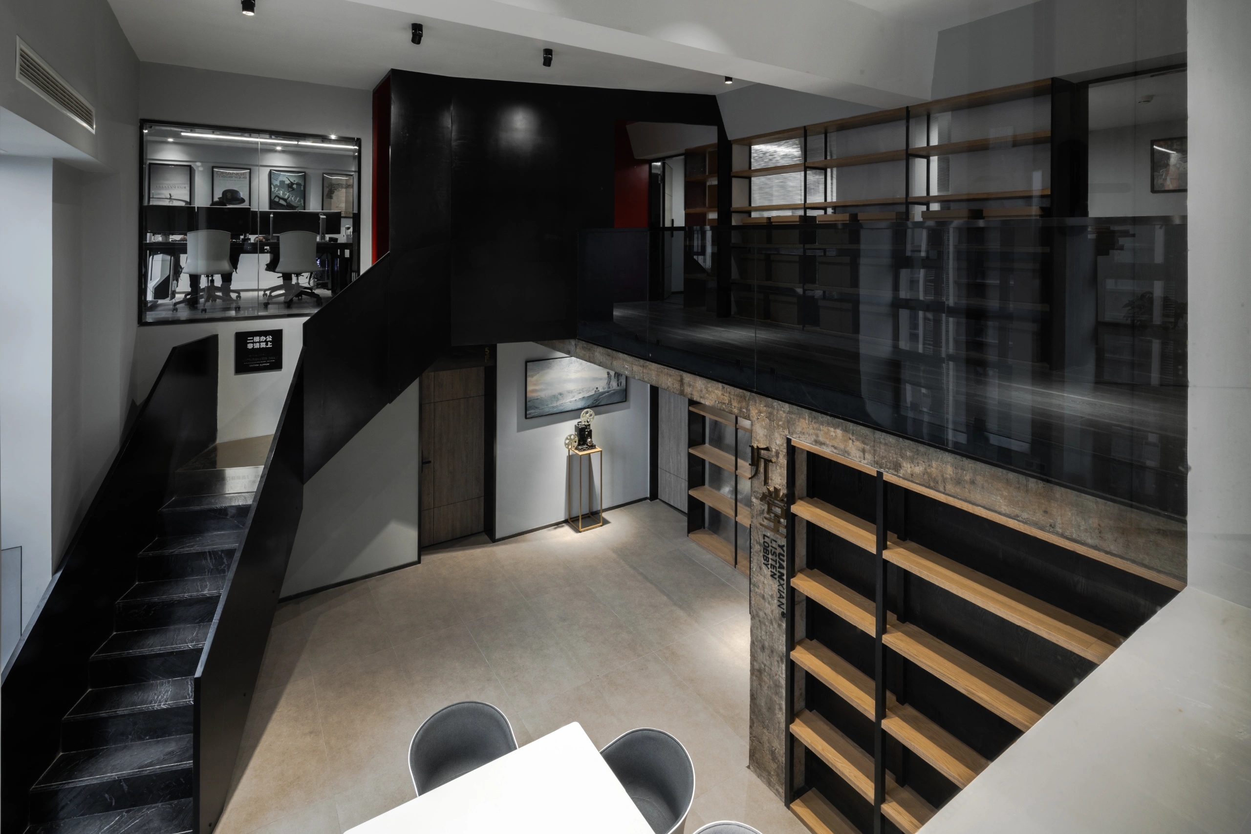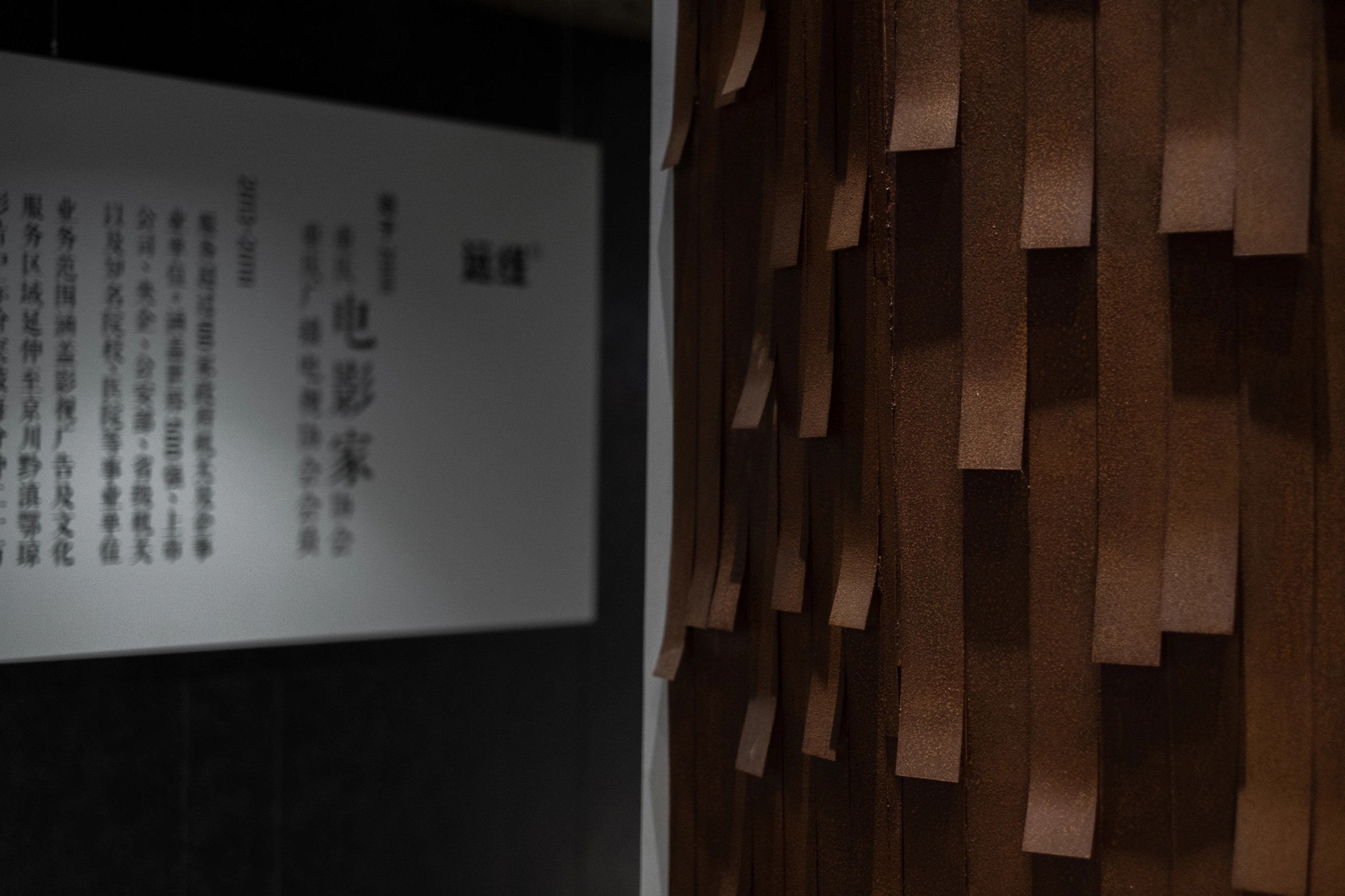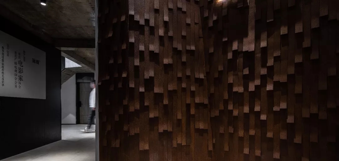影视公司铁锈斑斑的铁皮入户造型将我们的思绪代入到那个历史的年代,墙面上关于公司发展历程的介绍让我们去回顾过去的年代。我们希望进入者的思绪沉寂在这里。粗胚混泥土作为顶面基调,以纯铁件建构的楼梯依墙而上,引领视点延伸至二楼,运用框面造型界定出私密的办公空间,由视线穿透和光线流动模糊虚实,塑造另一种空间层次。