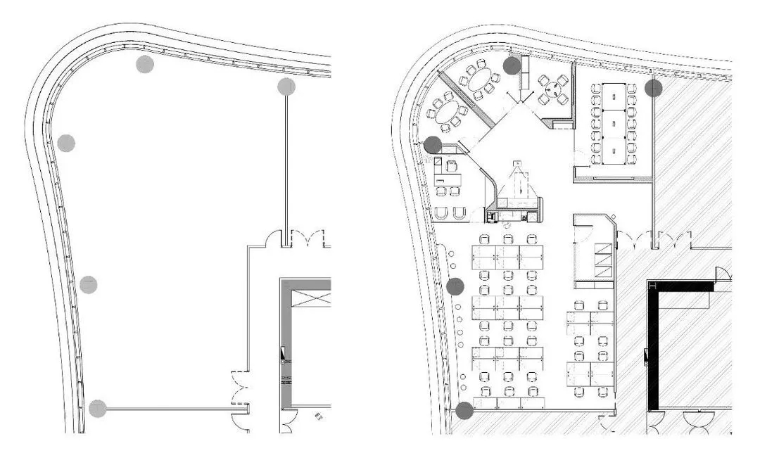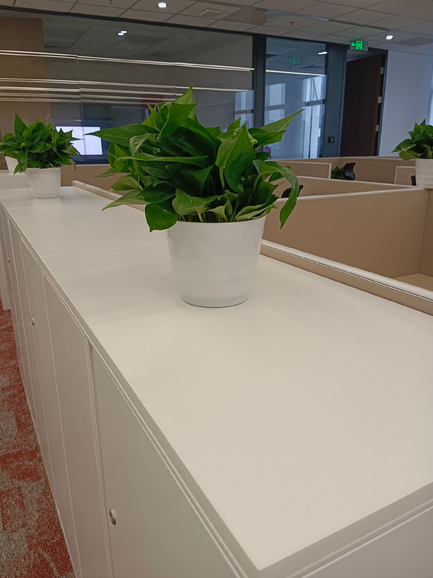 中间的多功能双面茶水柜两侧分别针对不同的使用群体,同时起到了对内对外的空间分割,不到顶的设计,也让空间看起来更加的流通。