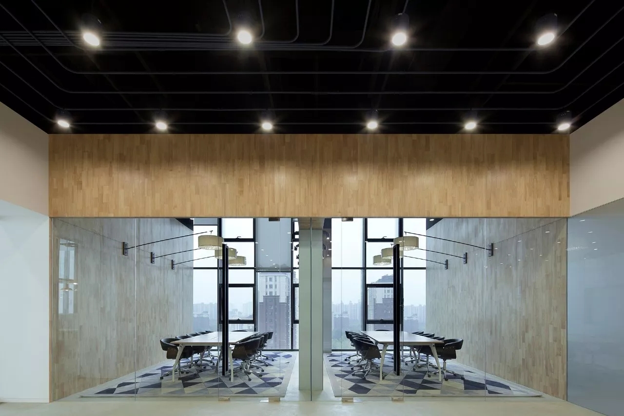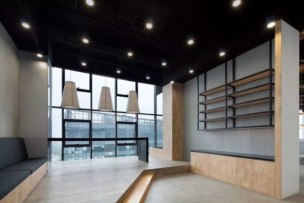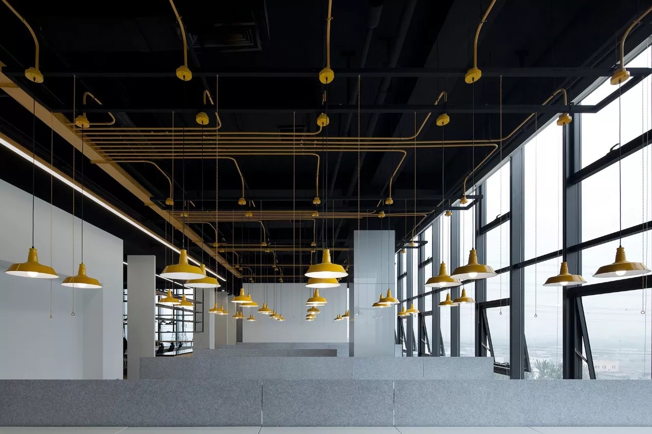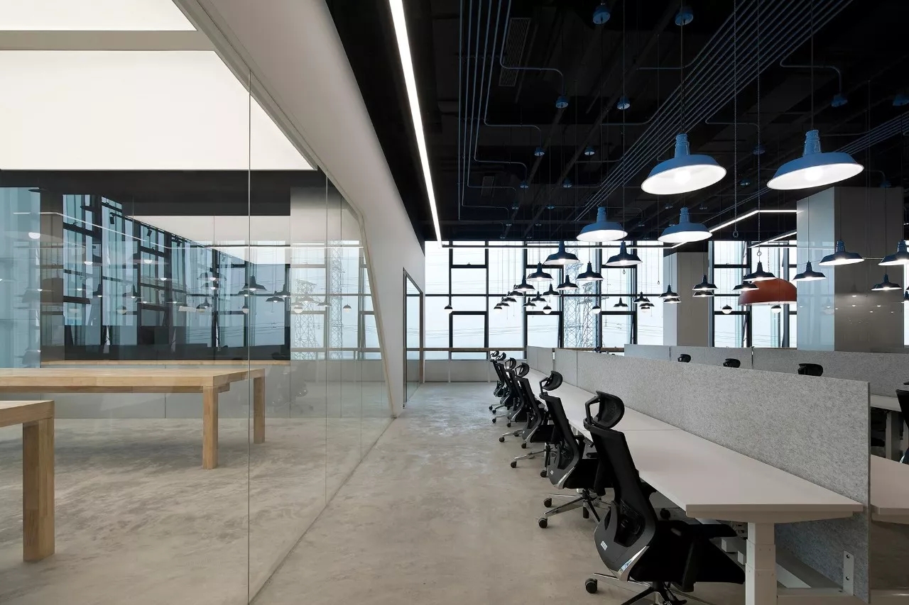 紧紧围绕这个出发点,在这个全新的办公室项目中,我们将原本可能给忽略掉然后可能杂乱无章的强电和弱电的走线管线作为设计非常重要的一个亮点加以开发,重新细细梳理,按照物理和思维的逻辑关系顺畅叠加然后有节奏地分段引流,接着按照不同的区域赋予从企业规划中提取出来的不同颜色。每一个电动升降的工位对应一个单独拉线开关的工业吊灯,每一个工业吊灯对应该区域应有的颜色,于是,INK银客里面有性感的蓝灯区,黄灯区,绿灯区和......最性感的红灯区。怎么剪都不断,不用理还不乱!轻盈有序,点到为止……