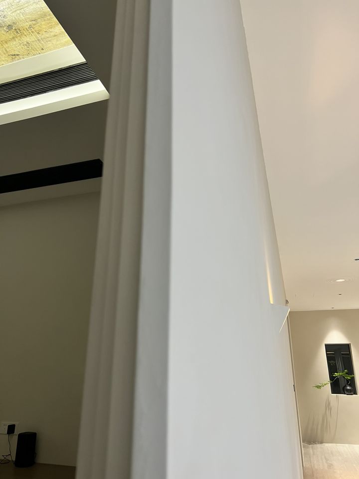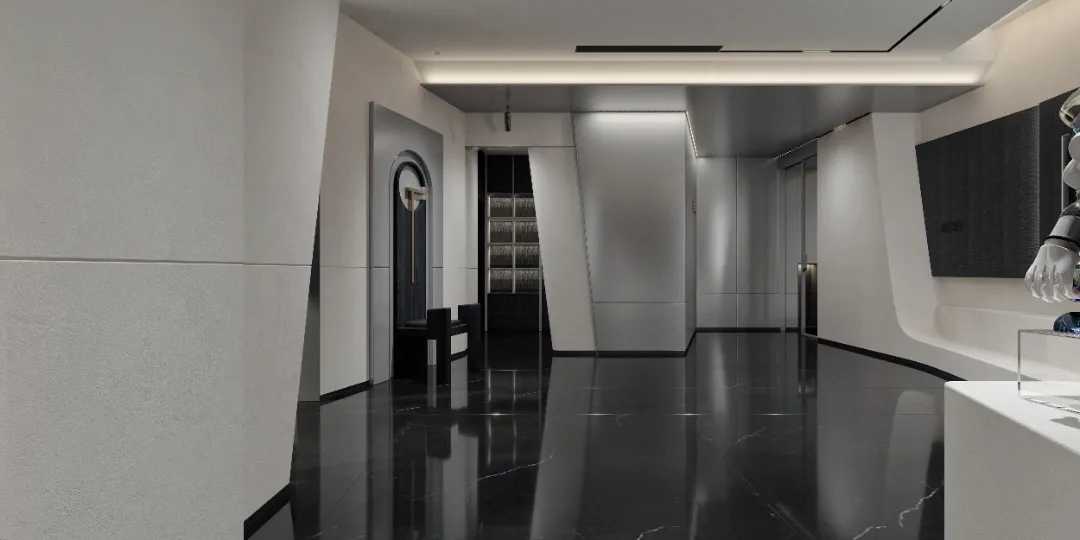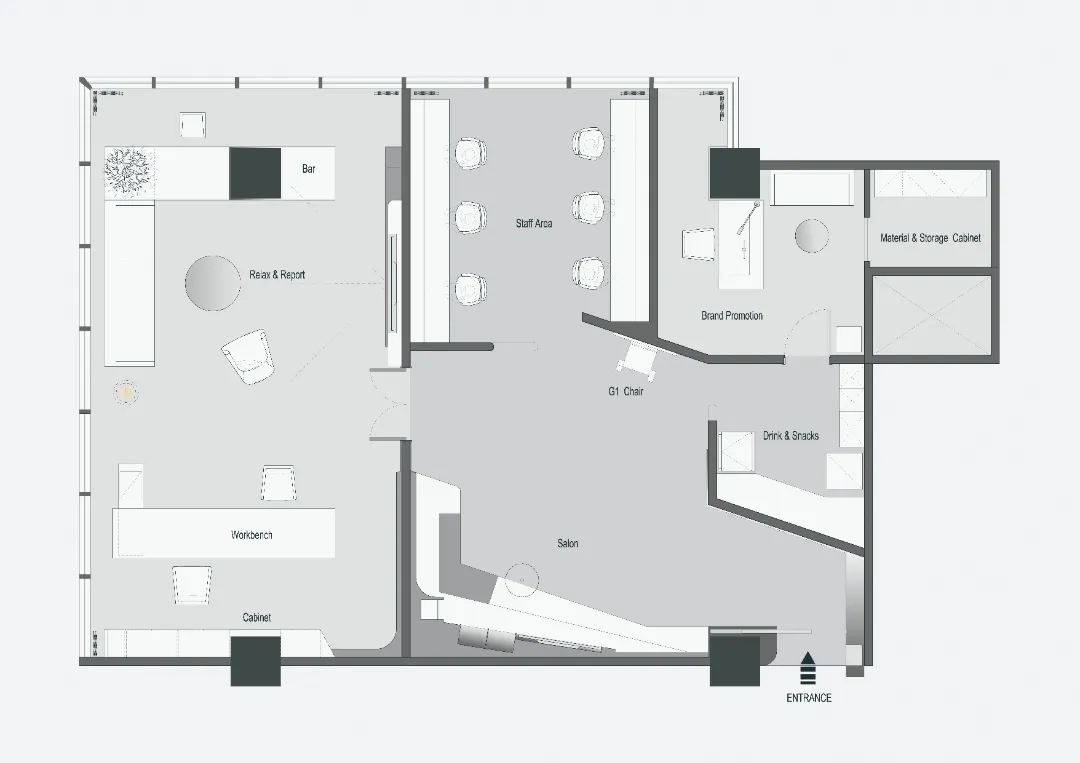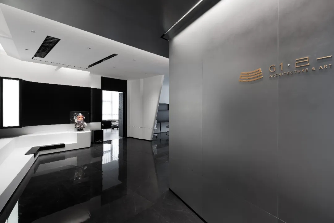 整个空间划分成三个主体区域----沙龙区,工作区和城市会客厅 。每个区域在保有自己特定功能属性的同时 ,与其他区域产生功能场域的交互。通过立面的入口通道斜扩处理,将视线引导至沙龙区域——我们希望此处的salon,不仅方案讨论时设计师们可以在这里头脑风暴,闲暇休憩时也可以错落而坐来一局游戏;并且它还承载了产品推介会,社交沙龙的功能属性。沙龙区的一侧便是开放式的办公区,办公区非传统的入口轮廓也因循了我们对设计的态度----不被定义