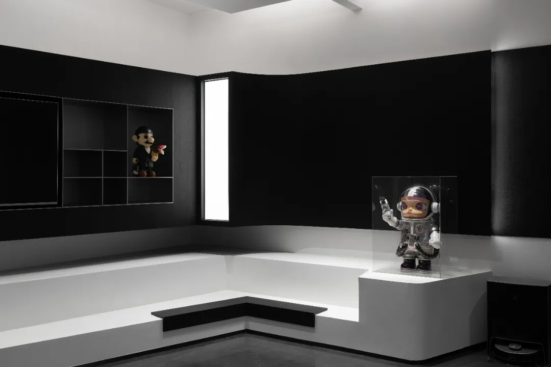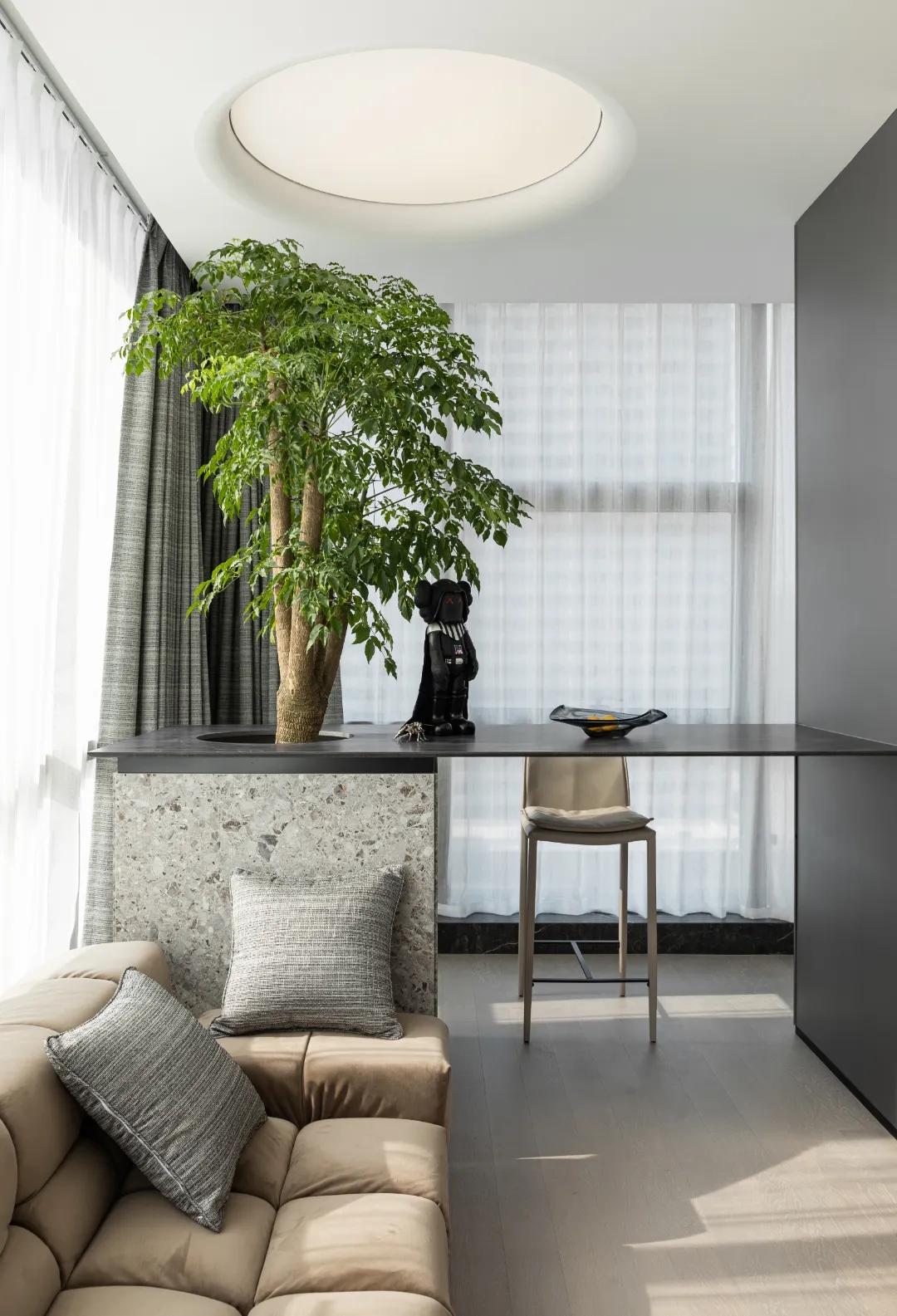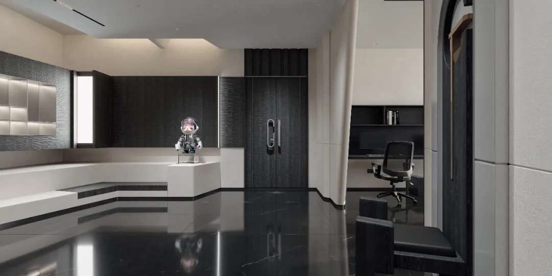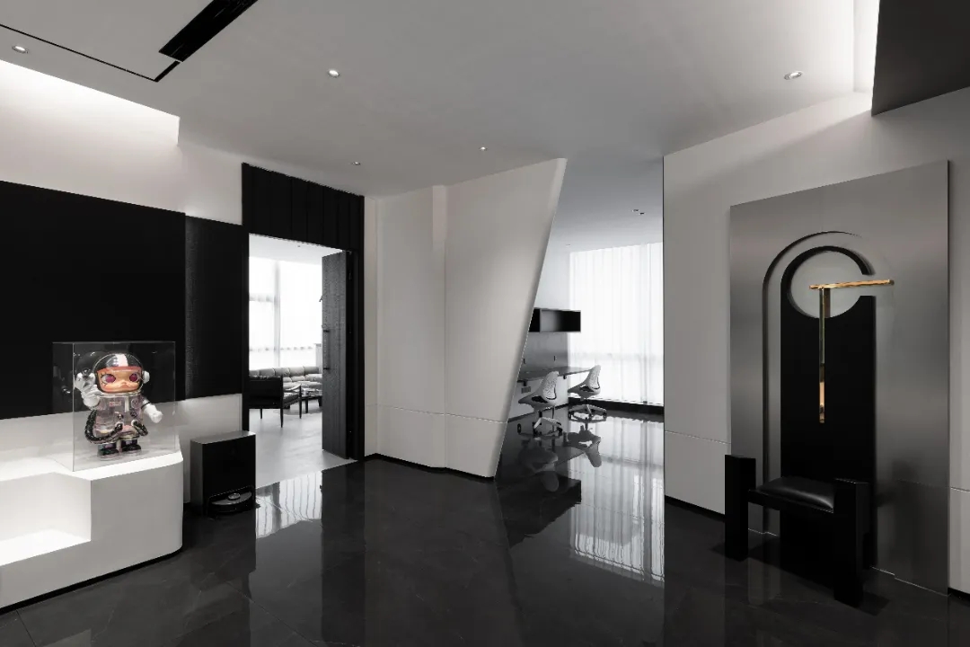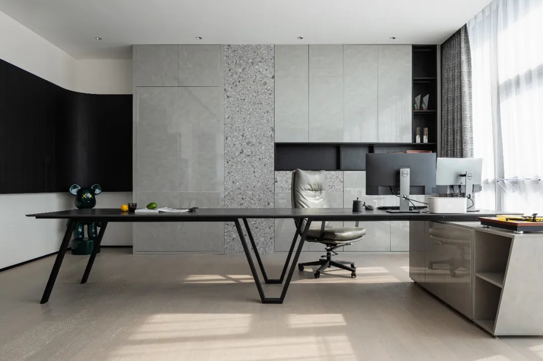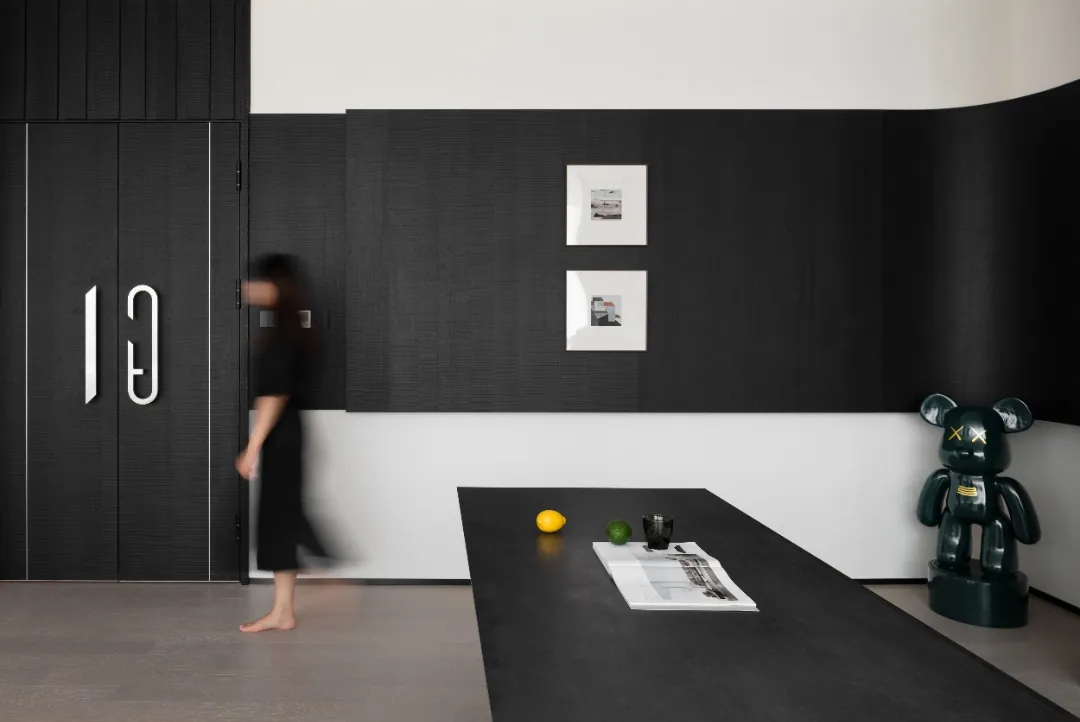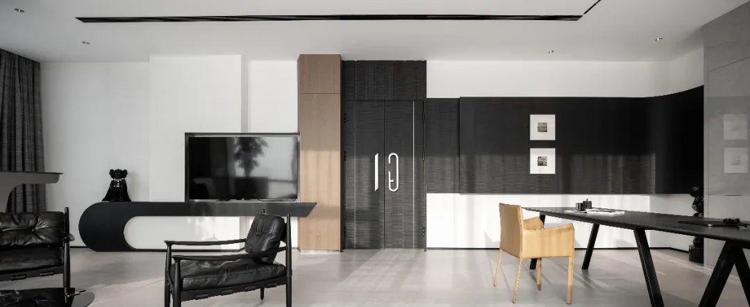 顺着黑色背景木饰面的脉络,人的视线被延伸到“城市会客厅”。我们不希望在“城市会客厅”中出现冰冷传统的会议桌,设计主理人的办公桌也变成了长达4米的多功能桌,因为我们更希望客户能在有生活感的空间中,随性的姿态下,聆听我们的设计汇报,也可以很惬意地和我们对坐长桌,谈心品茶。
