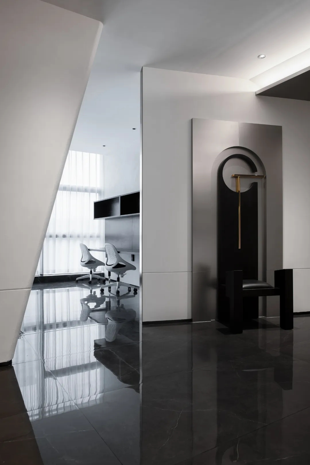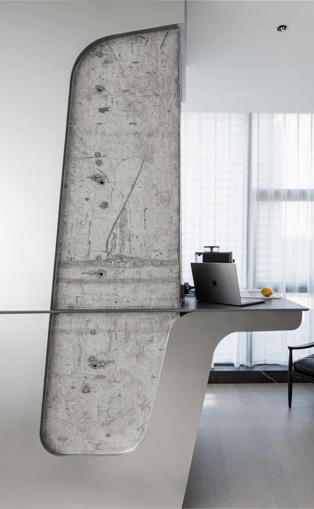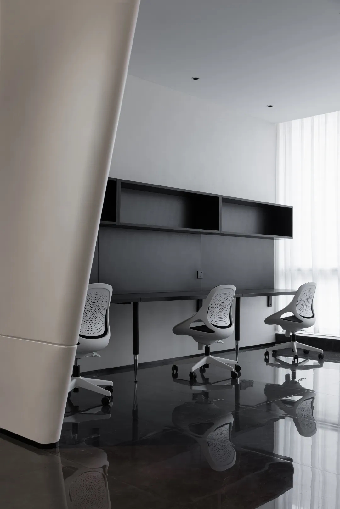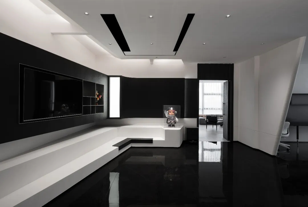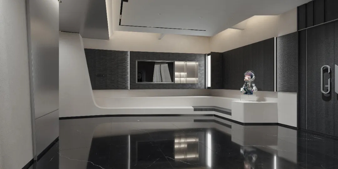 顺着黑色背景木饰面的脉络,人的视线被延伸到“城市会客厅”。我们不希望在“城市会客厅”中出现冰冷传统的会议桌,设计主理人的办公桌也变成了长达4米的多功能桌,因为我们更希望客户能在有生活感的空间中,随性的姿态下,聆听我们的设计汇报,也可以很惬意地和我们对坐长桌,谈心品茶。