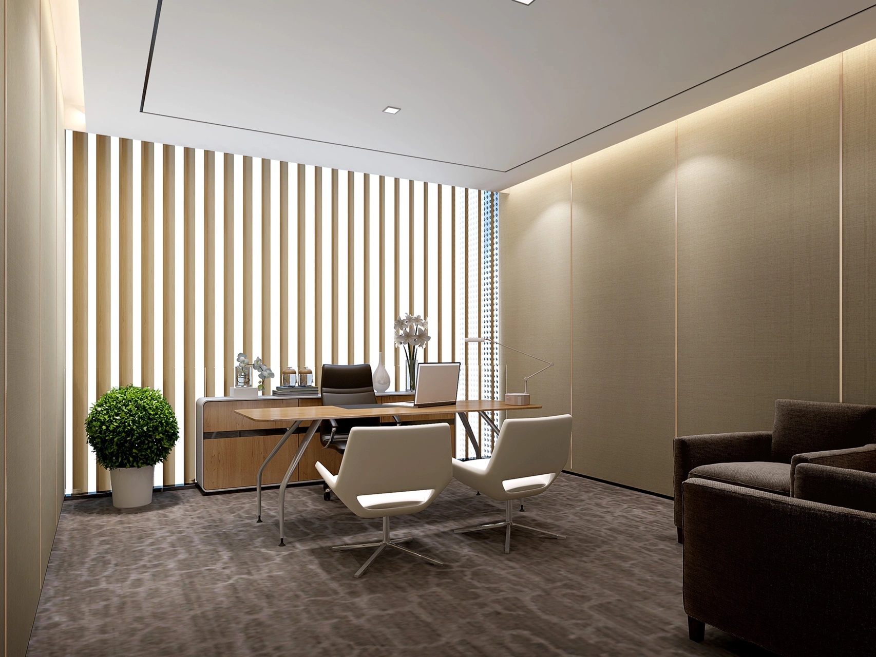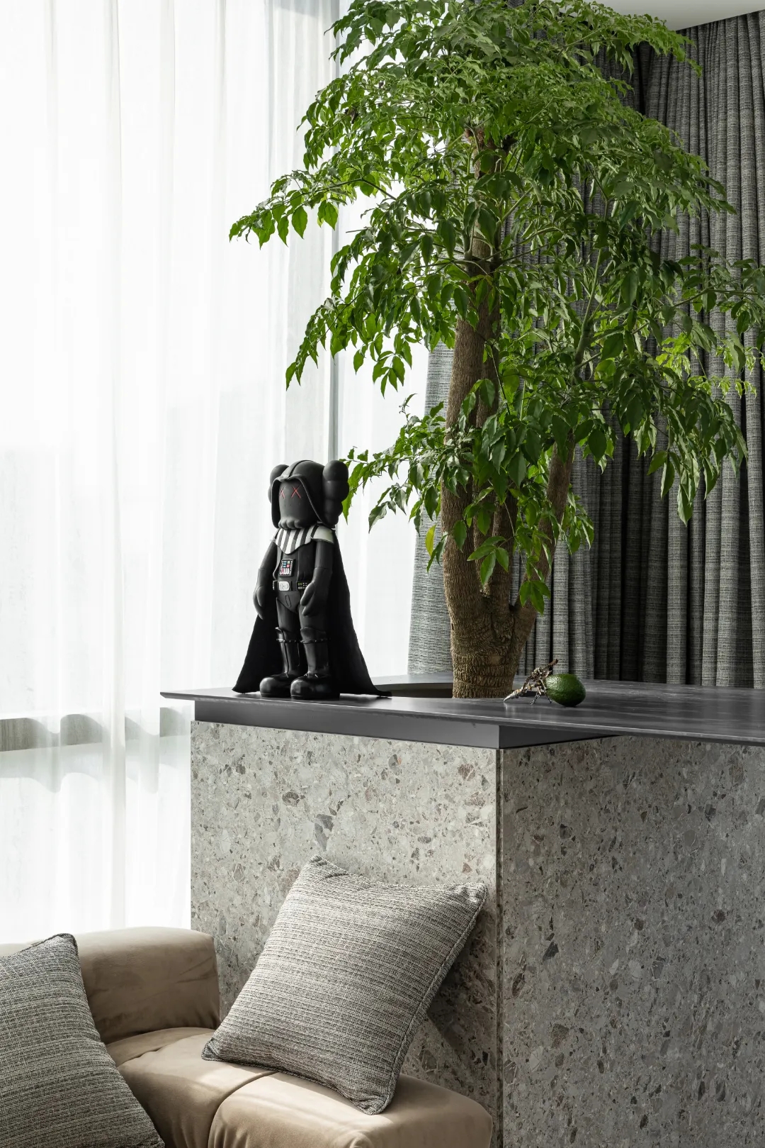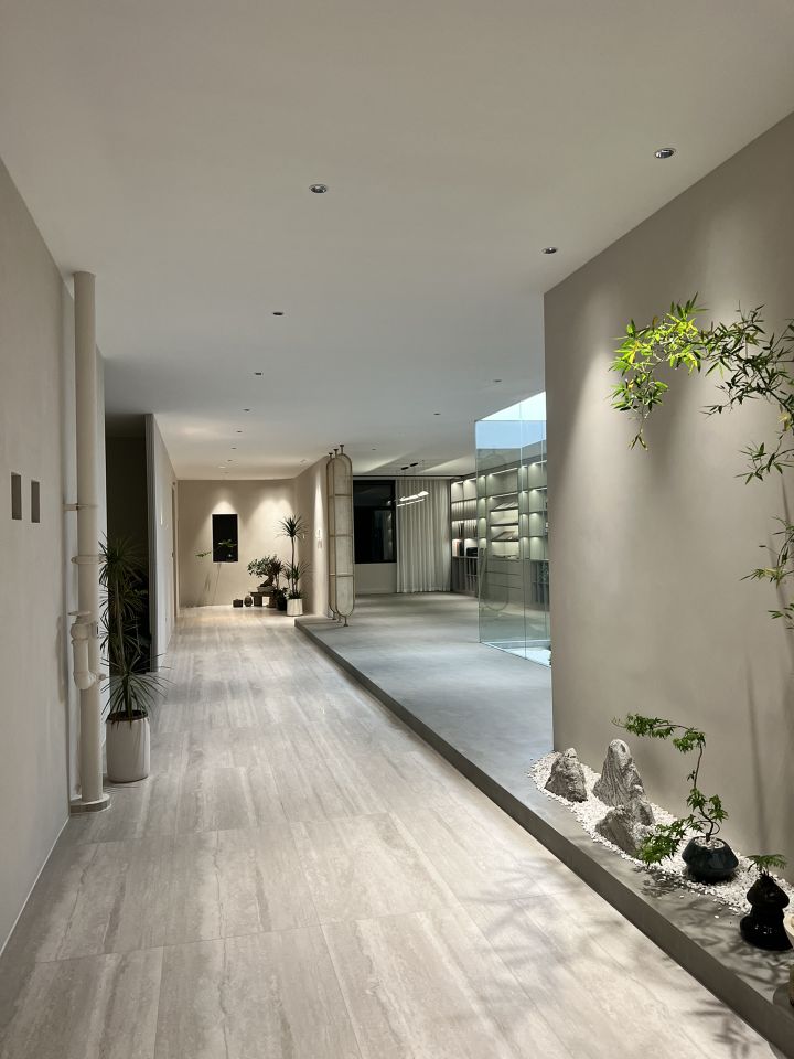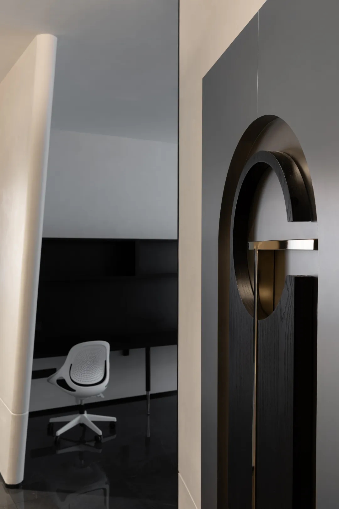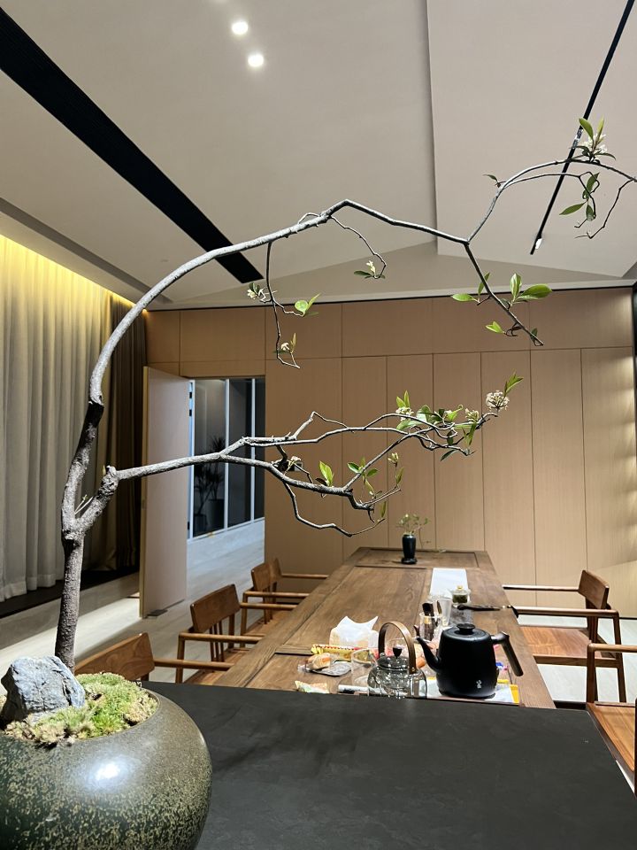 顺着黑色背景木饰面的脉络,人的视线被延伸到“城市会客厅”。我们不希望在“城市会客厅”中出现冰冷传统的会议桌,设计主理人的办公桌也变成了长达4米的多功能桌,因为我们更希望客户能在有生活感的空间中,随性的姿态下,聆听我们的设计汇报,也可以很惬意地和我们对坐长桌,谈心品茶。
