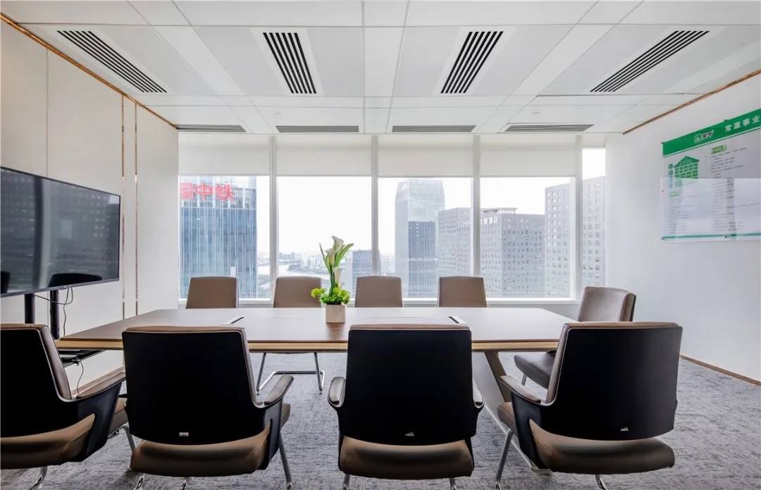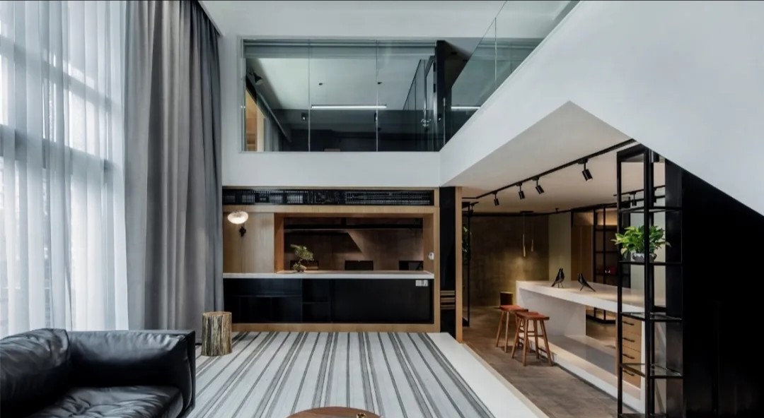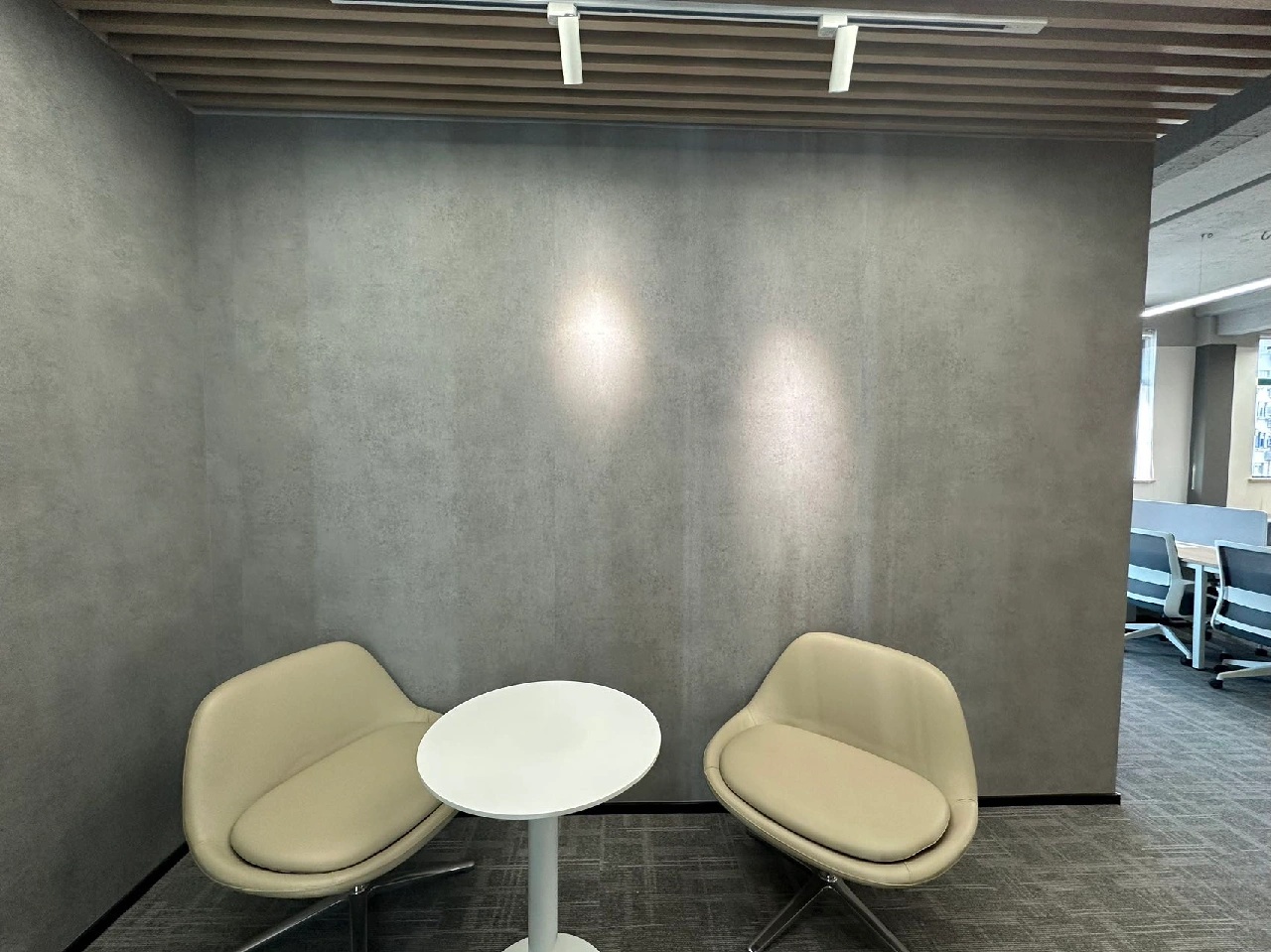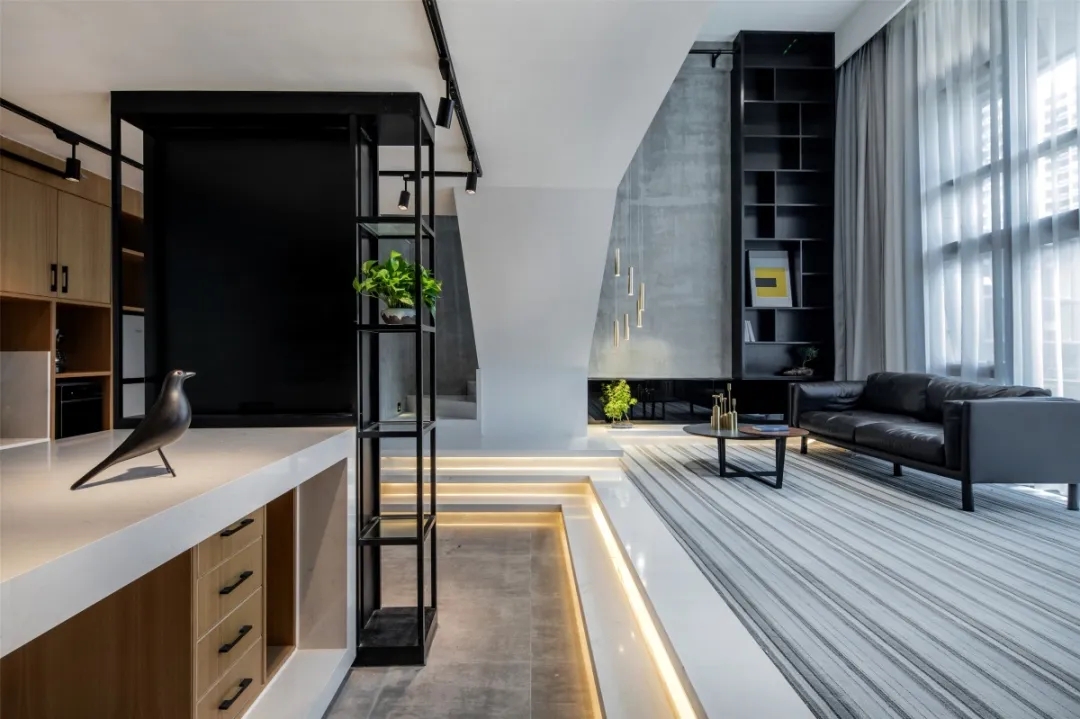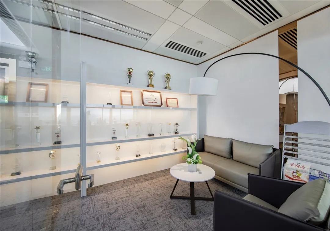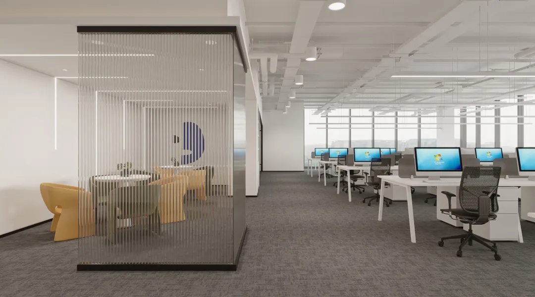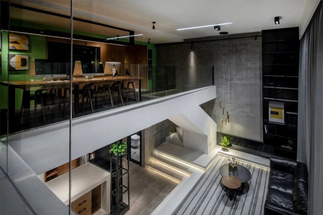 设计师以富有情绪节奏感的手法重塑空间形态,办公区界限分明的顶面设计理清氛围秩序,以质感灰白色结构堆叠,各部分体块有序铺陈。小型会议洽谈区外立面采用玻璃材质,透过玻璃外立面的渗透与折叠,洽谈区域更显开放自然。