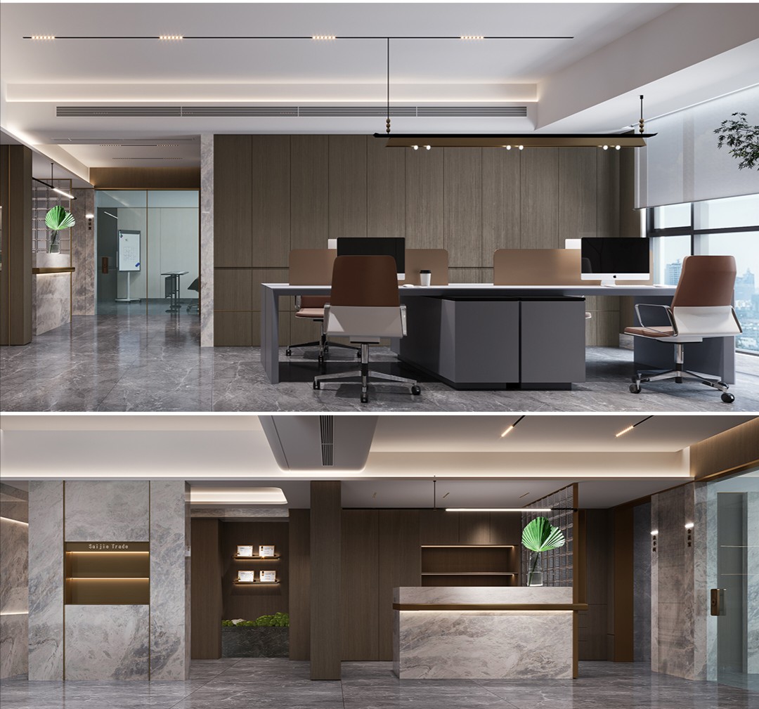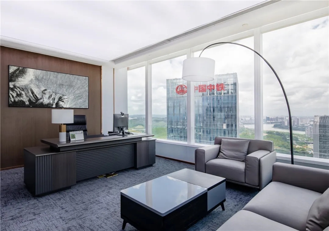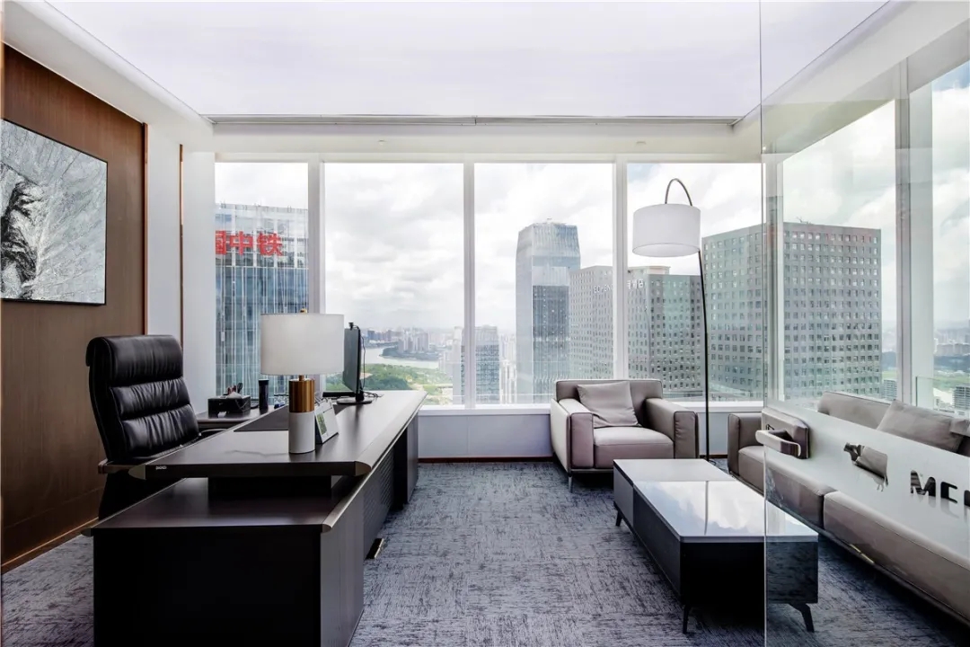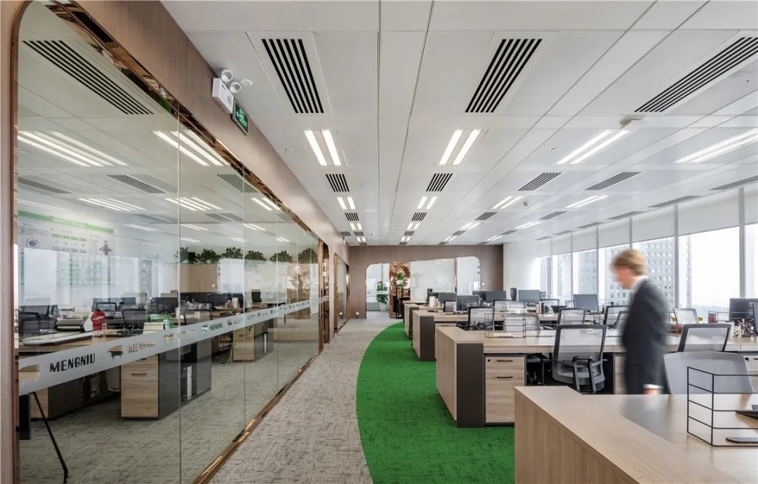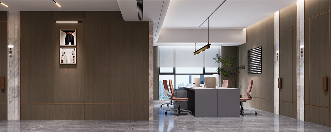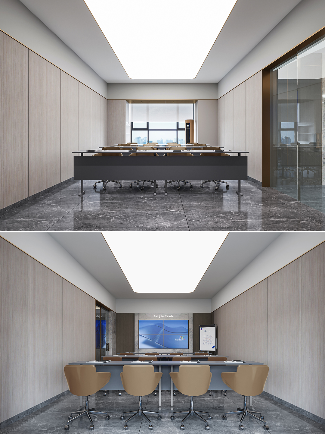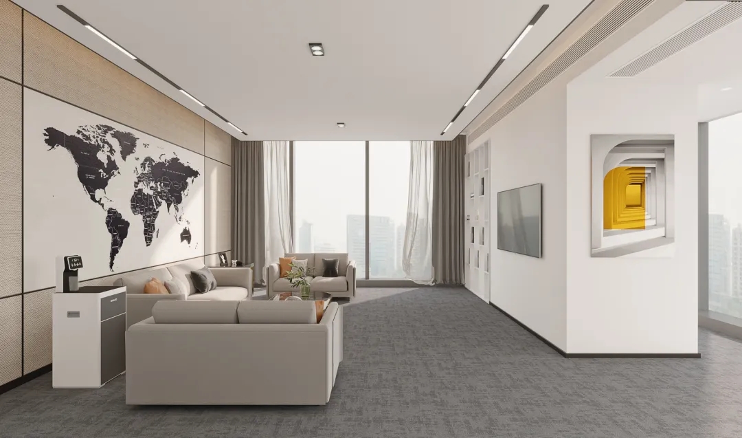 设计师以富有情绪节奏感的手法重塑空间形态,办公区界限分明的顶面设计理清氛围秩序,以质感灰白色结构堆叠,各部分体块有序铺陈。小型会议洽谈区外立面采用玻璃材质,透过玻璃外立面的渗透与折叠,洽谈区域更显开放自然。