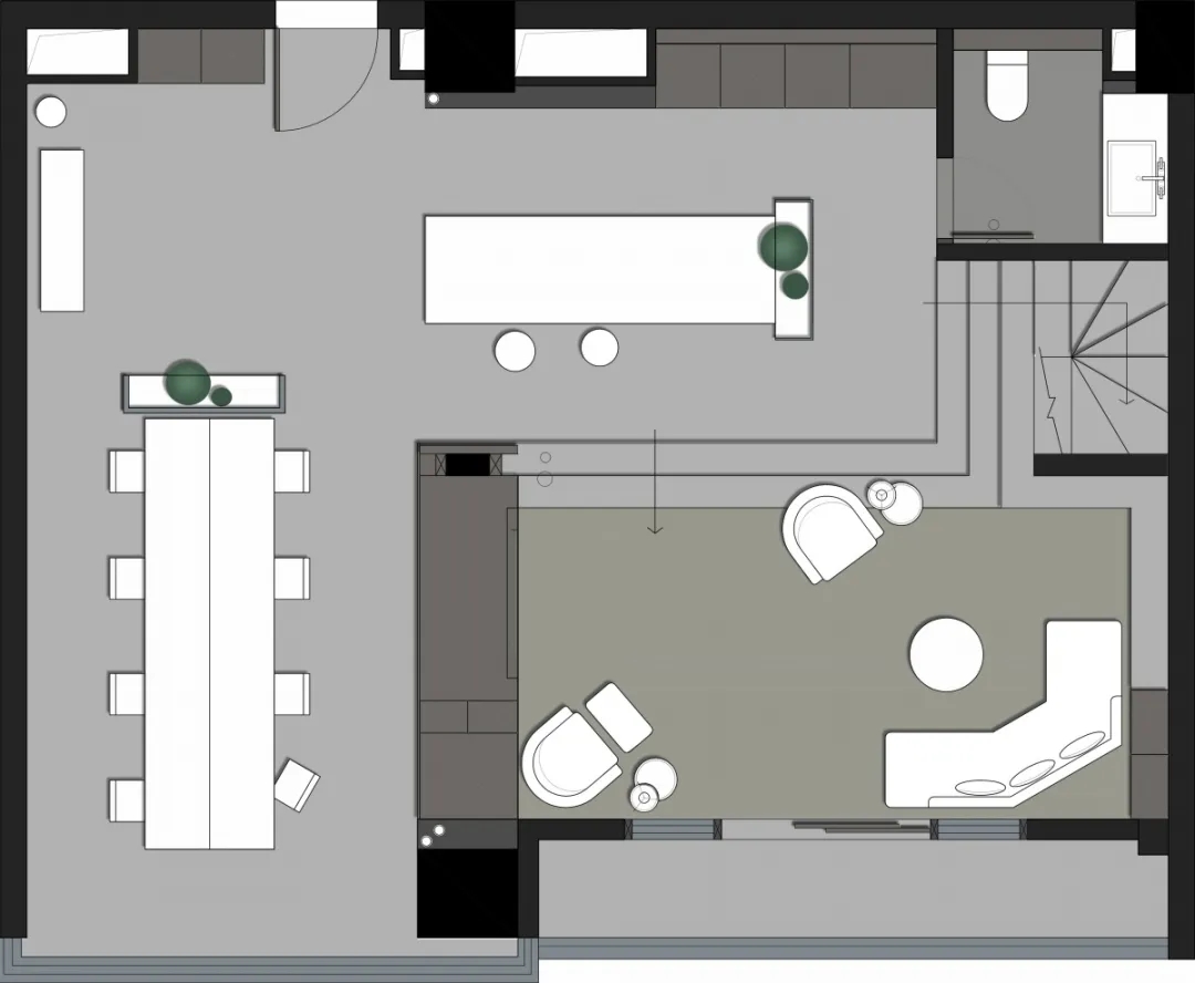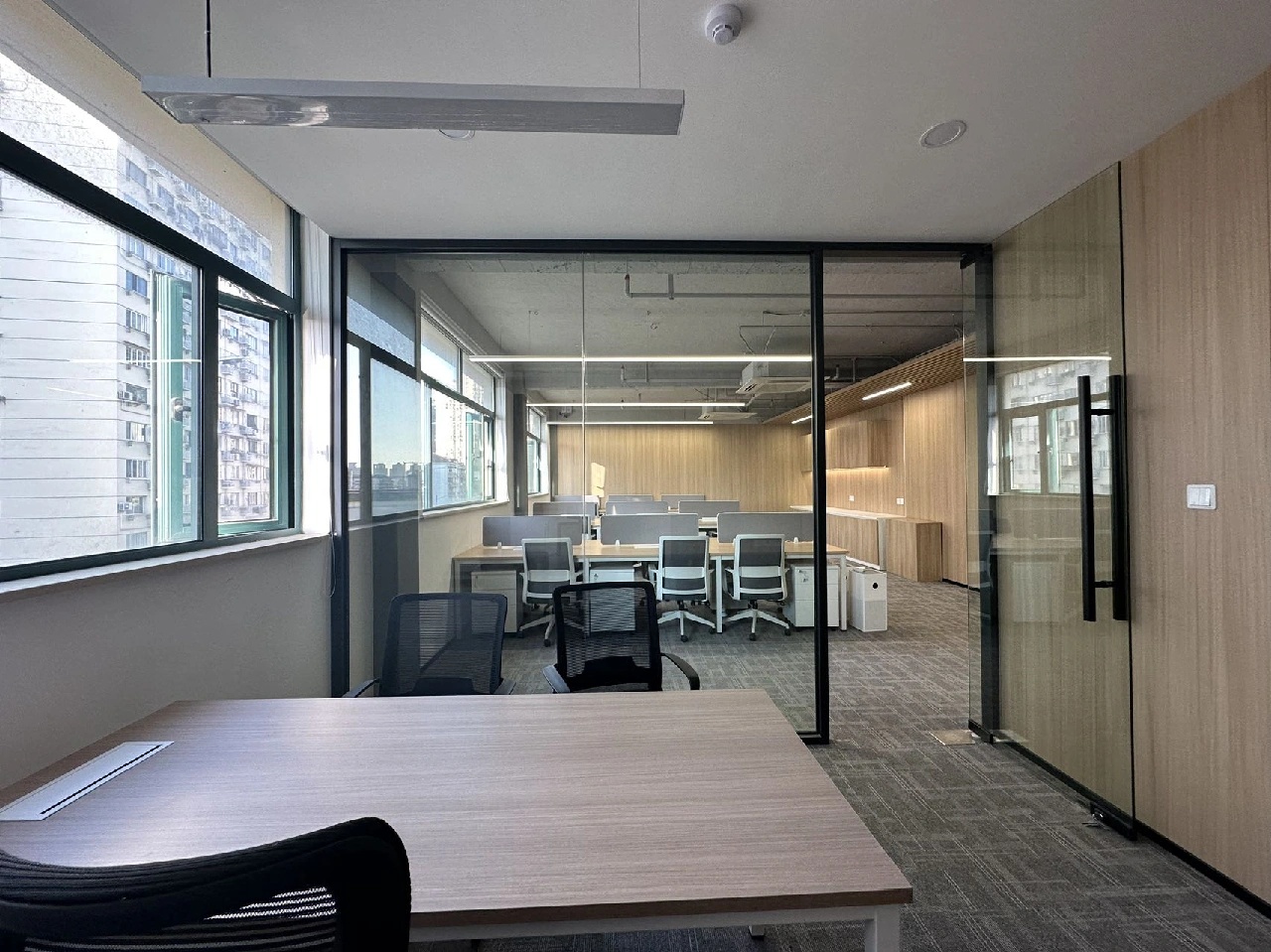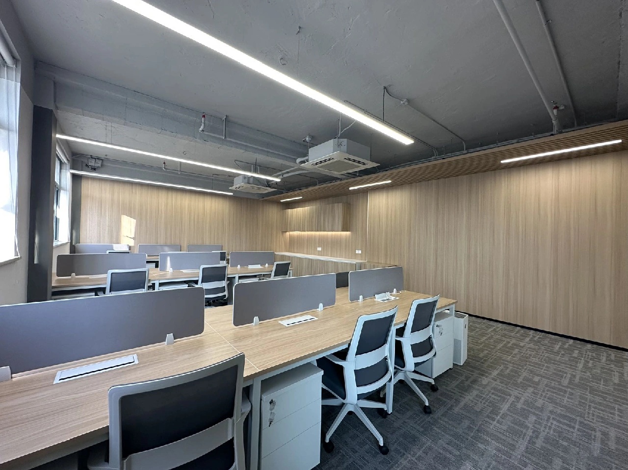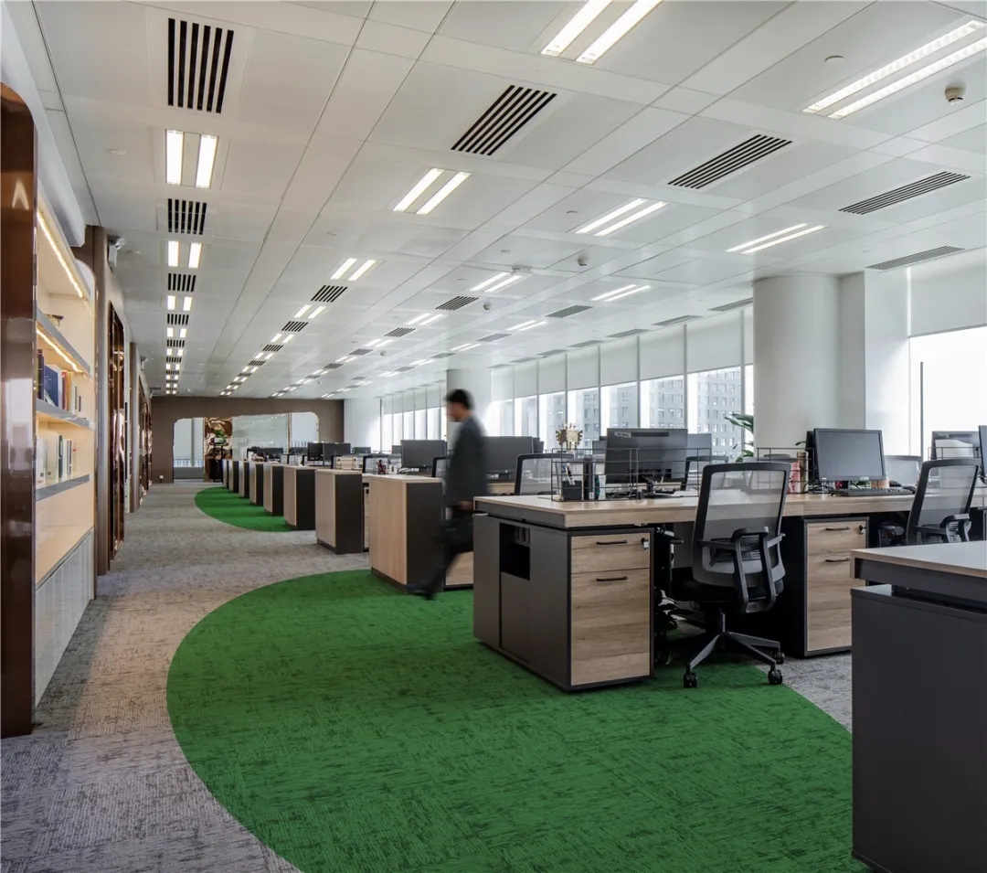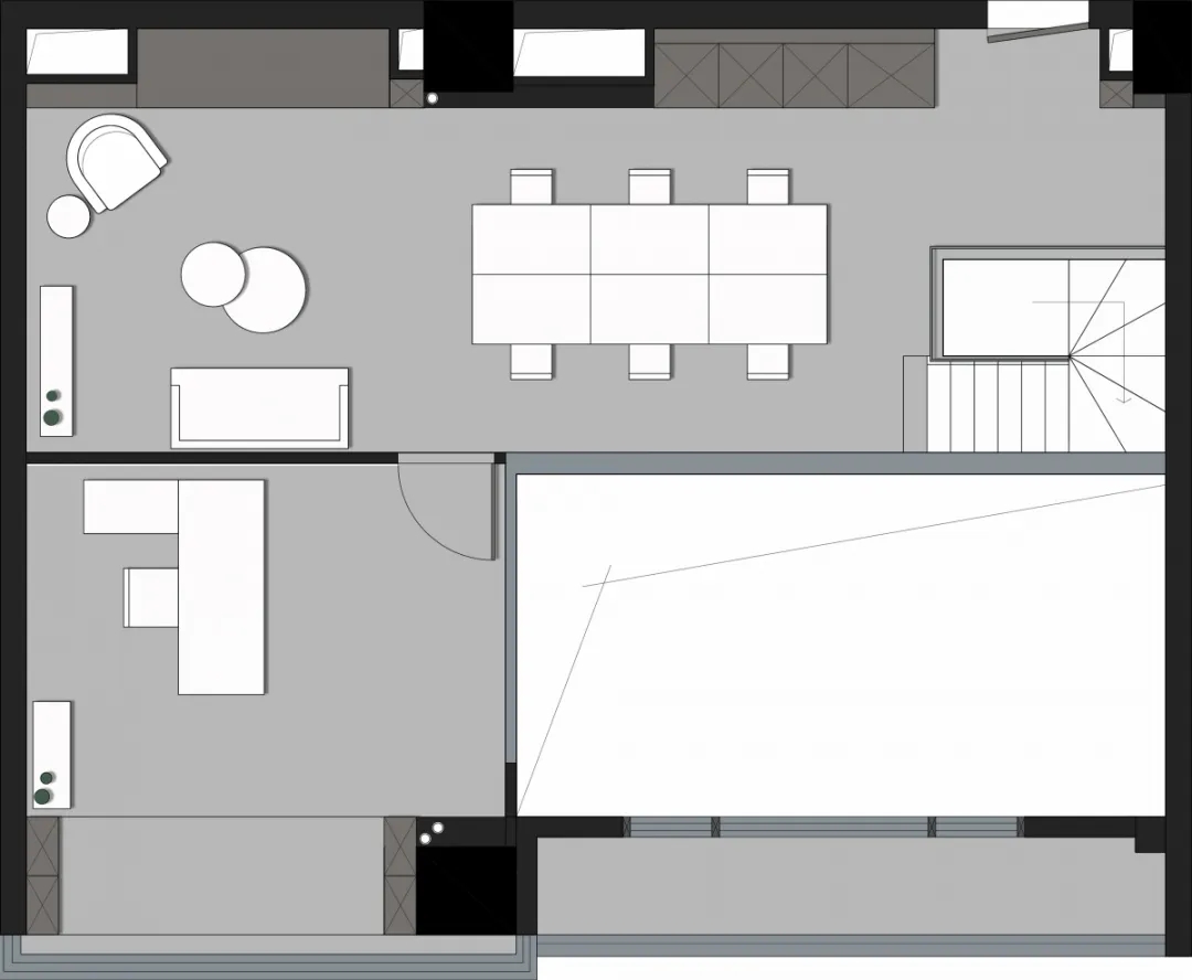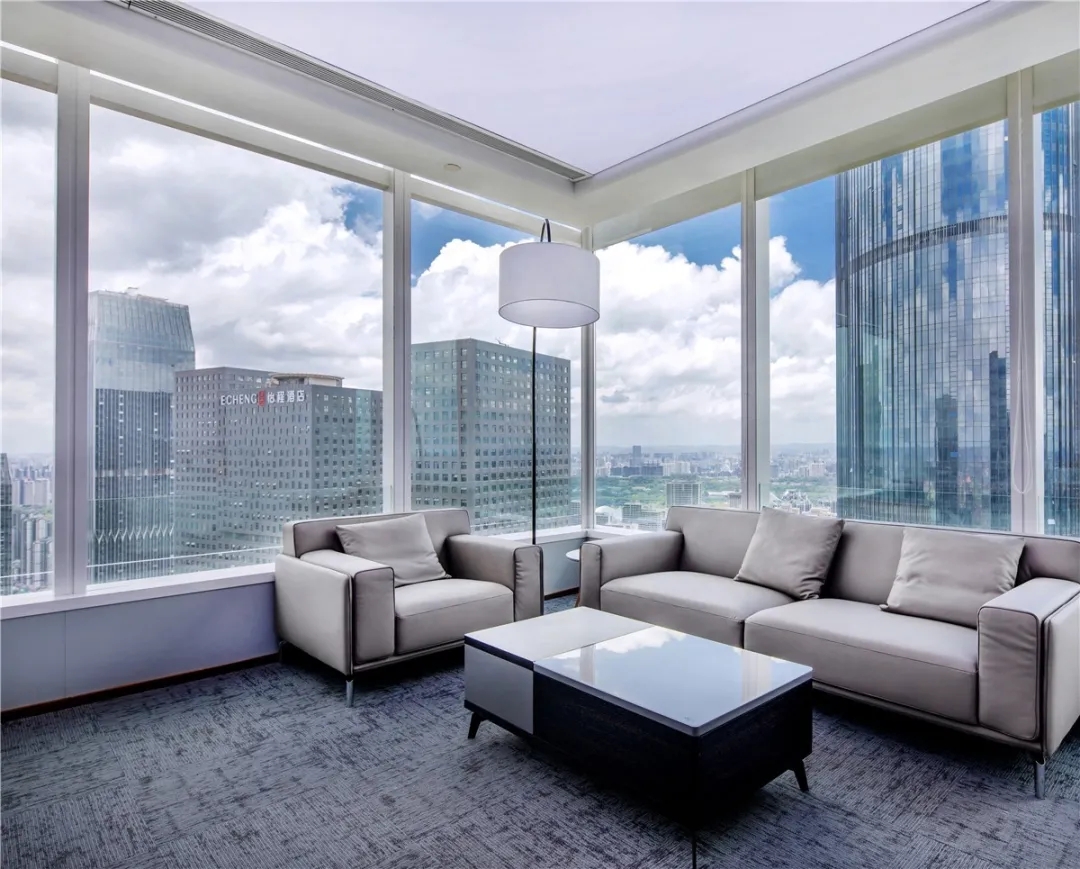 设计师以富有情绪节奏感的手法重塑空间形态,办公区界限分明的顶面设计理清氛围秩序,以质感灰白色结构堆叠,各部分体块有序铺陈。小型会议洽谈区外立面采用玻璃材质,透过玻璃外立面的渗透与折叠,洽谈区域更显开放自然。