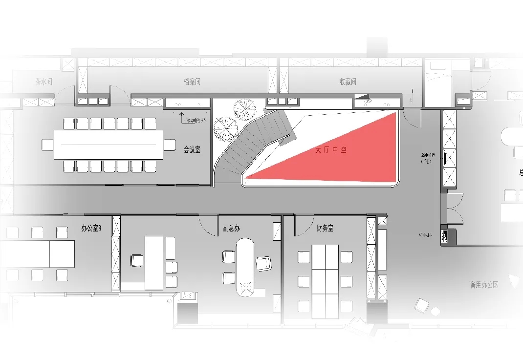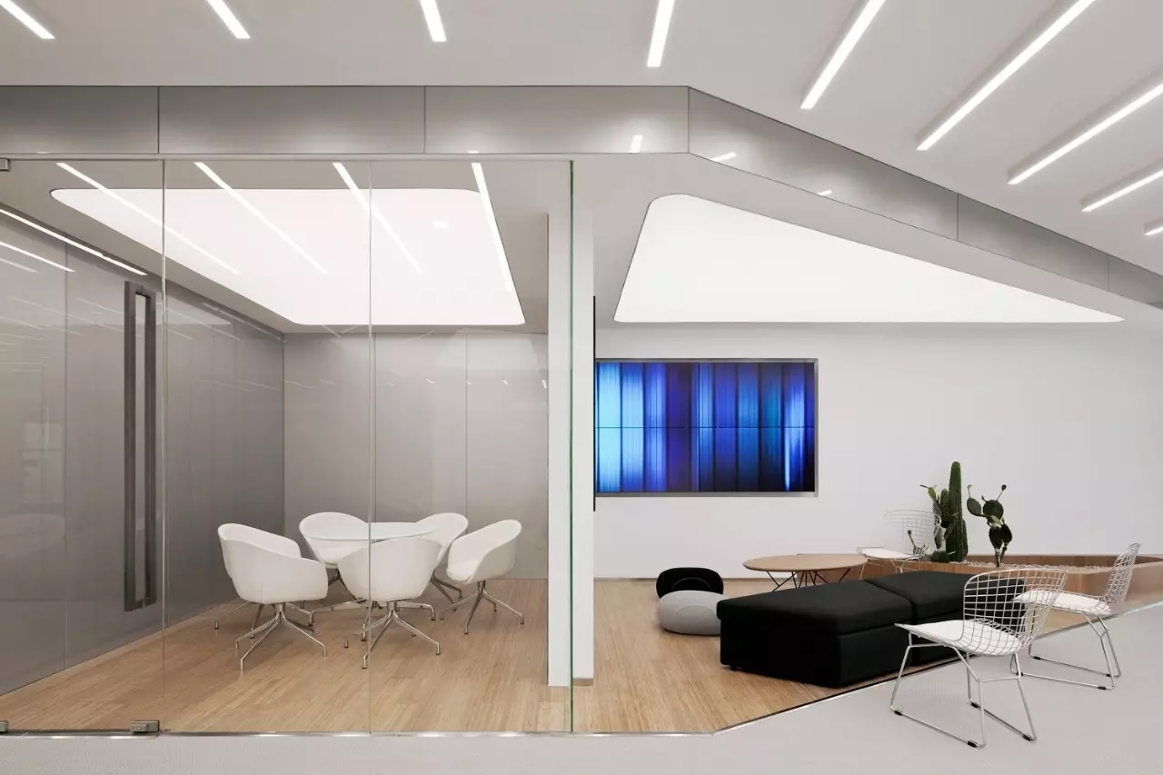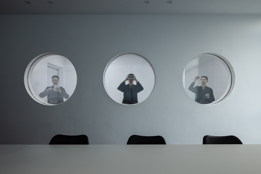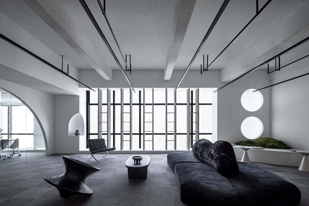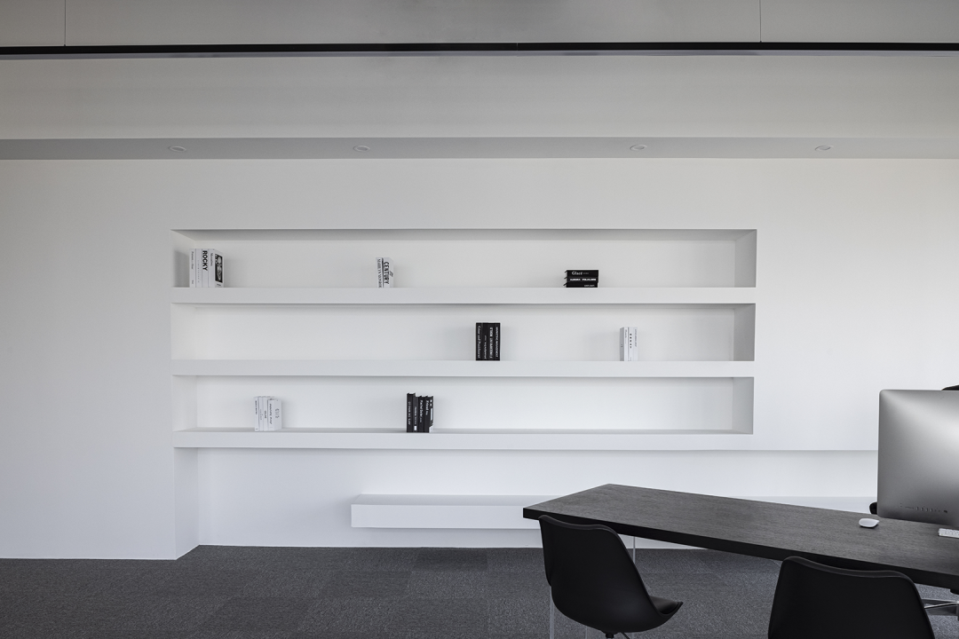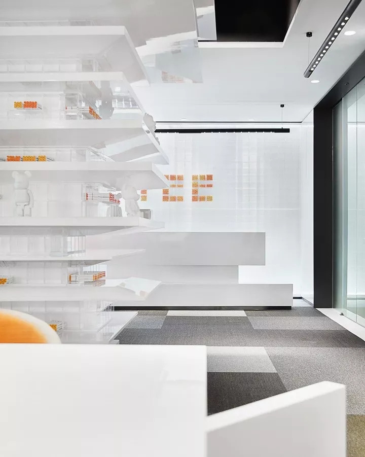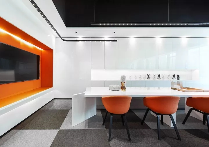 设计师将这个空间设想、定义为一个小型的,资本不厚,务求节约但又好用,人数控制在二十人以内的常规的小型文创类工作室。利用“某某熊”造型和变化的橙色为设计中调节空间氛围的元素,以大面积的白通过形态的不同在灯光下形成多元层次,辅以细微变化的深灰,建立空间秩序。