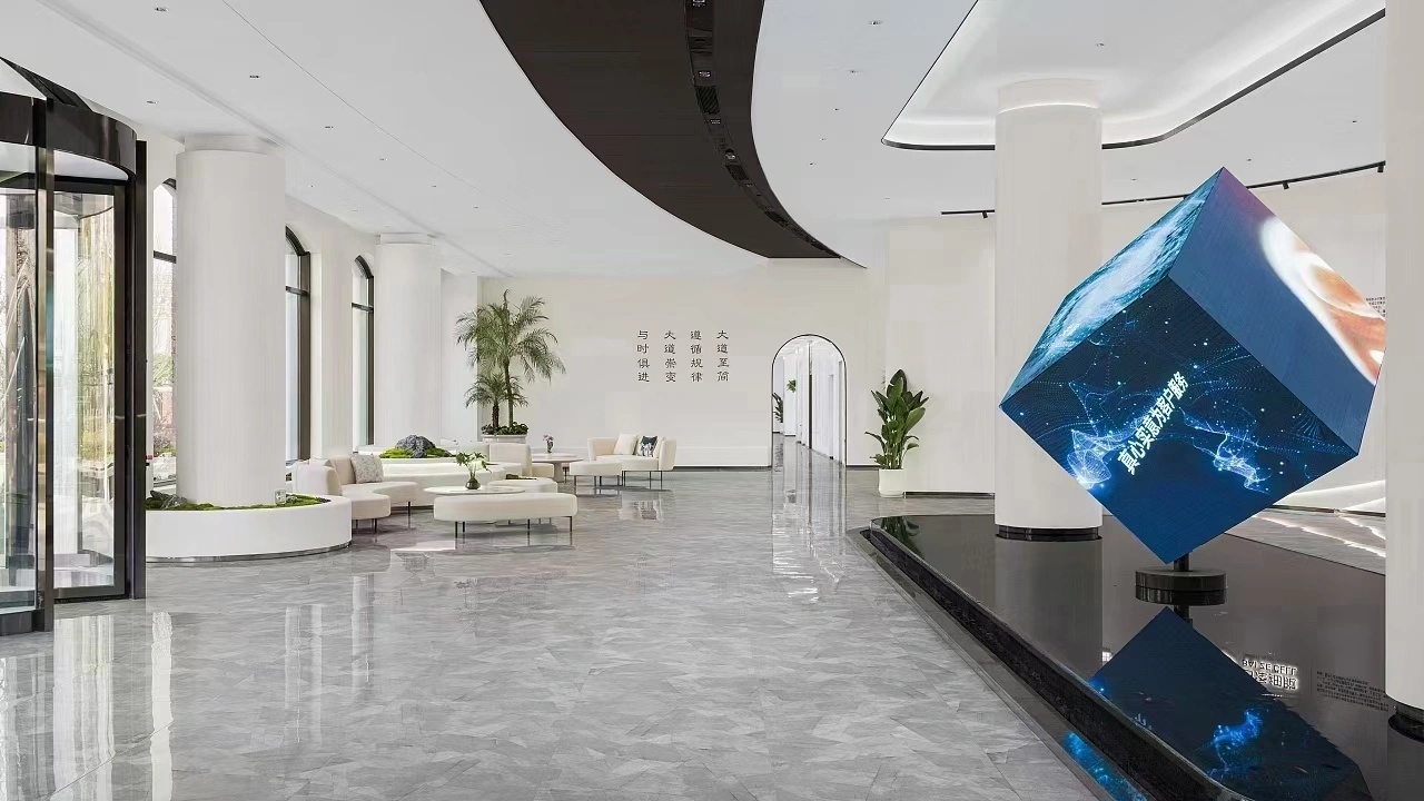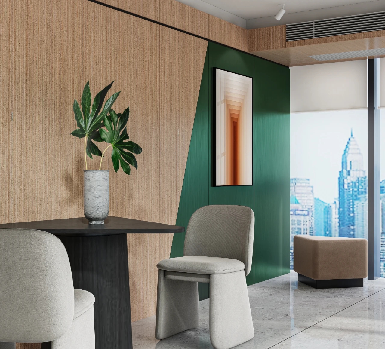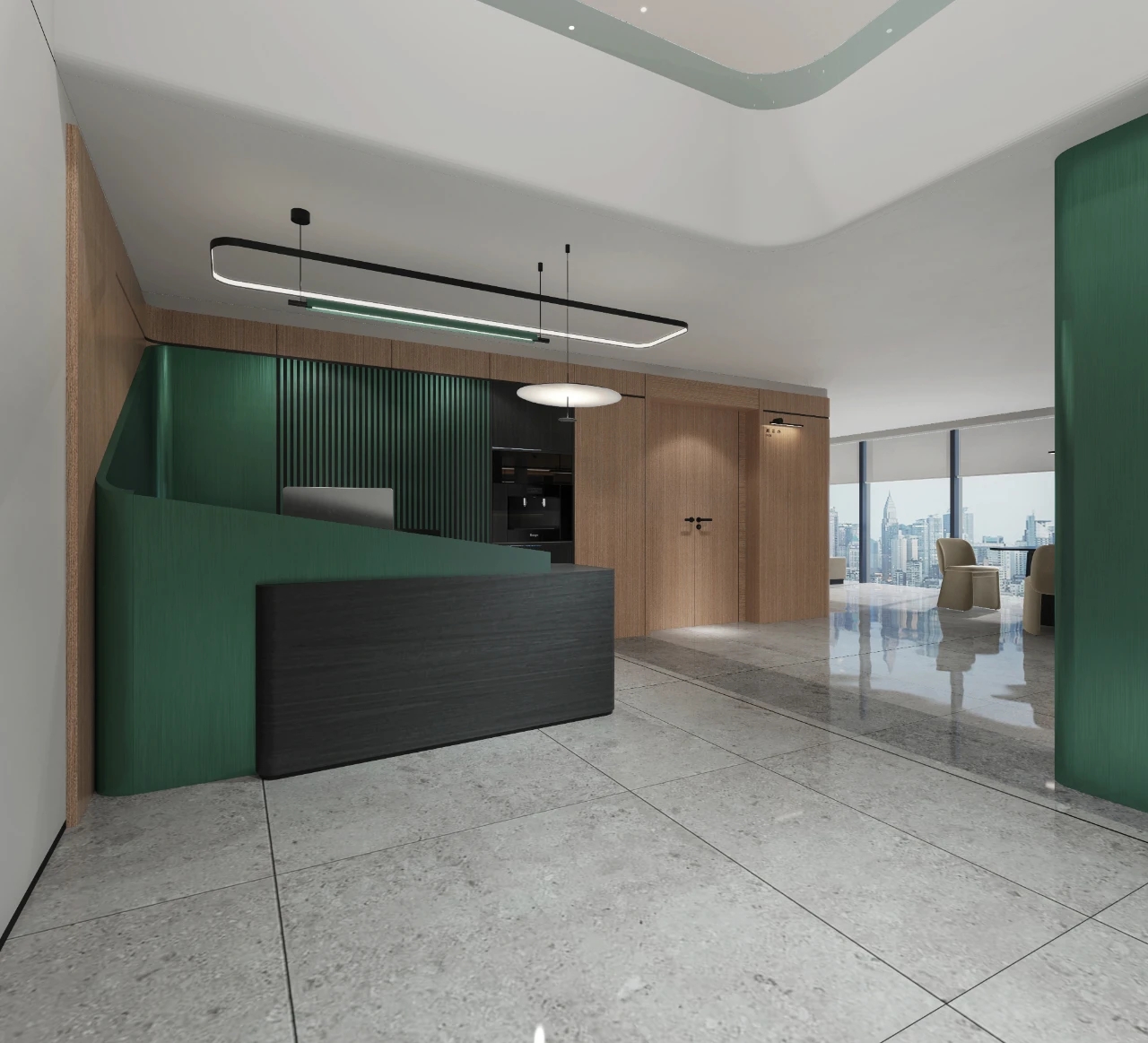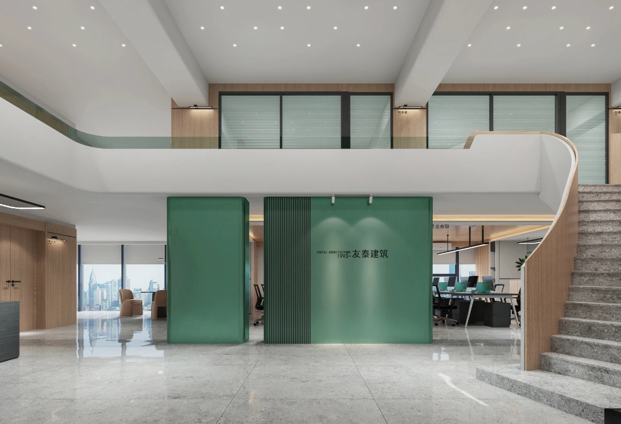 三角形的概念被巧妙地化用于空间,楼梯与栏杆和原有的墙体围成一个三角,门厅背景墙的造型和色彩也同样对此做出了隐喻。