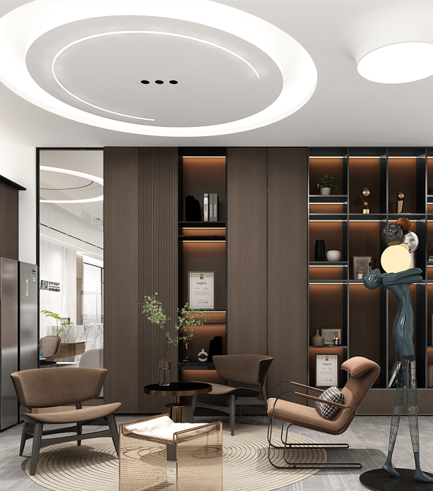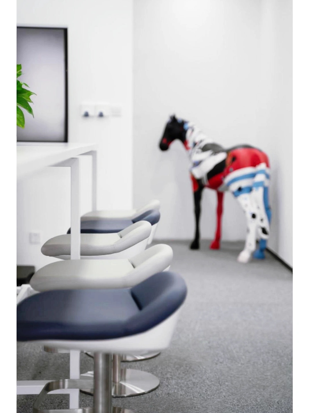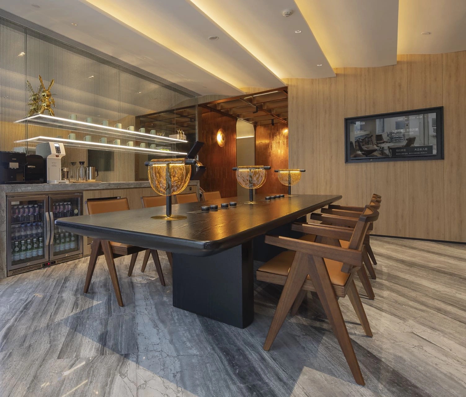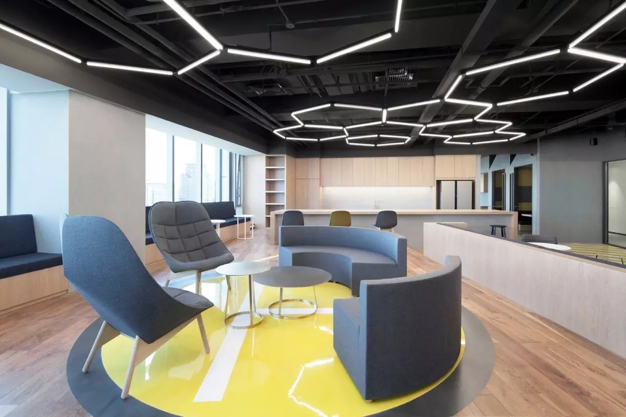 深灰色的裸顶天花完美的衬托出其下错落有致的六边形装饰荧光灯管,偏都市及街头化的设计风格与空间中绿植的插入及运用打造了平衡和谐的设计美感,亦兼具人性化考量。入口大堂的悬挂自行车轮吊灯将自行车及其零部件从普通装饰上升到艺术装置的新高度,也再次印证了设计师特立独行、天马行空的设计哲学。