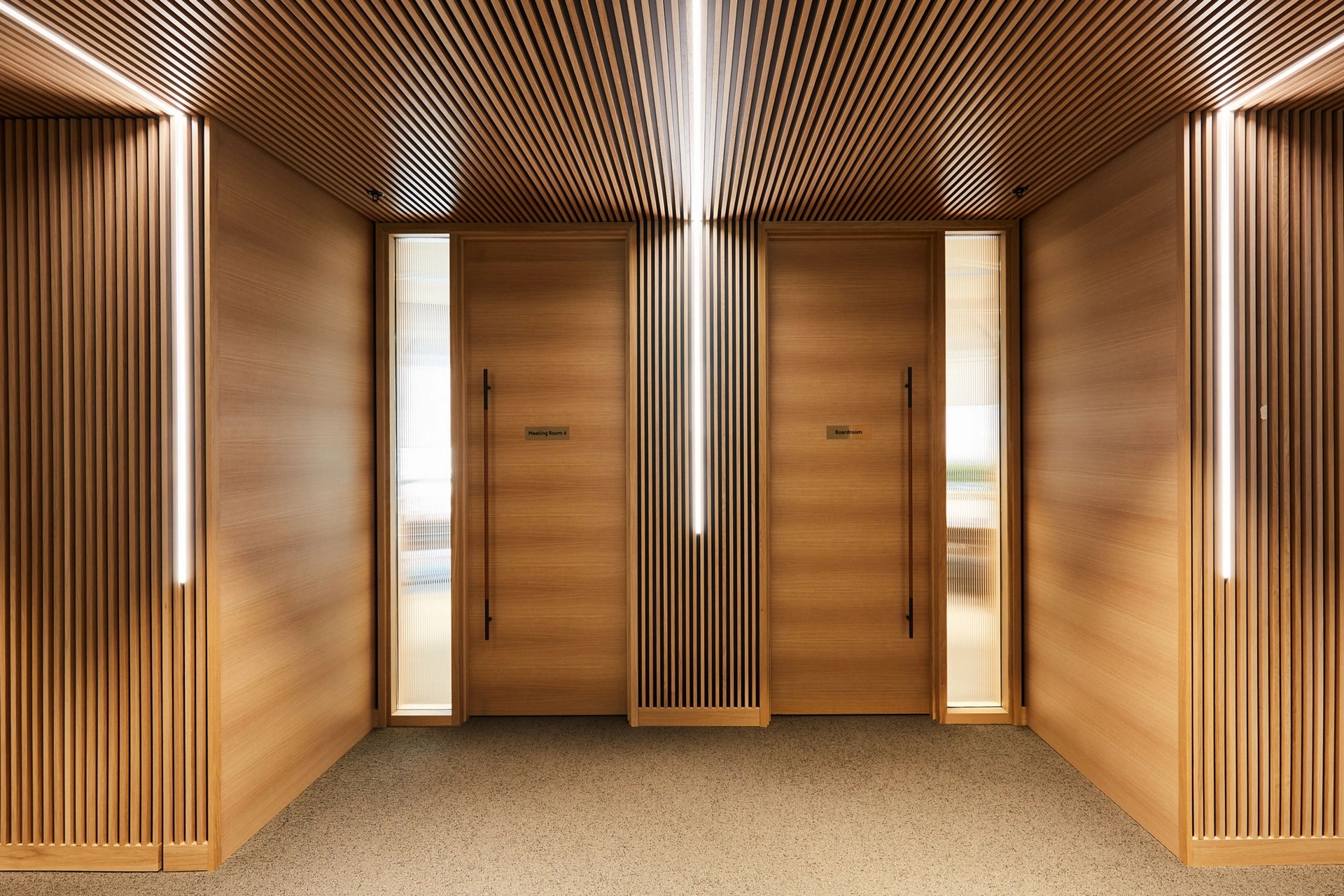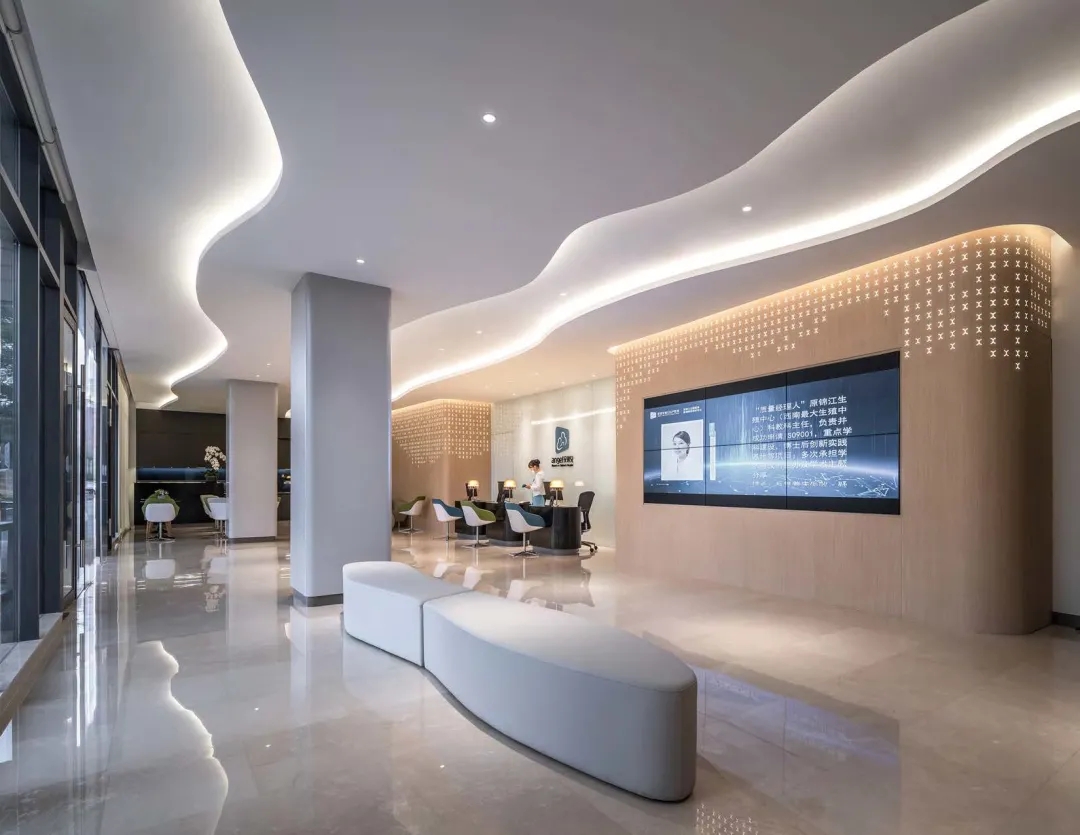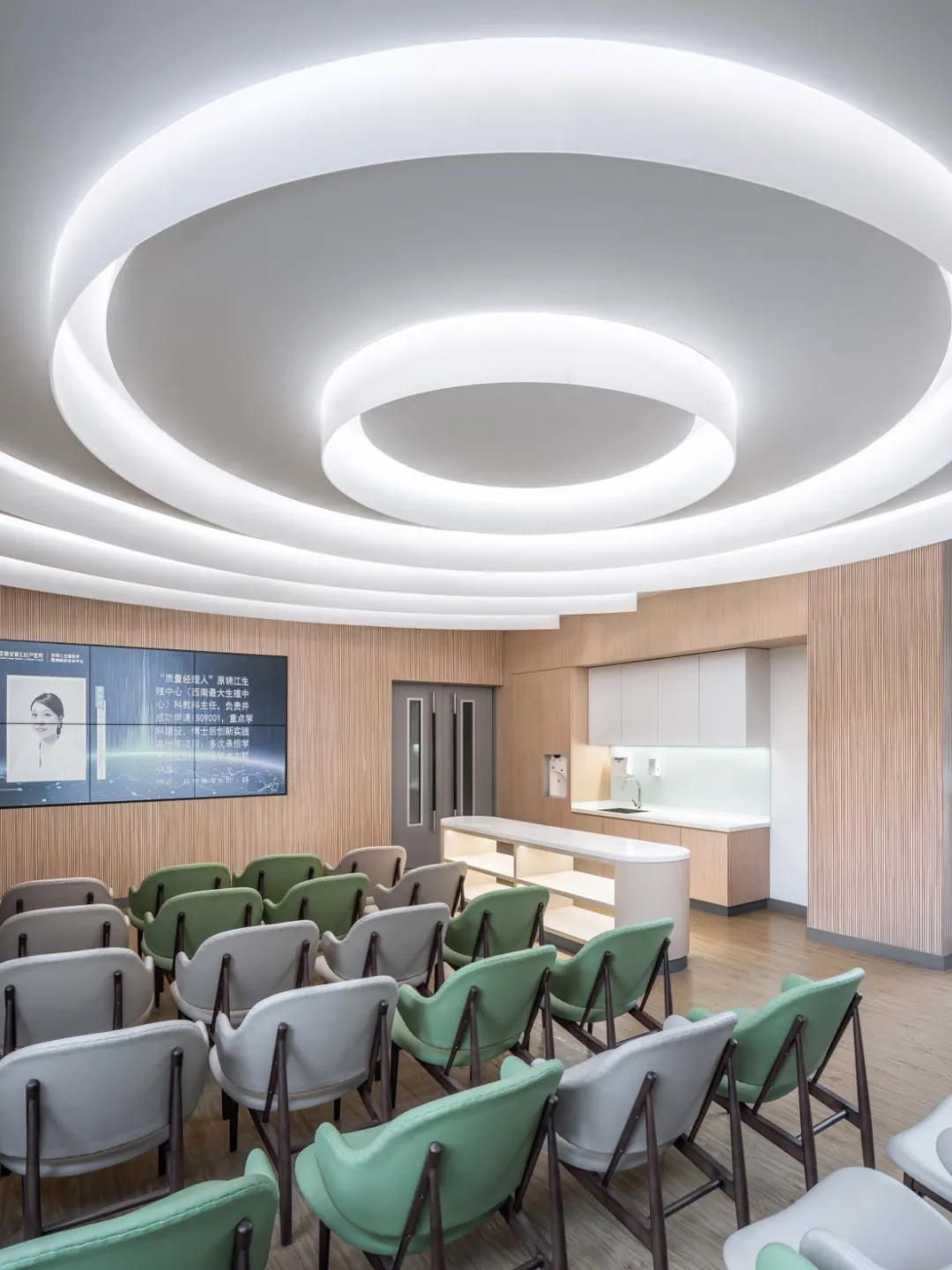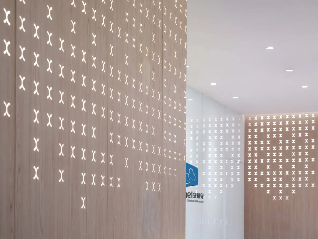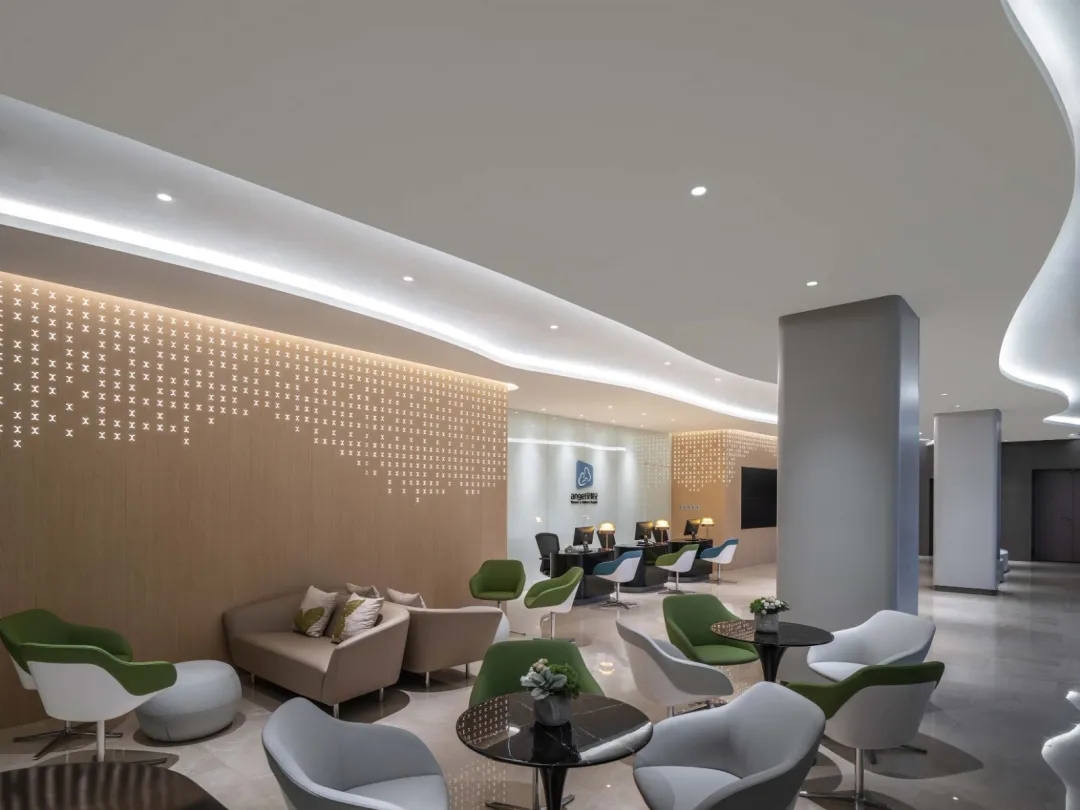 两片内凹的木饰面墙面如两片张开的翅膀,欢迎来访的客人。木饰面墙面上星星点点的X形发光图案,则如每年阳春三月成串悬挂在蝴蝶泉边合欢树上的翩翩蝴蝶。水流造型的天花穹顶贯穿整个大厅,通过大幅落地玻璃窗将自然光和户外景观引入,营造出人与自然的和谐统一。