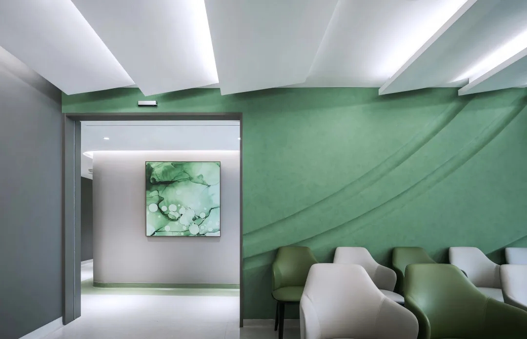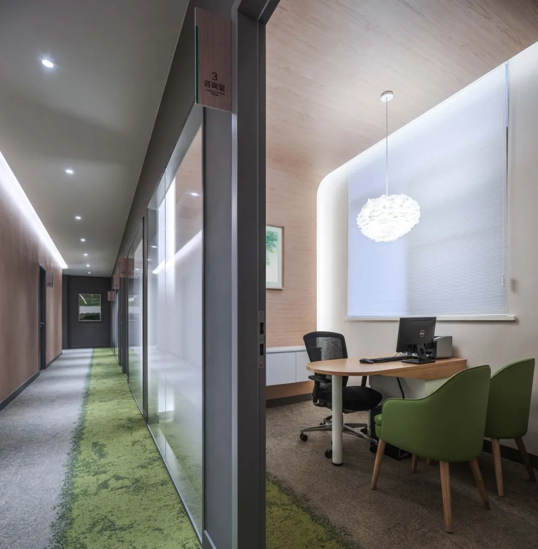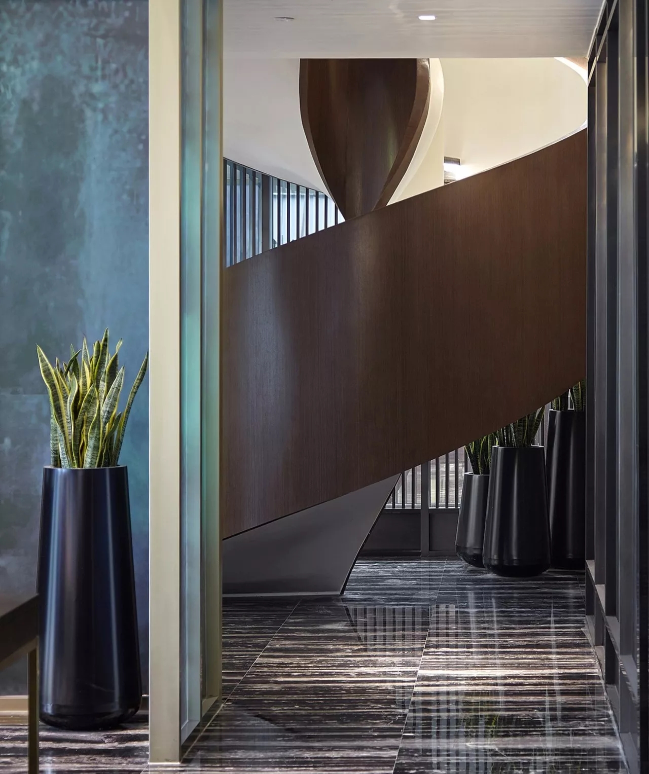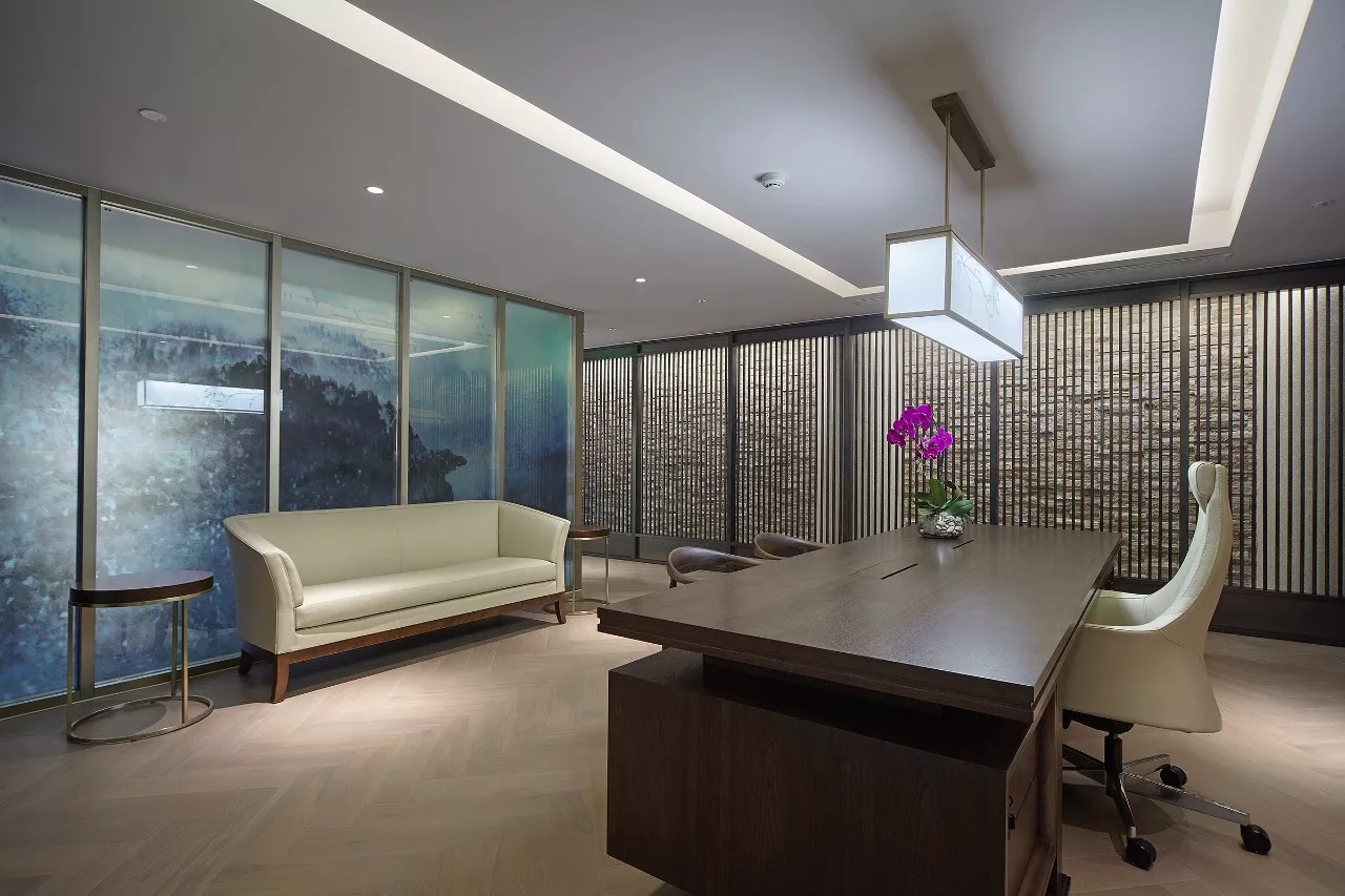 大厅以对称布置,具有强烈的仪式感和尊贵感。6米高的红酒柜和围合的玻璃屏风贯通一层和夹层,屏风图案为张大千表现重庆的泼墨青绿山水,笔墨间将当地的自然、文化特色融入极简的设计手法,进而生成大隐于市、隐于画境的现代空间。似静若动的落花吊灯在半开放空间内云影光驳,波光潋滟的流水地毯如时间在当下空间流动渗透。“宠辱不惊,看庭前花开花落;去留无意,望天空云卷云舒”设计师在装饰色彩上呼应张大千的青绿之美,光影流动间映照出山岚云雾、云水飞动的山城气韵。
