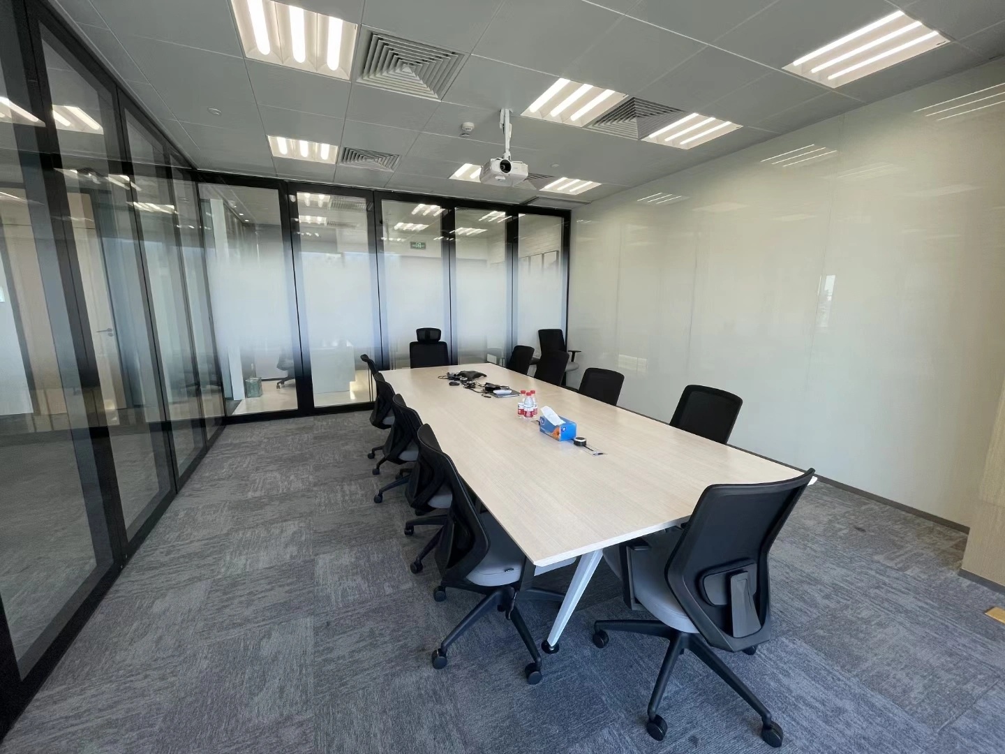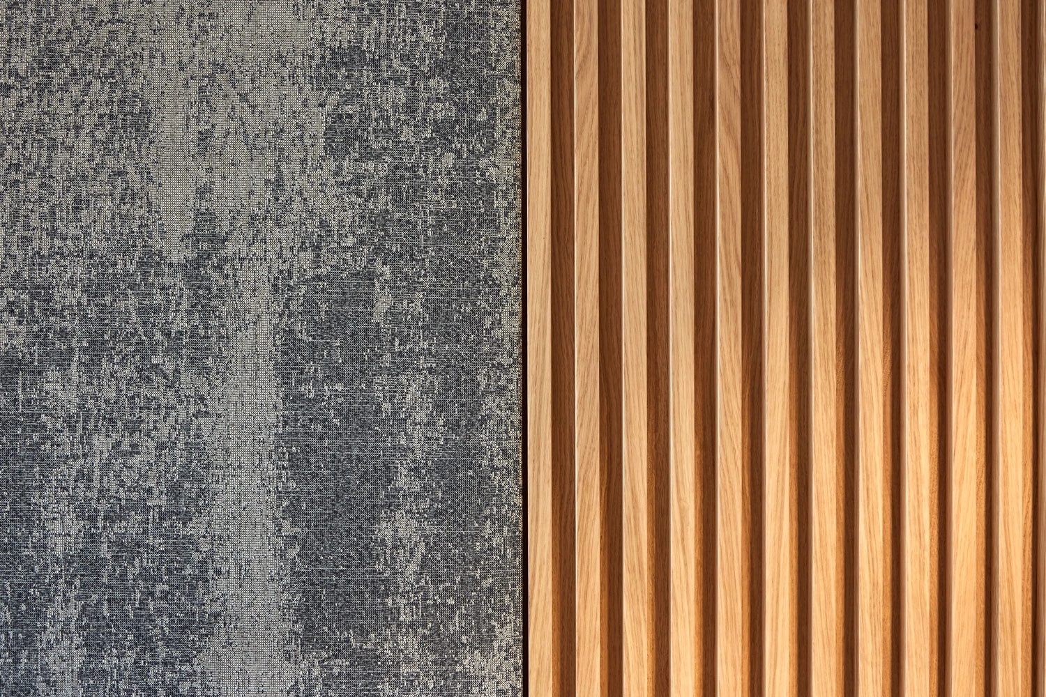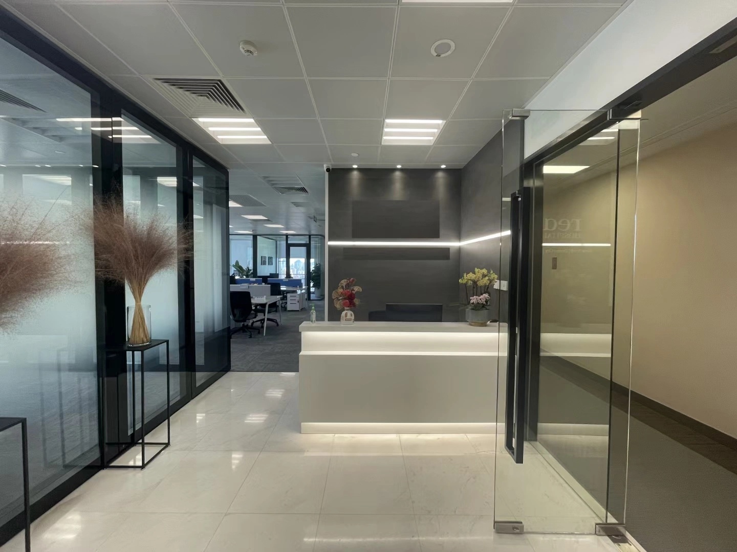 大厅以对称布置,具有强烈的仪式感和尊贵感。6米高的红酒柜和围合的玻璃屏风贯通一层和夹层,屏风图案为张大千表现重庆的泼墨青绿山水,笔墨间将当地的自然、文化特色融入极简的设计手法,进而生成大隐于市、隐于画境的现代空间。似静若动的落花吊灯在半开放空间内云影光驳,波光潋滟的流水地毯如时间在当下空间流动渗透。“宠辱不惊,看庭前花开花落;去留无意,望天空云卷云舒”设计师在装饰色彩上呼应张大千的青绿之美,光影流动间映照出山岚云雾、云水飞动的山城气韵。