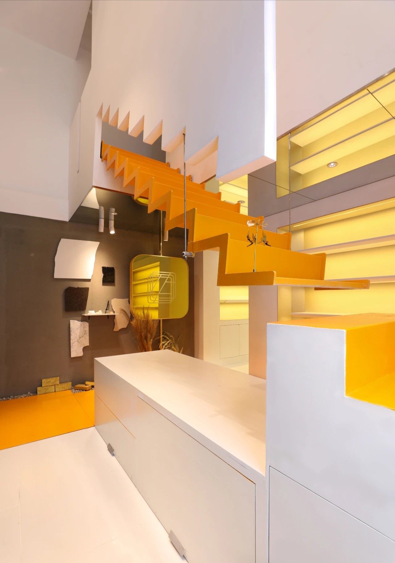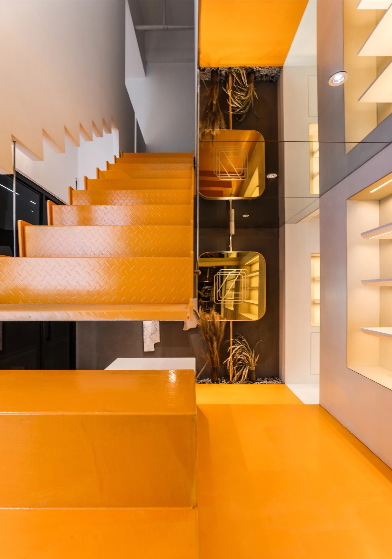 悬浮楼梯通过铁板折弯塑造出简约干净的线条感,轻盈的造型映衬出品牌的艺术感特质。方形“天窗“让一二层过度区域成为一个趣味记忆点,配合灯光, 留下了光影轨迹,光成为了窗景的主角。