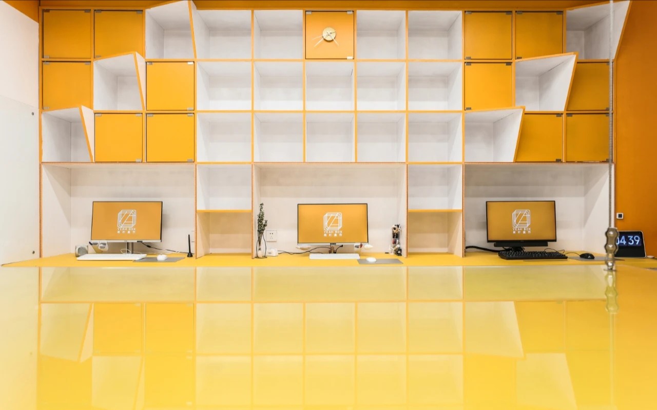 橙色为空间的主色调,黄色和灰色为过渡色。暖色调组合营造出年轻活泼的基调,凸显出品牌的独特气质。