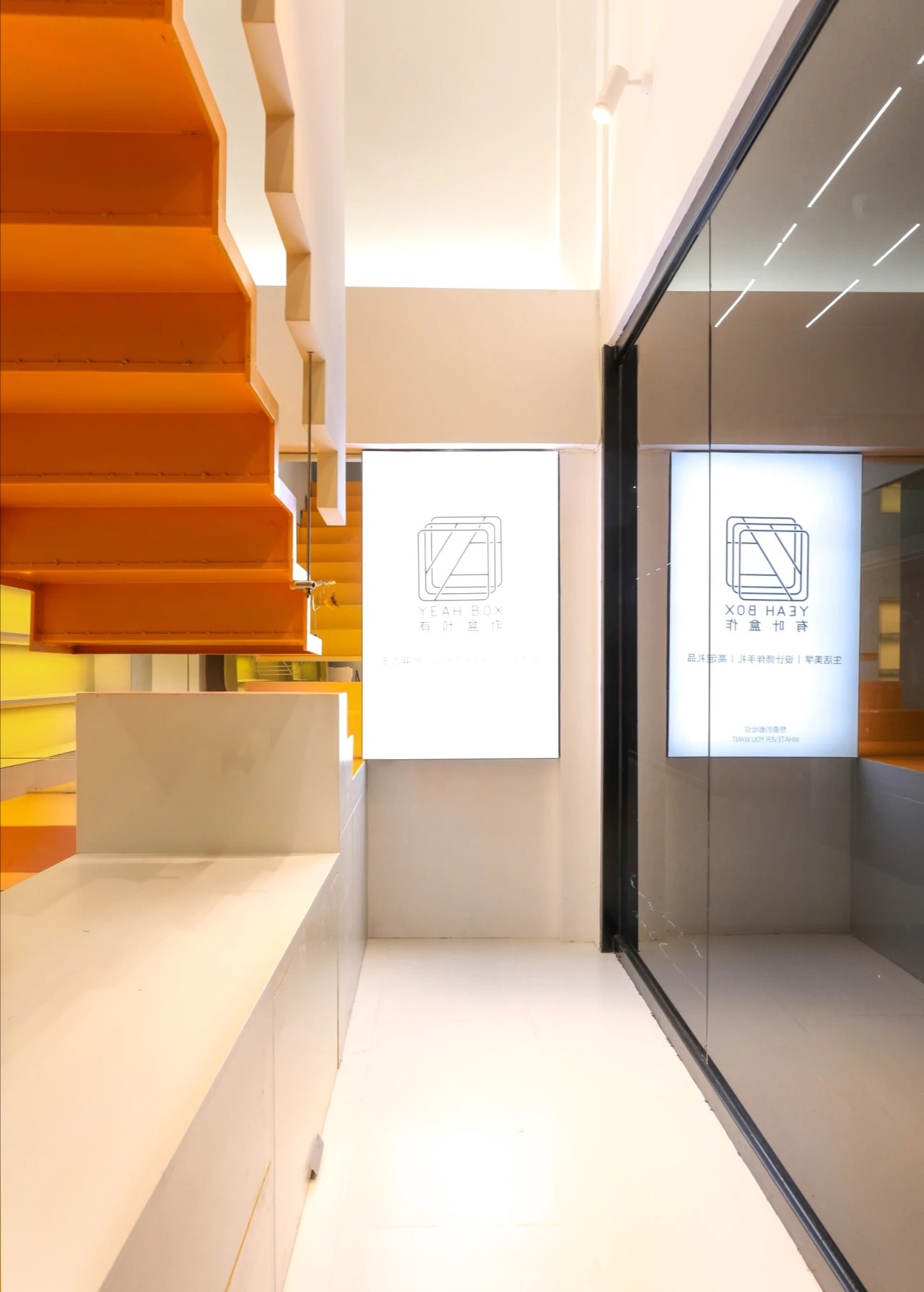 入口处的橙色花纹铁板让来访者与这个空间的第一次互动更颇具仪式感,开放的入口设计,橱窗与展示区让人对品牌内容有初步的印象。