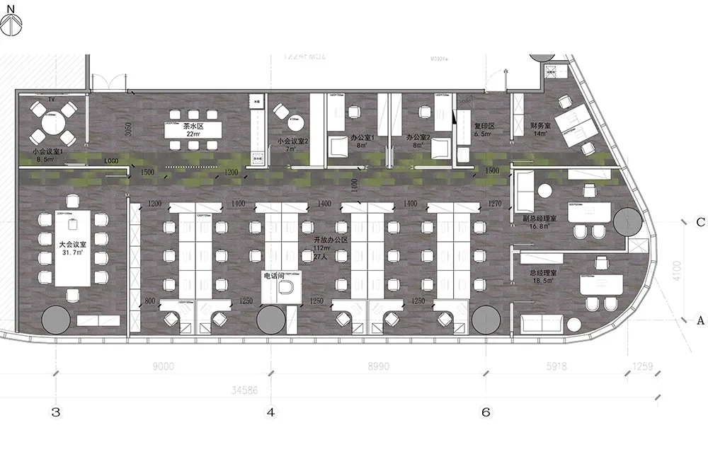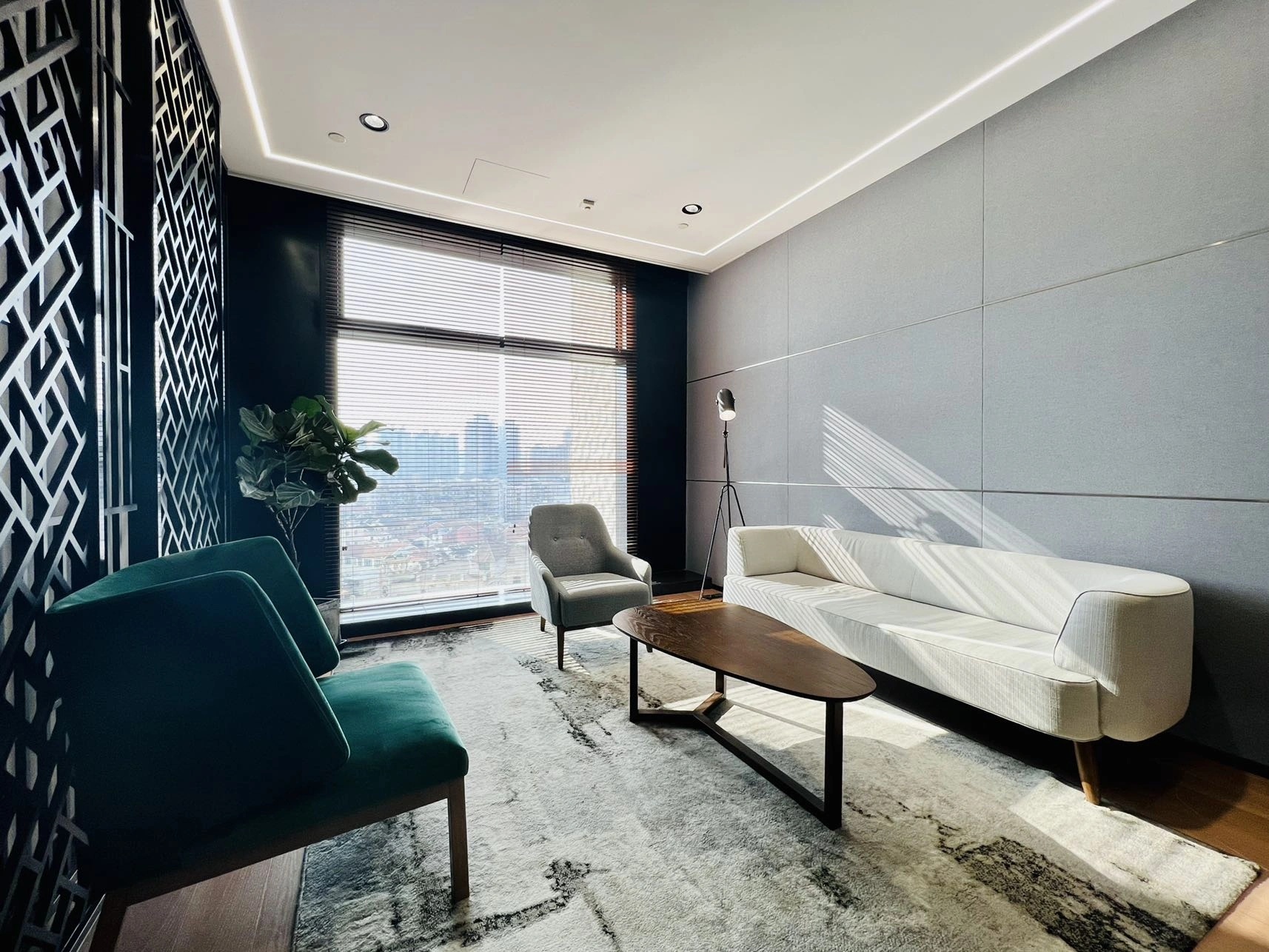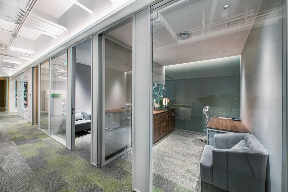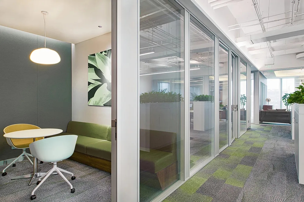 工作区随处可见的绿植可以有效净化室内空气,吸收有害气体,提升办公空间“呼吸感”,为员工赋能,提升工作效率。设计以Milliken的Passage系列地毯中的绿色部分强调并贯穿整个办公室地面,灵动的色彩和线条变化,蕴含着生长的轨迹,不仅连接着整个空间的各个功能区域,也成为中富博睿与客户共同成长之路。