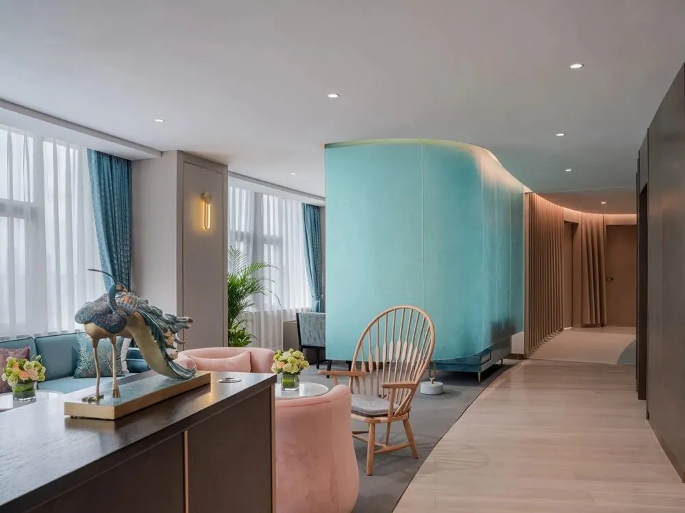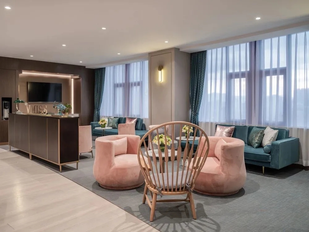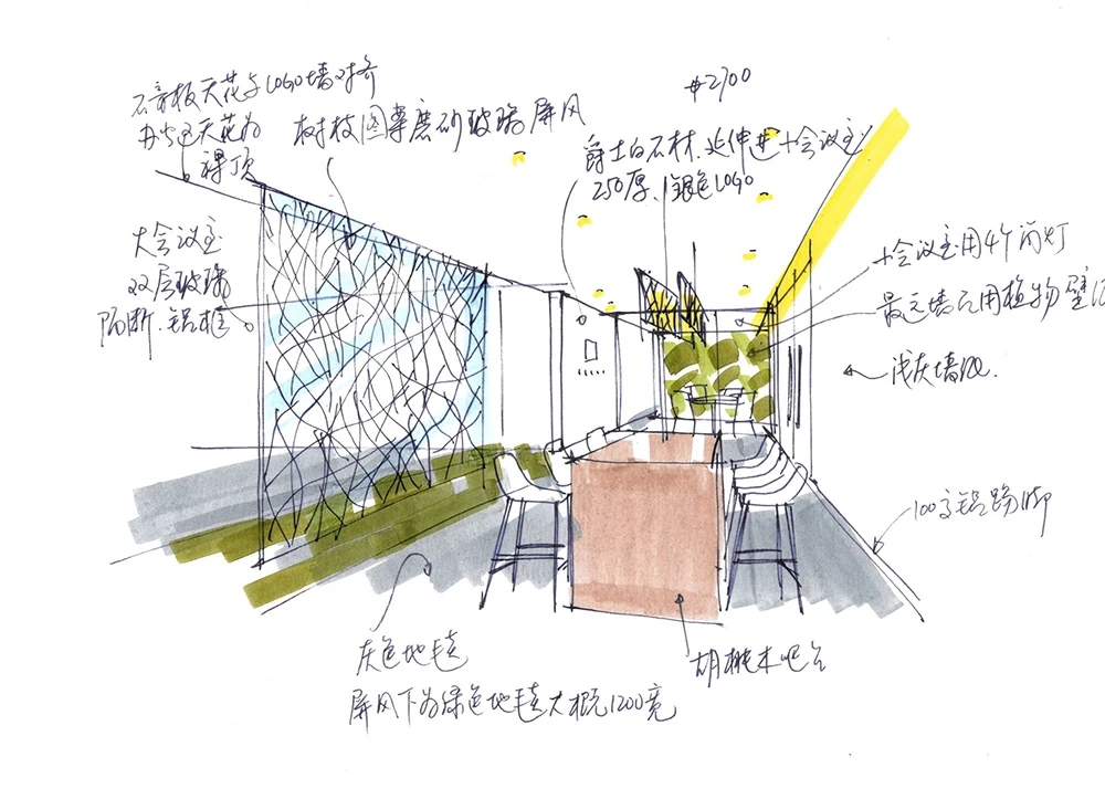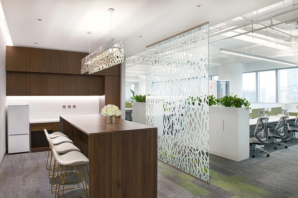 玻璃隔断隔空间却不完全隔视线,空间因此而具有了弹性和延展性,人际关系与社交在此情景中得以重塑。玻璃上的蚀刻图案和定制吊灯的图案取植物自由生长的状态经过解析重构,这种生长意向与自然雨林的壁纸巧妙映衬,形成欣欣向荣的生命力,呼应“共同成长”的概念。“设计不止是营造一个空间,更是生活发生的场所和一个精神文化的载体”。
