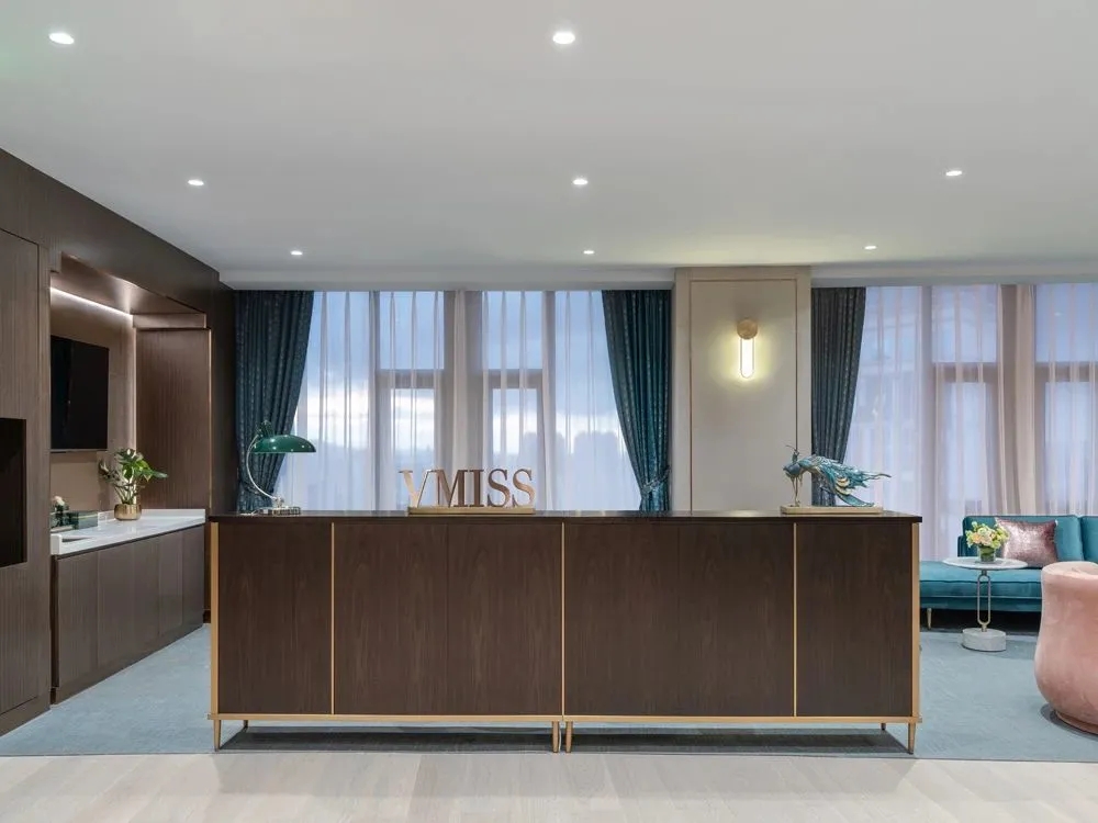 入口区域的镜面天花丰富了空间视角,弱化了二楼加建结构带来的压迫感。入口左侧用造景的手法打造了形象墙,满足接待和放置宣传册的功能需求,同时传递品牌调性,黄镜增加内部空间的神秘感和通透感。