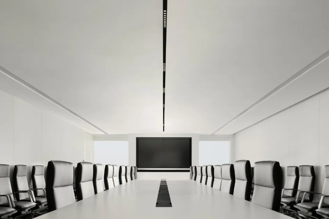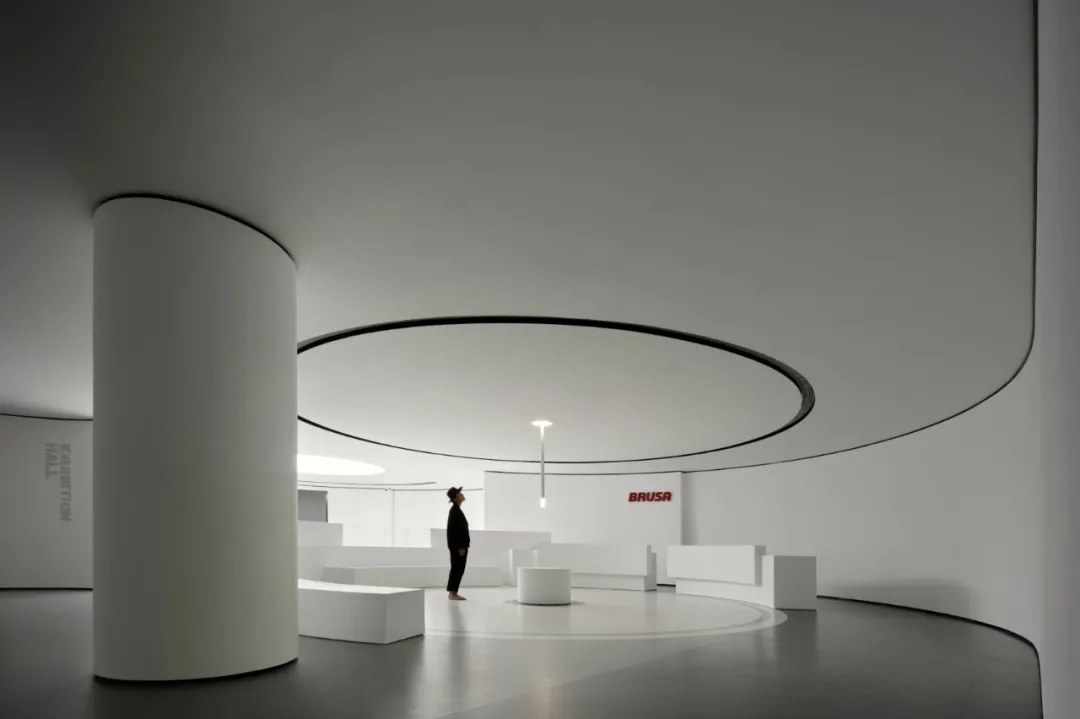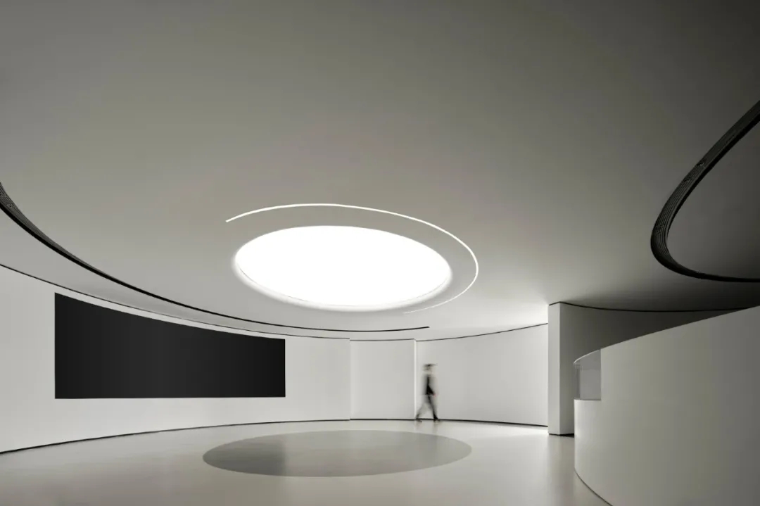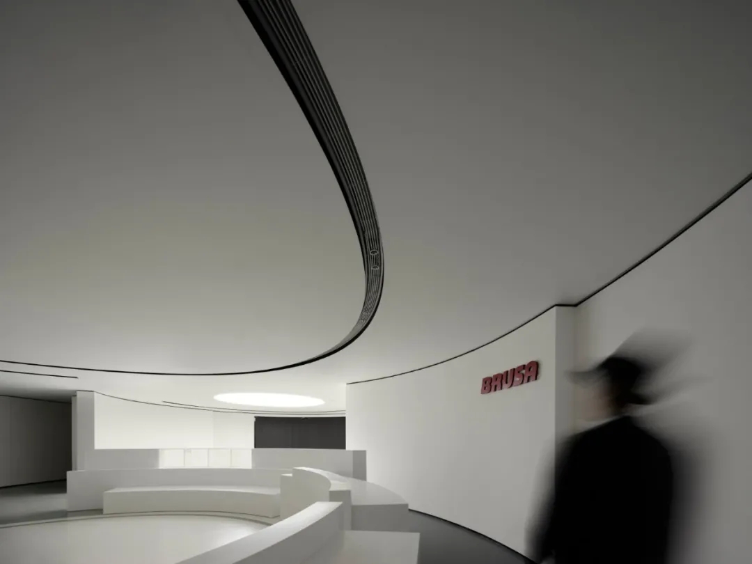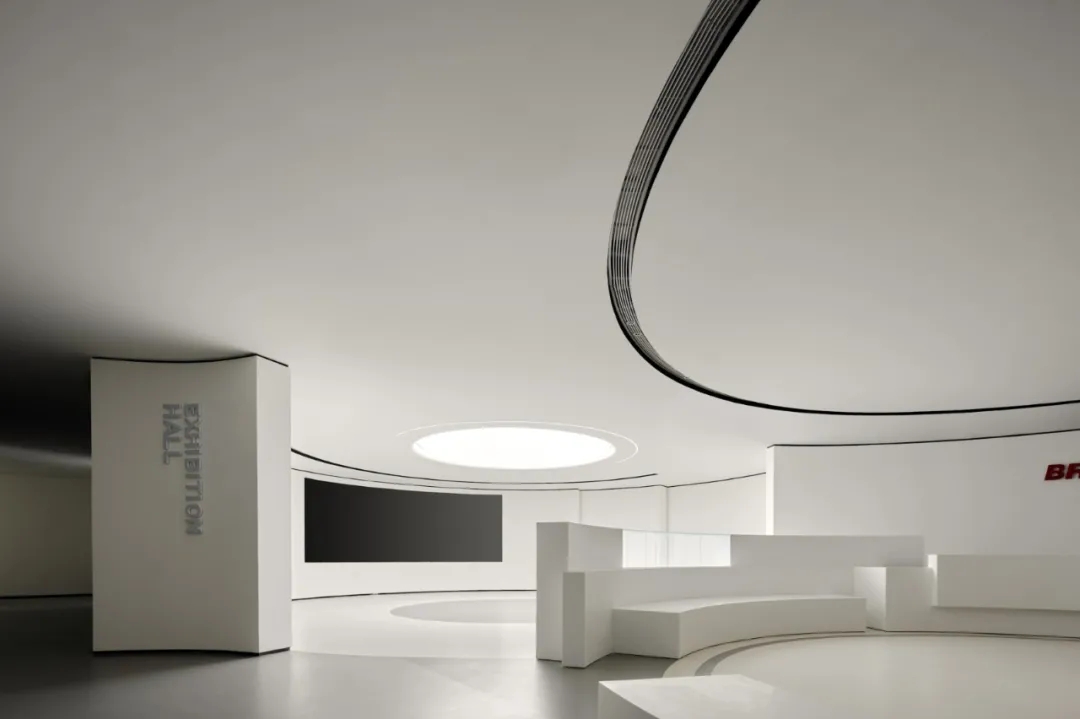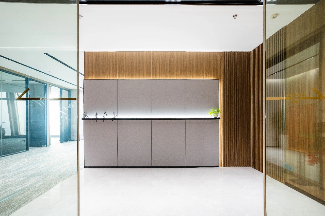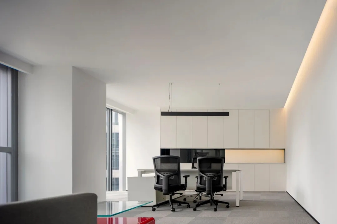 在空间营造方面,本次设计以极简留白的设计风格为路线,利用前面分析的元素推导,着重体现在前厅展厅空间,到达本楼层就能根据地面材料的分割造型引导至室内,与室内的空间造型、材质和谐衔接,再延伸至其他空间,在贯穿整个楼层的同时也兼顾了统一性。在色彩方面,只以logo的企业色红色稍加点缀,显得十分精神。