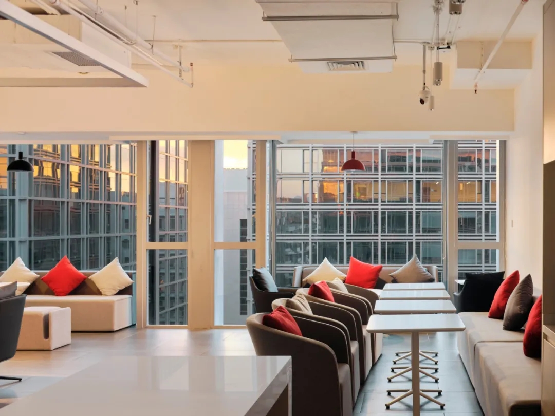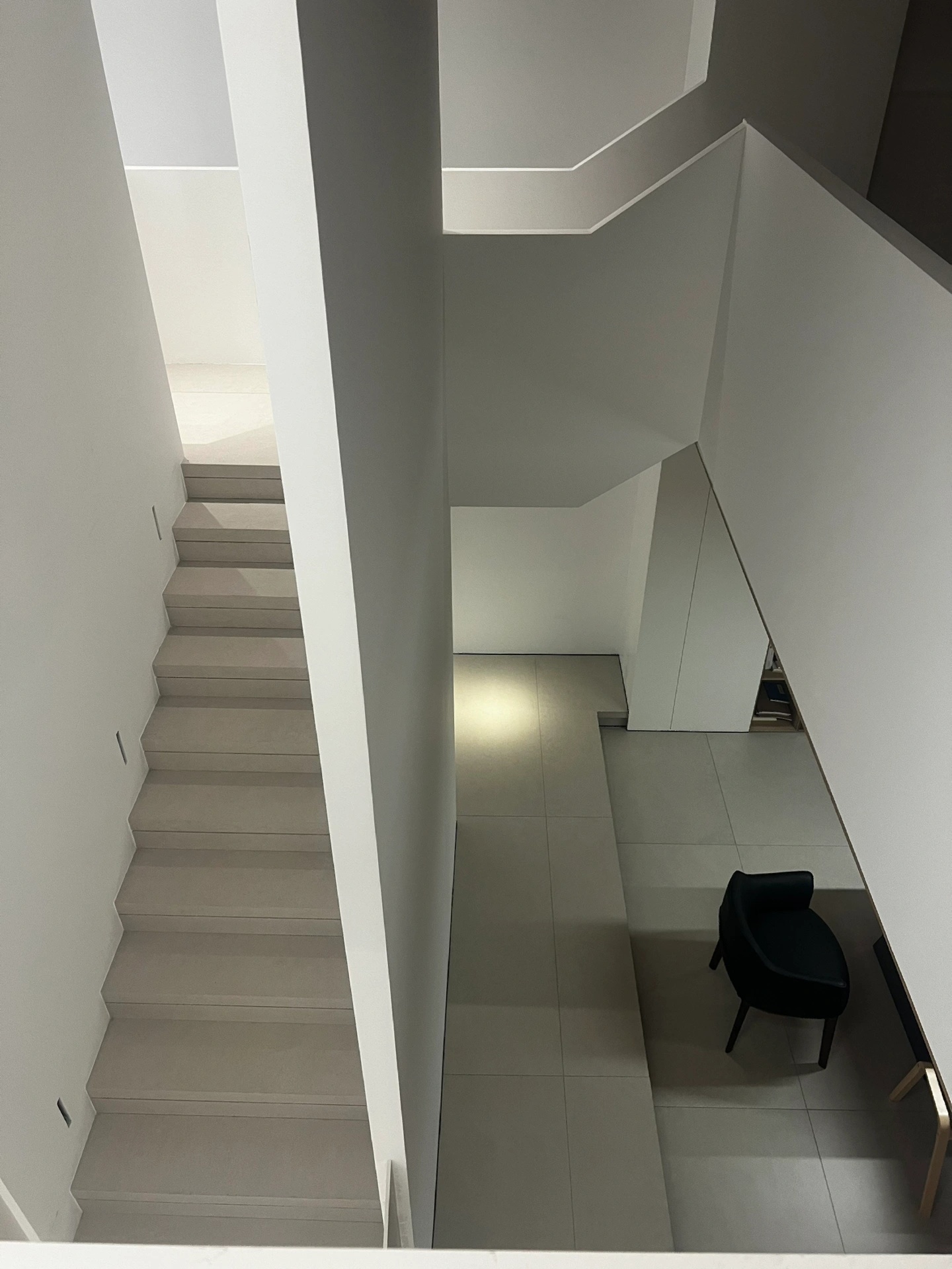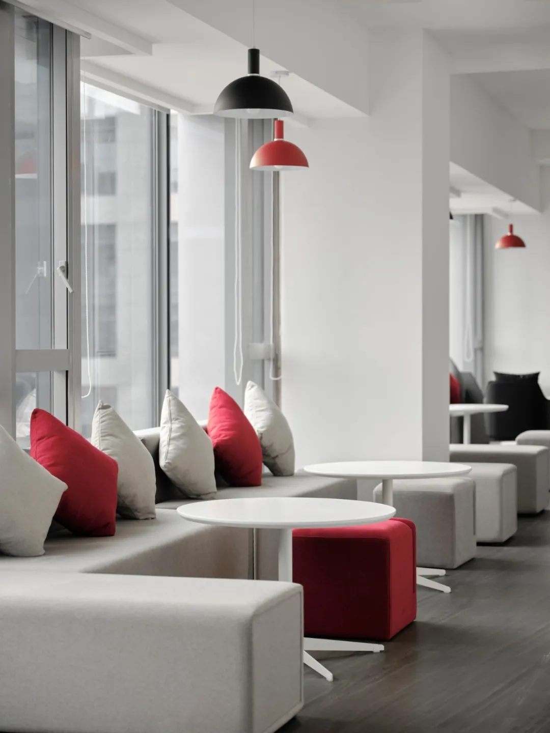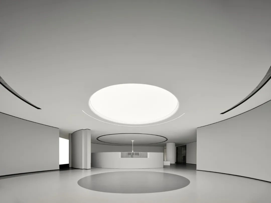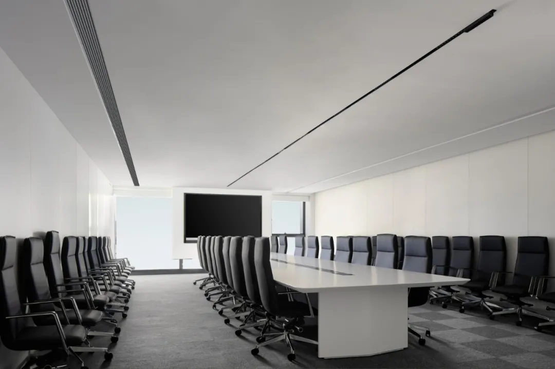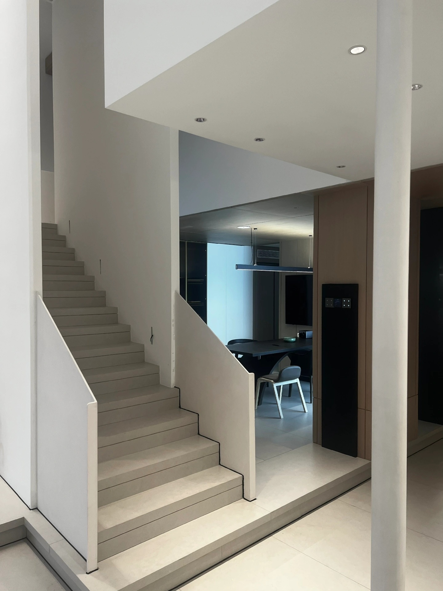 在空间营造方面,本次设计以极简留白的设计风格为路线,利用前面分析的元素推导,着重体现在前厅展厅空间,到达本楼层就能根据地面材料的分割造型引导至室内,与室内的空间造型、材质和谐衔接,再延伸至其他空间,在贯穿整个楼层的同时也兼顾了统一性。在色彩方面,只以logo的企业色红色稍加点缀,显得十分精神。