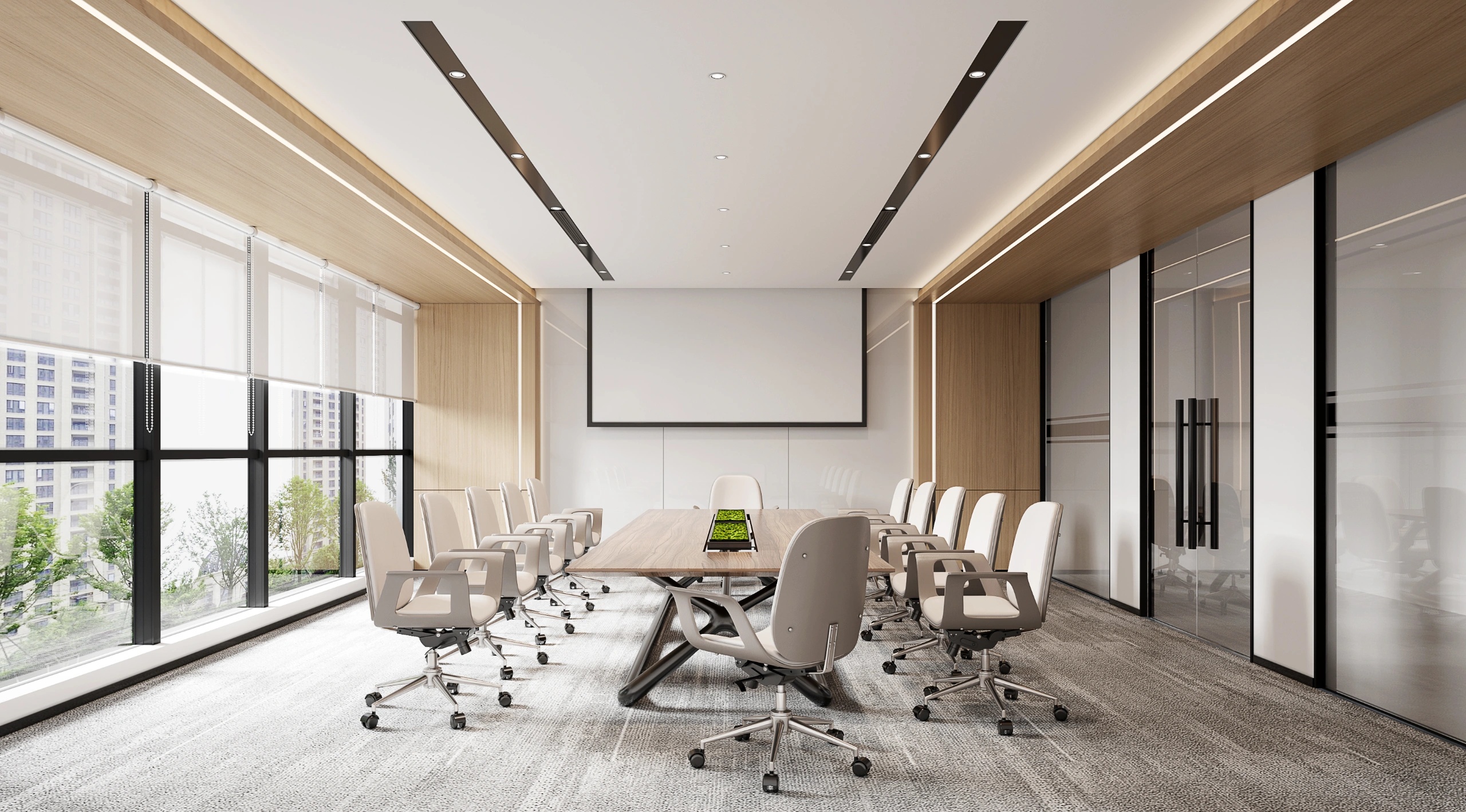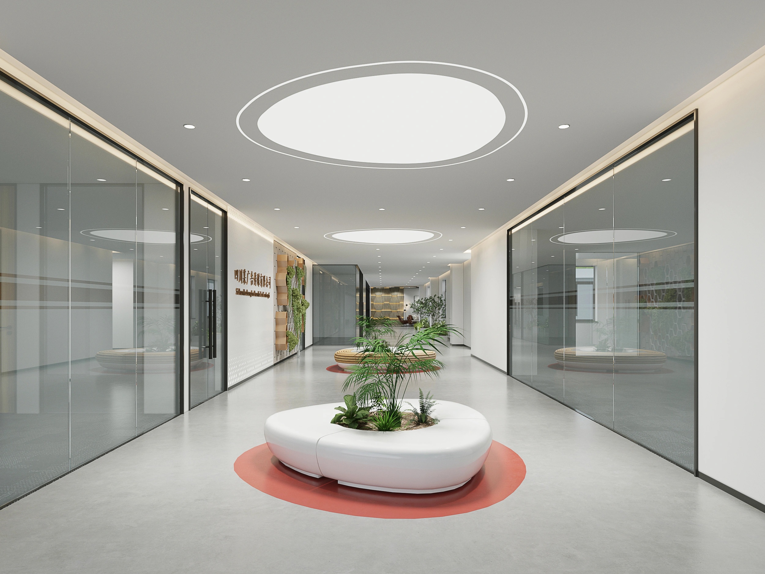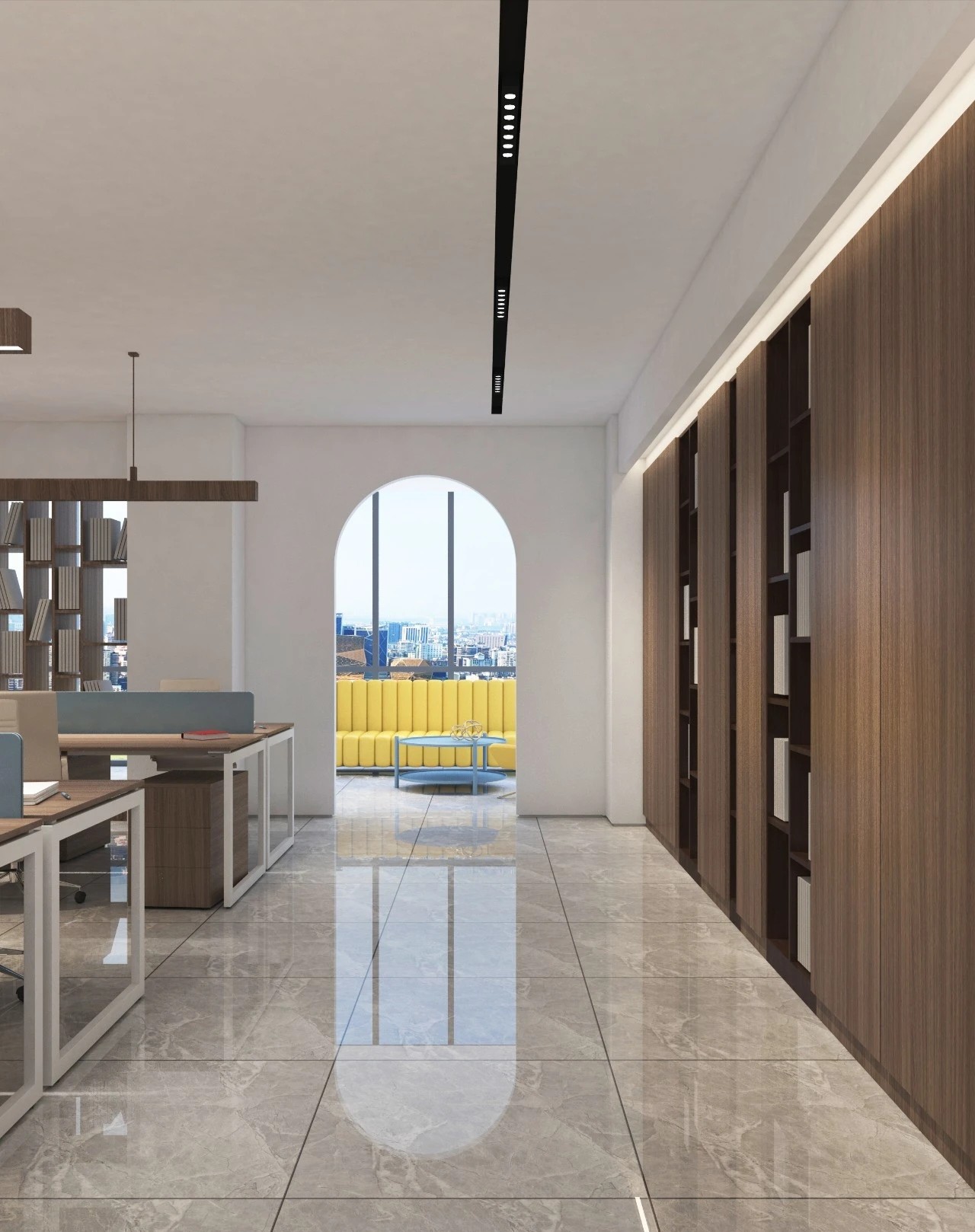 开放式的办公空间重塑传统的工作日常:开阔区域进行集中讨论,围合的空间创造偶遇与快速协作,格子会议空间以便集中精力、促发深度思考,更精准地把握高效办公的刚需与日常心理感官的平衡。墙布墙体产生的隔断感温和有力、收放自如,自然的空间形态遵循理性有序的设计法则,从而让整个空间有了延长性、艺术性,工整有序,流畅而舒适。大面积玻璃代替厚重墙体,轻薄的线条边框隐匿其中,空间与工作发生紧密而富有无尽创造力的未来。区别于一味的全开放式办公,设计师针对不同办公区的功能属性和人员特点,赋予不同场的办公环境。公共区、会议区、半开放式办公区等多元用途布局自由灵活、松紧错落,梳理多元有序的办公状态。