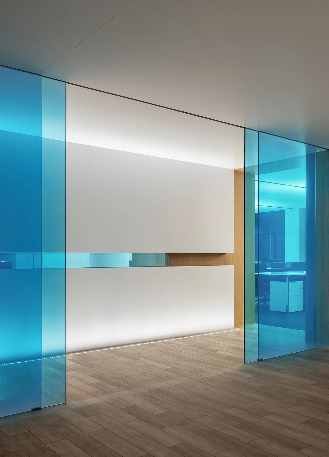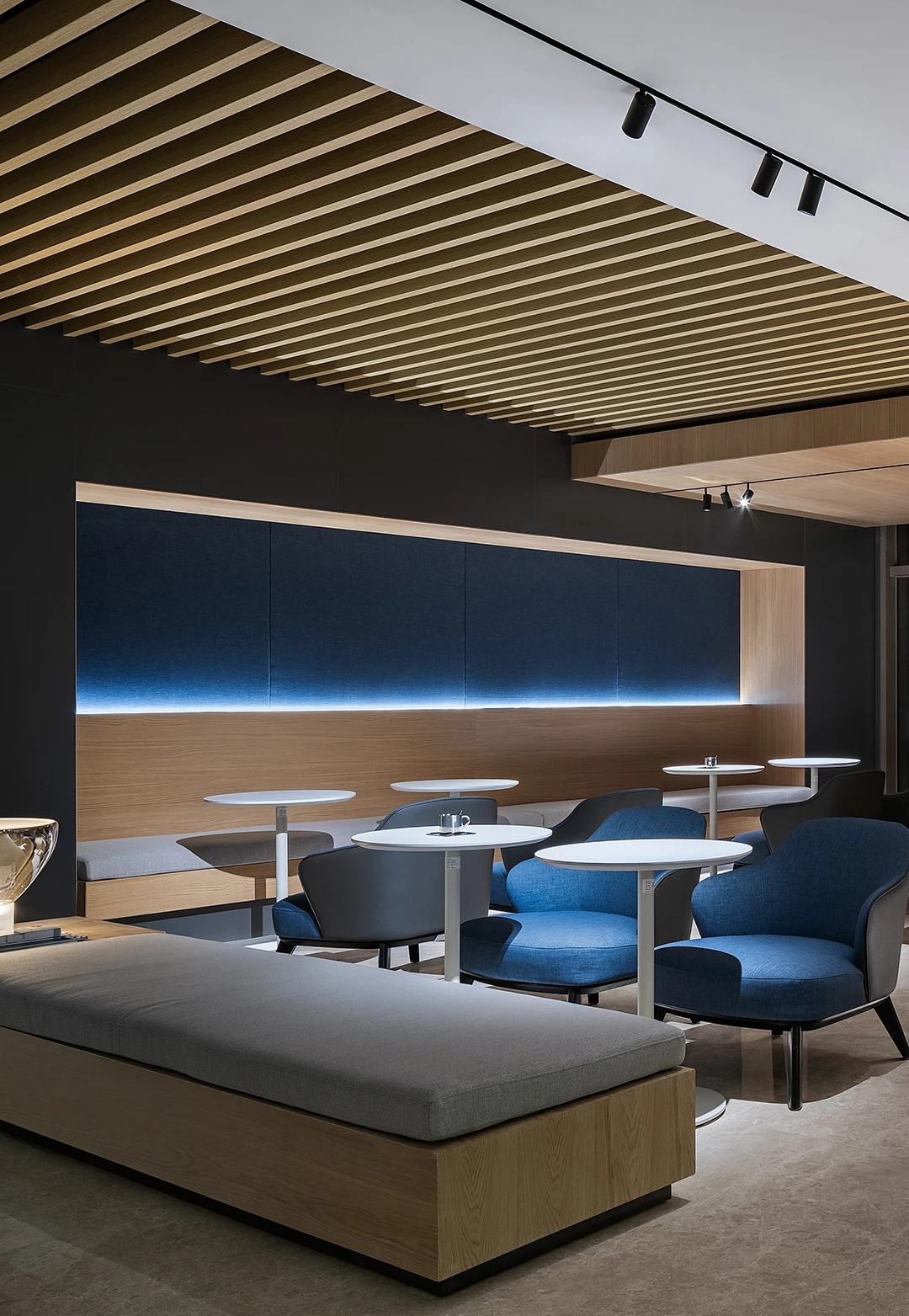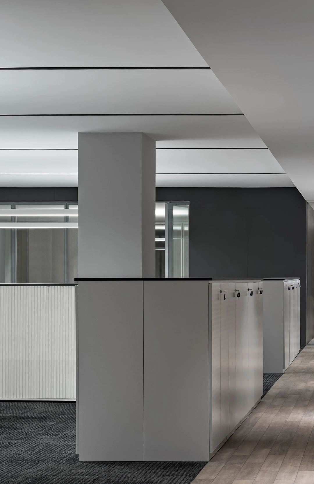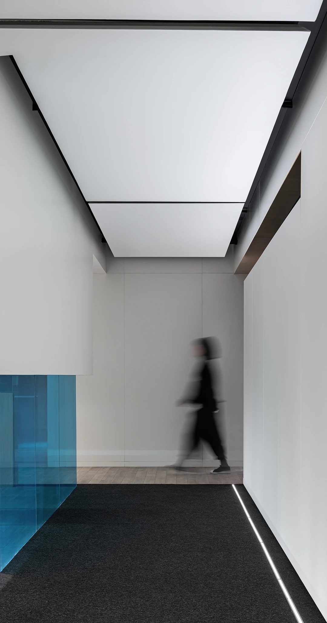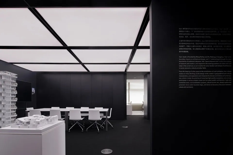 在空间上,两个区域由中部的集中功能墙体分隔,在视觉上则采用黑白两色的对比。空间和视觉分隔的错位自然形成了主走道。深色的墙面地面配合顶部的发光膜系统塑造了公共区域的纯粹气质,也更能凸显展品本身。考虑到所受光照条件的不同和材质本身的差异,墙面的乳胶漆、烤漆面以及地面的地毯都做了专门的颜色挑选,以确保呈现效果的统一。