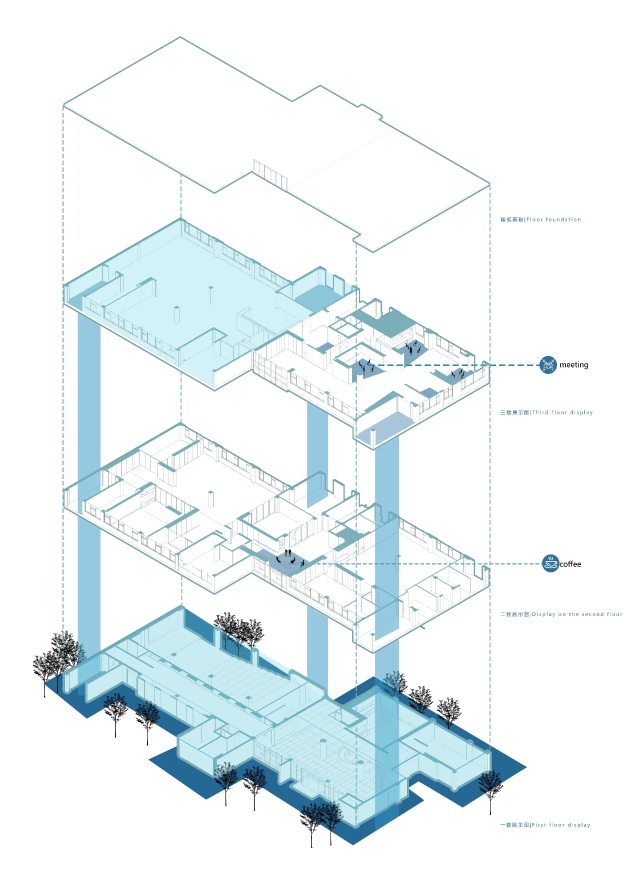 展品陈列在琉璃柜中 / 如绝妙的创意灵感在讨论和会议中迸发 / 席卷而来 / 再平铺直述 / 七八片立体化的区块 / 自行推进自己的日程 / 人类各司其职 / 也各自有各自的感悟与获得